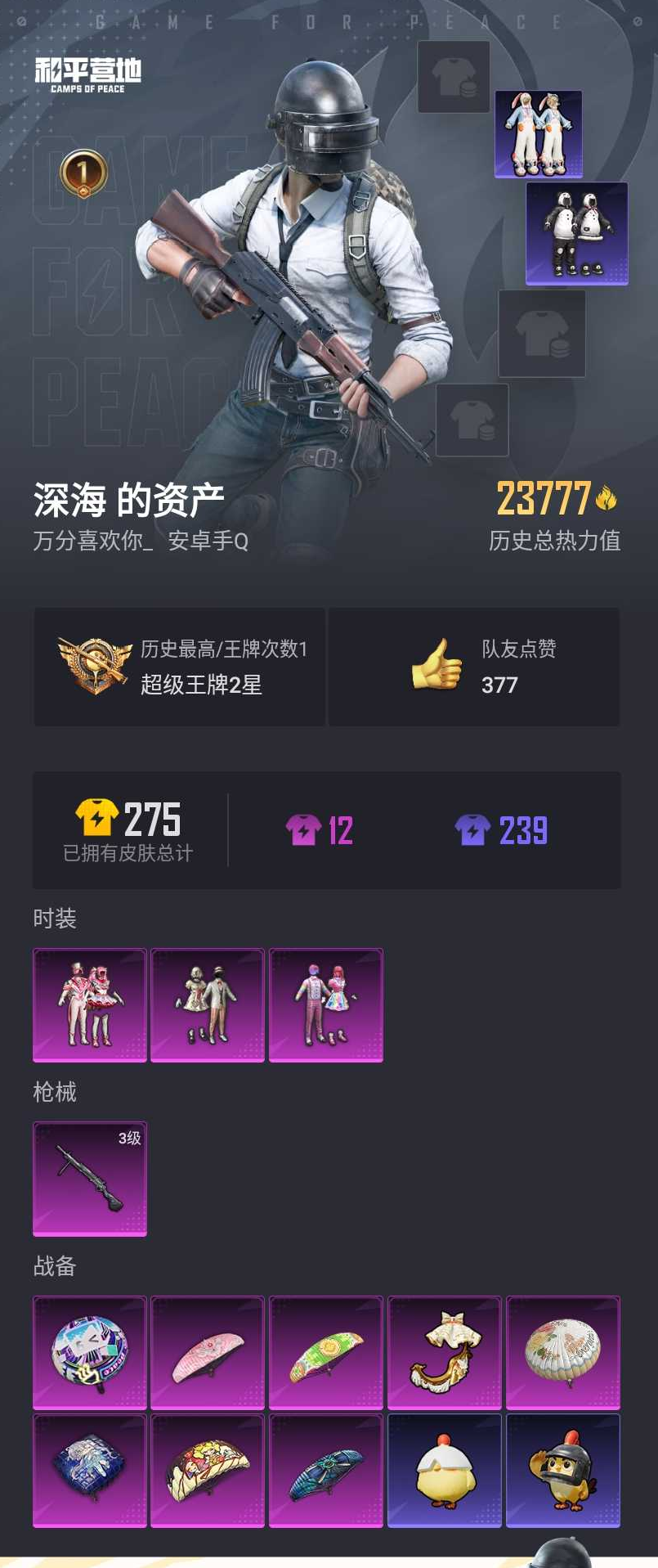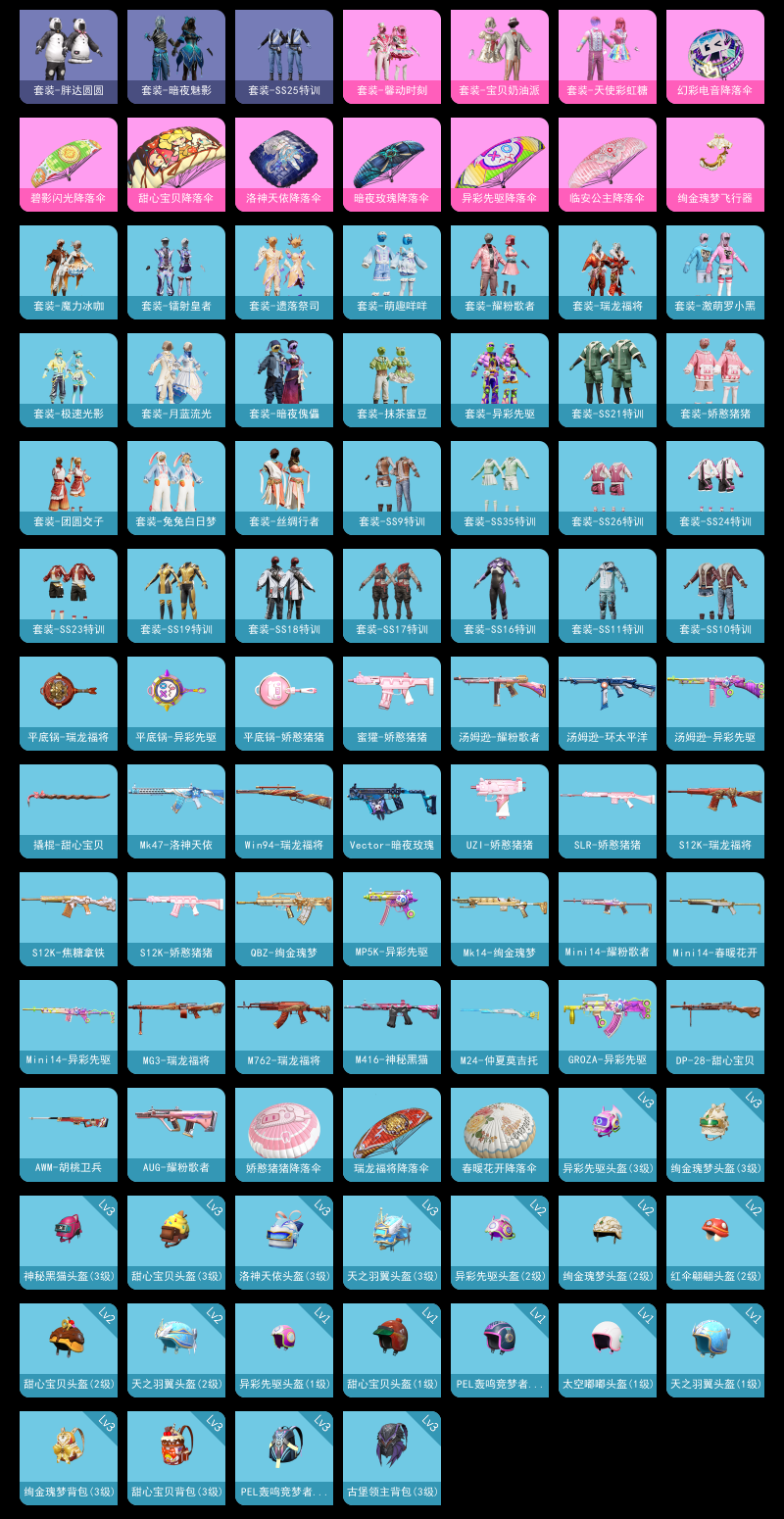 【和平精英】【lyhp19676】3粉装1特效呛 馨动时刻 胖达圆圆 兔兔白日梦 3粉装,1特效呛,0载具,历史最高段位:超级王牌2星 王牌印记1次 热力值:23777,76套装,62呛械,67装备,54战备;套装:套装-宝贝奶油派,套装-天使彩虹糖,套装-馨动时刻,套装-特训学院,套装-青年教官,套装-橘黑制服,套装-红色运动,套装-黄色运动,套装-蓝色运动,套装-黄色伏地魔,套装-白色伏地魔,套装-竞技名士,套装-深蓝色名流,套装-酒红色名流,套装-湖蓝色名流,套装-黄色名流,套装-猛禽,套装-长空猛禽,套装-蓝色守护者,套装-冷焰舞者,套装-战地菁英,套装-缤纷假日,套装-完美偶像,套装-人气偶像,套装-幻影武者,套装-街头潮人,套装-蓝彩潮人,套装-怒火燎原,套装-魅力单车,套装-绮丽涂鸦,套装-竞技达人朋克,套装-破晓战魂,套装-都市魅力,套装-酷潮明星,套装-幻世战舞者,套装-甜蜜熊情侣,套装-青涩时光,套装-胖达圆圆,套装-极速红龙,套装-破蛋小黄鸡,套装-激萌罗小黑,套装-ss10特训,套装-夏日音浪,套装-ss9特训,套装-丝绸行者,套装-抹茶蜜豆,套装-ss11特训,套装-ss18特训,套装-镭射皇者,套装-耀粉歌者,套装-ss16特训,套装-暗夜魅影,套装-暗夜傀儡,套装-ss17特训,套装-瑞龙福将,套装-团圆交子,套装-冰川谧蓝,套装-福星高照,套装-遗落祭司,套装-异彩先驱,套装-霓虹极客,套装-魔力冰咖,套装-月蓝流光,套装-ss19特训,套装-兔兔白日梦,套装-ss21特训,套装-萌趣咩咩,套装-娇憨猪猪,套装-ss23特训,套装-ss24特训,套装-ss25特训,套装-龙的传人,套装-ss26特训,套装-极速光影,套装-ss34特训,套装-ss35特训;呛皮:aug-耀粉歌者,aug-紫晶流影,m416-蓝色火焰,m416-红色方程式,m416-神秘黑猫,m416-糯团青竹,mk47-洛神天依,mk47-乌木金纹,scar-l-红色方程式,q-绚金瑰梦,q-乌木金纹,ac-val-乌木金纹,ac-val-天降萌叽,groza-异彩先驱,蜜獾-娇憨猪猪,m762-牛气冲天,m762-瑞龙福将,m762-天降萌叽,akm-彩虹符号,akm-虎虎生威,g36c-乌木金纹,awm-胡桃卫兵,kar98k-炫彩节奏,kar98k-乌木金纹,莫辛纳甘-乌木金纹,amr-乌木金纹,m24-仲夏莫吉托,m24-乌木金纹,win94-瑞龙福将,mk14-绚金瑰梦,mk14-乌木金纹,mini14-春暖花开,mini14-耀粉歌者,mini14-异彩先驱,slr-娇憨猪猪,汤姆逊-耀粉歌者,汤姆逊-异彩先驱,汤姆逊-环太平洋,汤姆逊-天降萌叽,mp5k-异彩先驱,野牛-乌木金纹,vect-生命誓言,vect-暗夜玫瑰,aks-74u-乌木金纹,uzi-炫彩节奏,uzi-娇憨猪猪,ump45-夜灯,p90-乌木金纹,s12k-瑞龙福将,s12k-焦糖拿铁,s12k-娇憨猪猪,s686-红色方程式,s686-生命誓言,3级dp-28-豹影疾电,dp-28-甜心宝贝,mg3-瑞龙福将,m249-破晓战魂,m249-彩虹符号,平底锅-瑞龙福将,平底锅-异彩先驱,平底锅-娇憨猪猪,撬棍-甜心宝贝;降落伞:绚金瑰梦飞行器; 详情看图