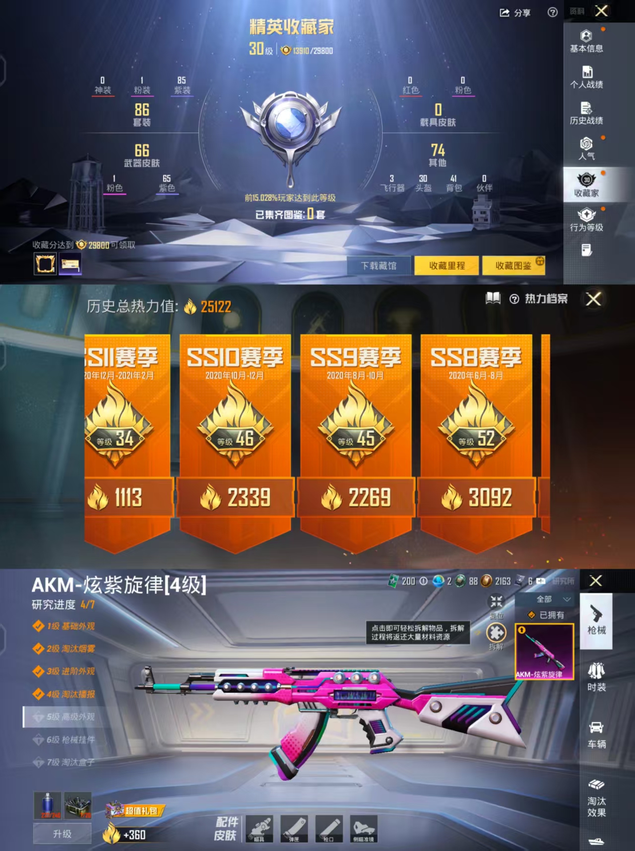 0载具-86套装-87呛皮-h12322安卓q区-1粉装-1特效呛-25122热力值-3王牌印记-86套装-87呛皮【优质套装】: 荒野猎神【特效呛等级】:akm-炫紫旋律四级akm-炫紫旋律【优质武器皮肤】: akm-炫紫旋律【稀有武器皮肤】: akm-炫紫旋律 m416-仓鼠灰灰 m416-乌木金纹 m416-蓝色