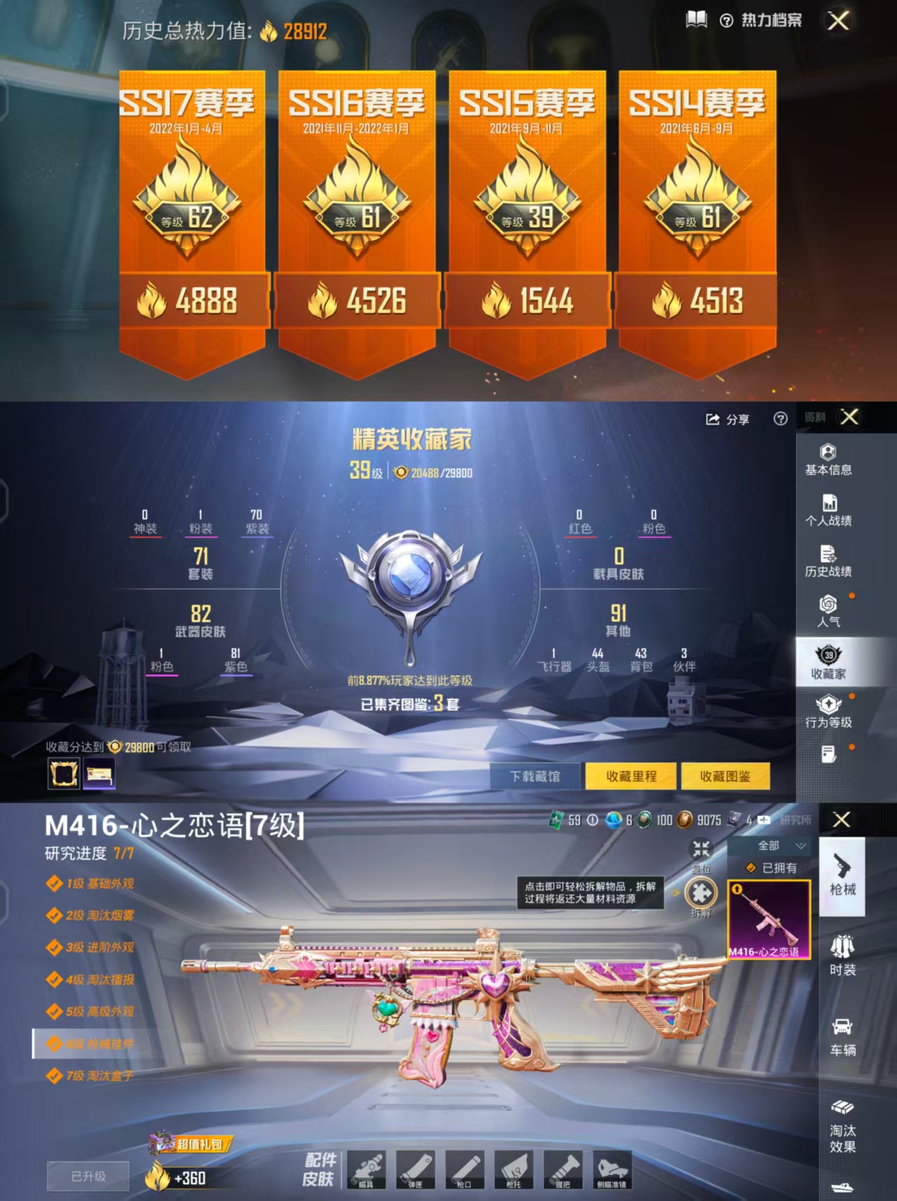 0载具-71套装-91呛皮-h12315安卓q区-1粉装-1特效呛-28912热力值-3王牌印记-71套装-91呛皮【优质套装】: 海渊国主【特效呛等级】:m416-心之恋语七级m416-心之恋语【优质武器皮肤】: m416-心之恋语【稀有武器皮肤】: m416-心之恋语 dbs-乌木金纹 mk14-冰河战士 uzi-