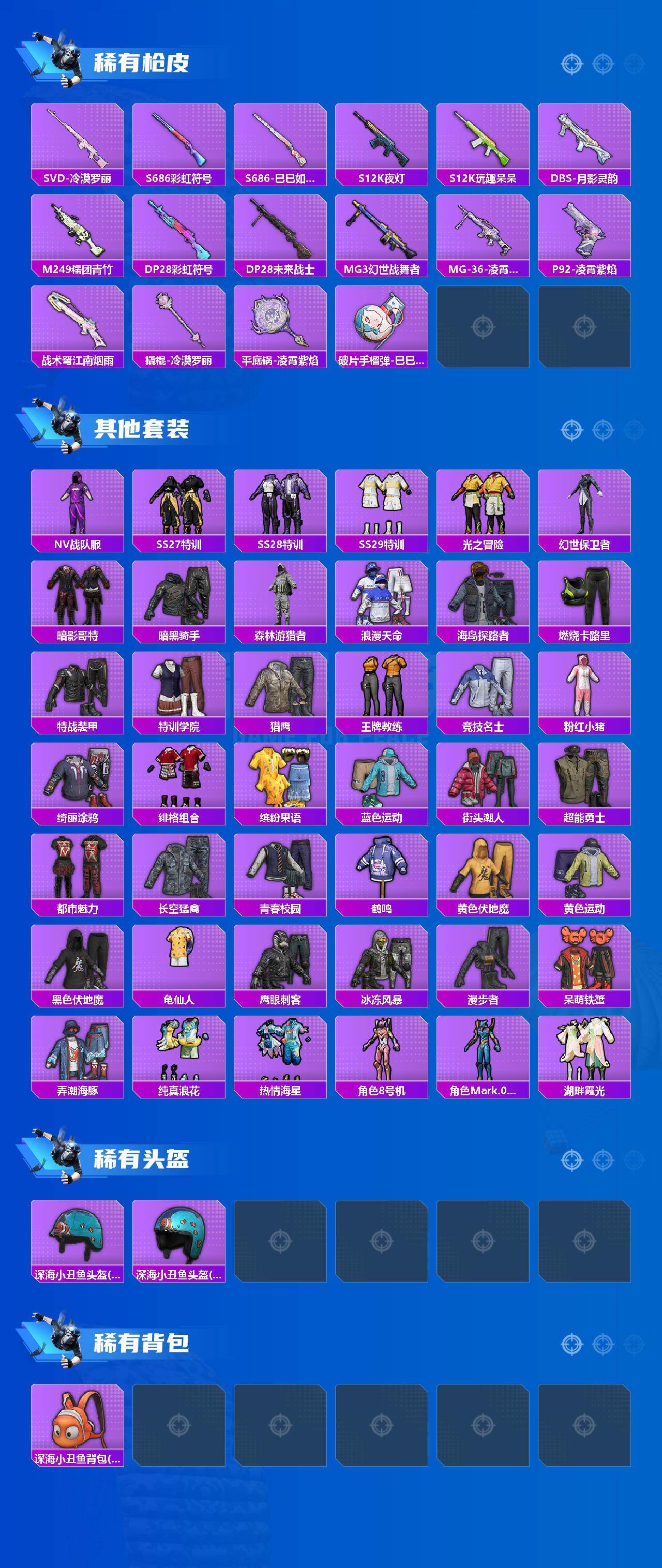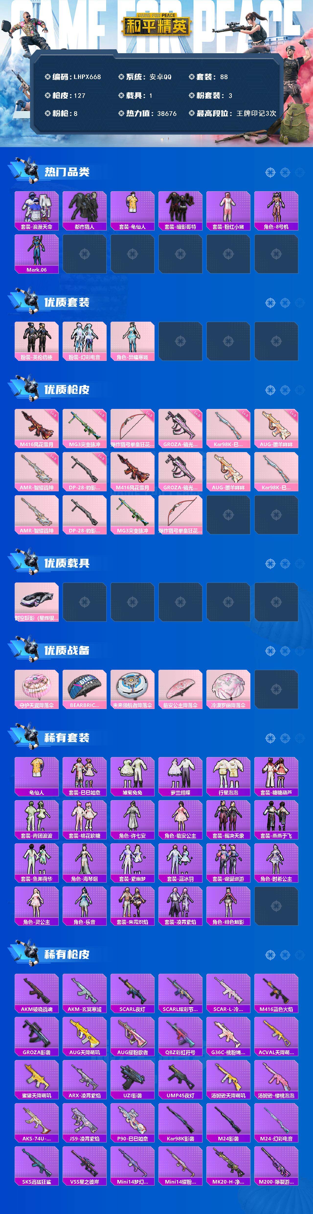 [15723511]【特价出售/店主推荐】安卓 手q-3粉装-8特效呛-1载具-1粉色飞行器-38676热力值-3王牌印记-88套装-127呛皮 【热门品类】:套装-浪漫天命,套装-都市猎人,套装-龟仙人,套装-暗影哥特,套装-粉红小猪,角色-8号机,角色-mark.06 【粉色套装】:粉装-英伦信使,粉装-幻彩电音,角色-异瞳寒姬 【粉色呛皮等级】:m416-风花雪月五级,groza-镜光银凌五级,aug-暖羊咩咩五级,kar98k-巳巳如意五级,amr-智耀战神五级,dp-28-豹影疾电五级,mg3-突变脉冲五级,爆炸猎弓-拳皇·狂花道五级 【粉色载具】:时空跃影(星辉银) 【粉色呛皮】:m416-风花雪月,groza-镜光银凌,aug-暖羊咩咩,kar98k-巳巳如意,amr-智耀战神,dp-28-豹影疾电,mg3-突变脉冲,爆炸猎弓-拳皇·狂花道 【粉色降落伞】:守护天翼降落伞,bearbrick降落伞,未来领航者降落伞,临安公主降落伞,冷漠罗丽降落伞,炫彩糖果降落伞 【稀有套装】:套装-龟仙人,套装-巳巳如意,套装-雏菊兔兔,套装-萝兰蝴蝶,套装-行星泡泡,套装-糖糖葫芦,套装-青团波波,套装-棉花软糖,角色-许七安,角色-临安公主,套装-裁决天象,套装-燕燕于飞,套装-鱼渊荷华,角色-海琴烟,套装-紫幽梦,套装-蓝冰羽,套装-诡诞巡游,角色-时希公主,角色-灵公主,角色-乐音,套装-朱霞炽焰,套装-凌霄紫焰,角色-绯色魅影,套装-炫彩糖果 【稀有呛皮】:aug-冰晶雪宝,akm-破晓战魂,akm-玄冥寒域,scar-l-夜灯,scar-l-炫彩节奏,scar-l-冷漠罗丽,m416-蓝色火焰,groza-影袭,aug-天降萌叽,aug-耀粉歌者,q-彩虹符号,g36c-桃粉嫣然,ac-val-天降萌叽,蜜獾-天降萌叽,arx-凌霄紫焰,uzi-影袭,ump45-夜灯,汤姆逊-天降萌叽,汤姆逊-樱桃泡泡,aks-74u-鬼刀,js9-凌霄紫焰,p90-巳巳如意,kar98k-影袭,m24-影袭,m24-幻彩电音,sks-迅猛狂鲨,vss-星之彼岸,mini14-梦幻火箭,mini14-耀粉歌者,mk20-h-净心行者,m200-爆裂游戏,svd-冷漠罗丽,s686-彩虹符号,s686-巳巳如意,s12k-玩趣呆呆,s12k-夜灯,dbs-