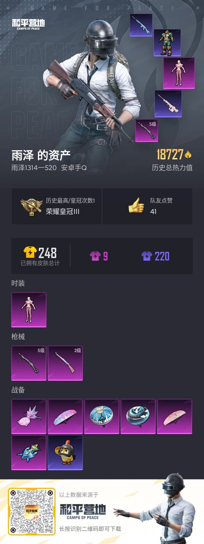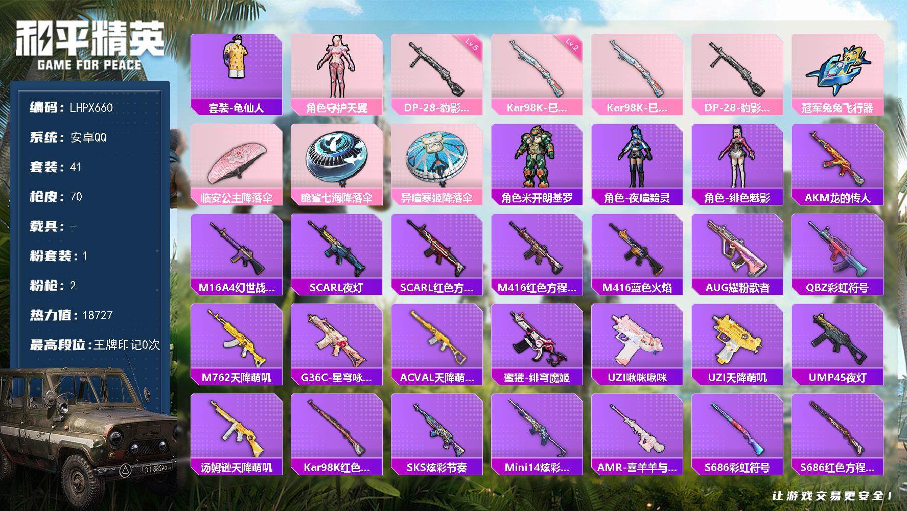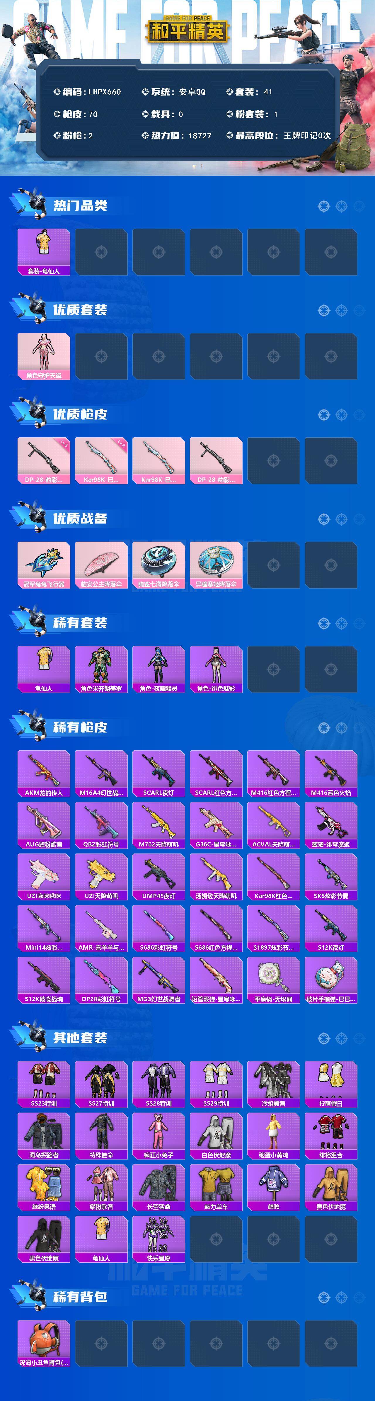 [15723547]【特价出售/店主推荐】安卓 手q-1粉装-2特效呛-0载具-2粉色飞行器-18727热力值-1王牌印记-41套装-70呛皮 【热门品类】:套装-龟仙人 【粉色套装】:角色-守护天翼 【粉色呛皮等级】:kar98k-巳巳如意二级,dp-28-豹影疾电五级 【粉色呛皮】:kar98k-巳巳如意,dp-28-豹影疾电 【粉色飞行器】:冠军兔兔飞行器 【粉色降落伞】:临安公主降落伞,脆鲨七海降落伞,异瞳寒姬降落伞,炫彩糖果降落伞 【稀有套装】:套装-龟仙人,套装-雪国风尚,角色-米开朗基罗,角色-夜瞳黯灵,角色-绯色魅影 【稀有呛皮】:akm-龙的传人,m16a4-幻世战舞者,scar-l-夜灯,scar-l-红色方程式,m416-红色方程式,m416-蓝色火焰,aug-耀粉歌者,q-彩虹符号,m762-天降萌叽,g36c-星穹咏叹调,ac-val-天降萌叽,蜜獾-绯穹魔姬,uzi-啾咪啾咪,uzi-天降萌叽,ump45-夜灯,汤姆逊-天降萌叽,kar98k-红色方程式,sks-炫彩节奏,mini14-炫彩节奏,amr-喜羊羊与灰太狼,s686-彩虹符号,s686-红色方程式,s1897-炫彩节奏,s12k-破晓战魂,s12k-夜灯,dp-28-彩虹符号,mg3-幻世战舞者,短管霰弹-星穹咏叹调,平底锅-无垠阁,破片手留单-巳巳如意 【其他套装】:套装-ss23特训,套装-ss27特训,套装-ss28特训,套装-ss29特训,套装-冷焰舞者,套装-柠萌假日,套装-海岛探路者,套装-特殊使命,套装-疯狂小兔子,套装-白色伏地魔,套装-破蛋小黄鸡,套装-绯格组合,套装-缤纷果语,套装-耀粉歌者,套装-长空猛禽,套装-魅力单车,套装-鹤鸣,套装-黄色伏地魔,套装-黑色伏地魔,套装-龟仙人,套装-快乐星愿 【稀有背包】:深海小丑鱼背包2级 【营地id】:994609863