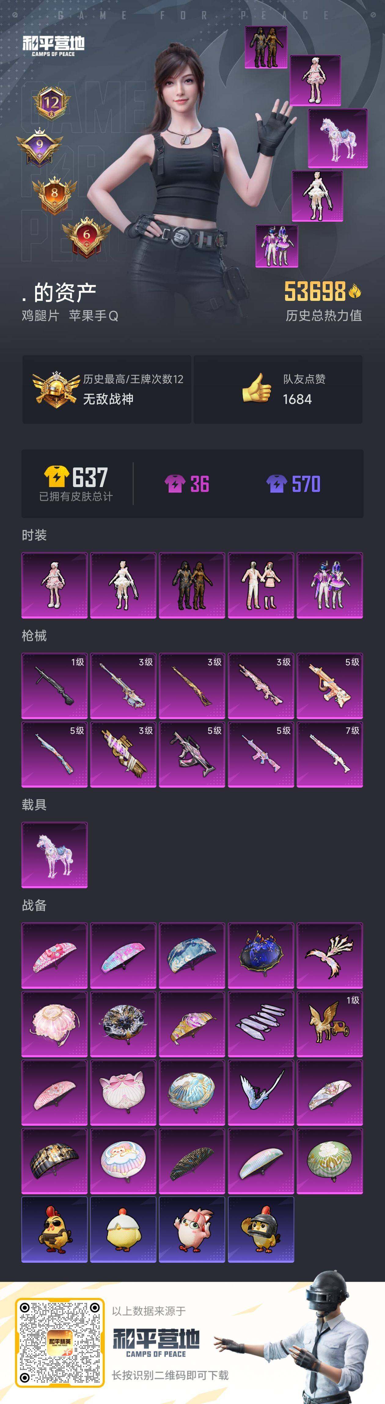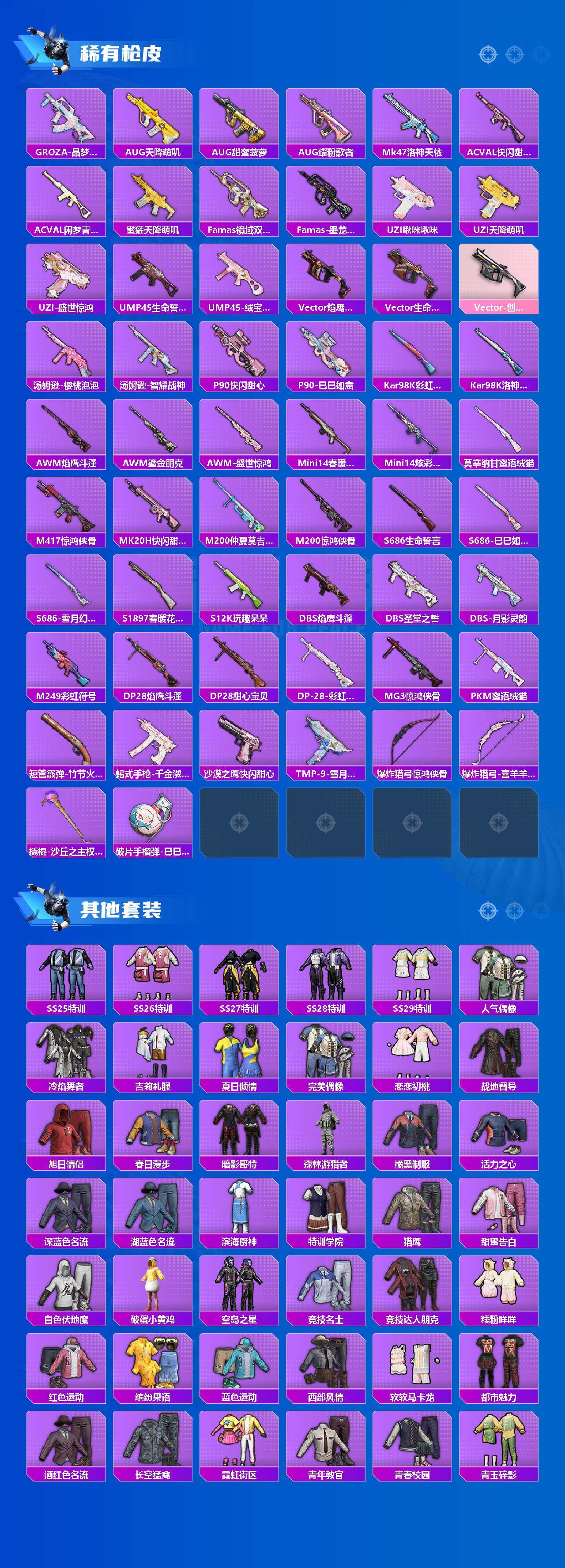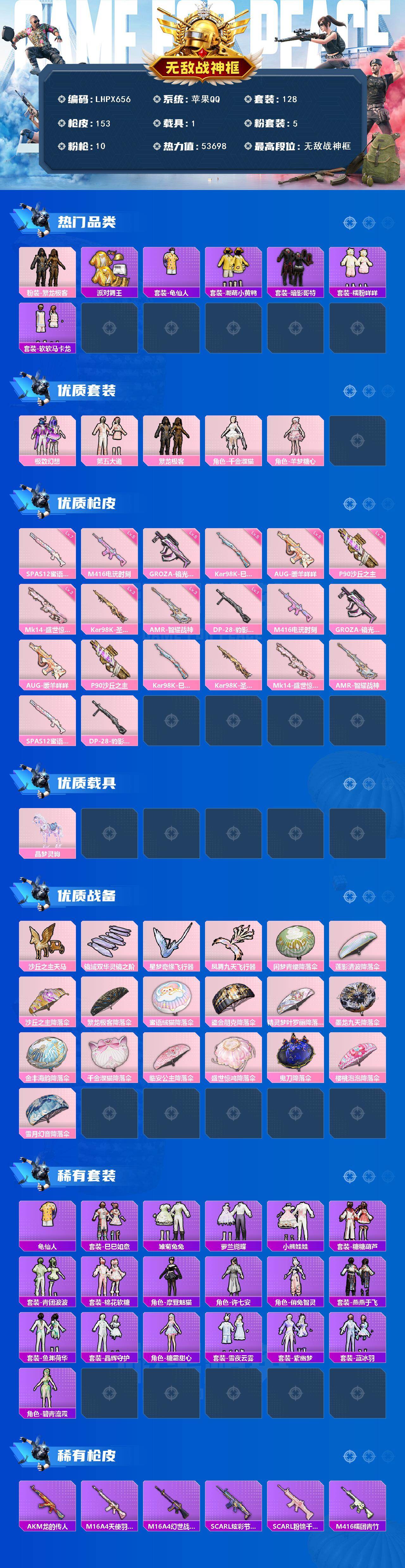 [15723563]【特价出售/店主推荐】苹果 手q-无敌战神框-5粉装-10特效呛-1载具-4粉色飞行器-5.3w热力值-12王牌印记-128套装-153呛皮 【热门品类】:粉装-繁龙极客,套装-派对舞王,套装-龟仙人,套装-潮萌小黄鸭,套装-暗影哥特,套装-糯粉咩咩,套装-软软马卡龙 【粉色套装】:粉装-极致幻想,粉装-第五大道,粉装-繁龙极客,角色-千金淑猫,角色-羊梦糖心 【粉色呛皮等级】:m416-电玩时刻五级,groza-镜光银凌五级,aug-暖羊咩咩五级,p90-沙丘之主三级,kar98k-巳巳如意五级,kar98k-圣域龙灵三级,mk14-盛世惊鸿三级,amr-智耀战神三级,spas-12-蜜语绒猫七级,dp-28-豹影疾电一级 【粉色载具】:晶梦灵驹 【粉色呛皮】:m416-电玩时刻,groza-镜光银凌,aug-暖羊咩咩,p90-沙丘之主,kar98k-巳巳如意,kar98k-圣域龙灵,mk14-盛世惊鸿,amr-智耀战神,spas-12-蜜语绒猫,dp-28-豹影疾电 【粉色飞行器】:沙丘之主天马,镜域双华-灵镜之阶,星梦奇缘飞行器,凤舞九天飞行器 【粉色降落伞】:闲梦青缨降落伞,莲影清波降落伞,沙丘之主降落伞,繁龙极客降落伞,蜜语绒猫降落伞,鎏金朋克降落伞,精灵梦叶罗丽降落伞,墨龙九天降落伞,金丰海韵降落伞,千金淑猫降落伞,临安公主降落伞,盛世惊鸿降落伞,鬼刀降落伞,樱桃泡泡降落伞,雪月幻音降落伞,炫彩糖果降落伞 【稀有套装】:套装-龟仙人,套装-巳巳如意,套装-雪国风尚,套装-雏菊兔兔,套装-萝兰蝴蝶,套装-小熊娃娃,套装-糖糖葫芦,套装-青团波波,套装-棉花软糖,角色-摩登魅猫,角色-许七安,角色-俏兔智灵,套装-燕燕于飞,套装-鱼渊荷华,套装-晶辉守护,角色-糖霜甜心,套装-雪夜云雾,套装-紫幽梦,套装-蓝冰羽,角色-碧青流霞 【稀有呛皮】:akm-龙的传人,m16a4-天使羽翼,m16a4-幻世战舞者,scar-l-炫彩节奏,scar-l-粉锦千层,m416-糯团青竹,groza-晶梦幻蝶,aug-天降萌叽,aug-甜蜜菠萝,aug-耀粉歌者,mk47-洛神天依,ac-val-快闪甜心,ac-val-闲梦青缨,蜜獾-天降萌叽,famas-镜域双华,famas-墨龙九天,uzi-啾咪啾咪,uzi-天降萌叽,uzi-