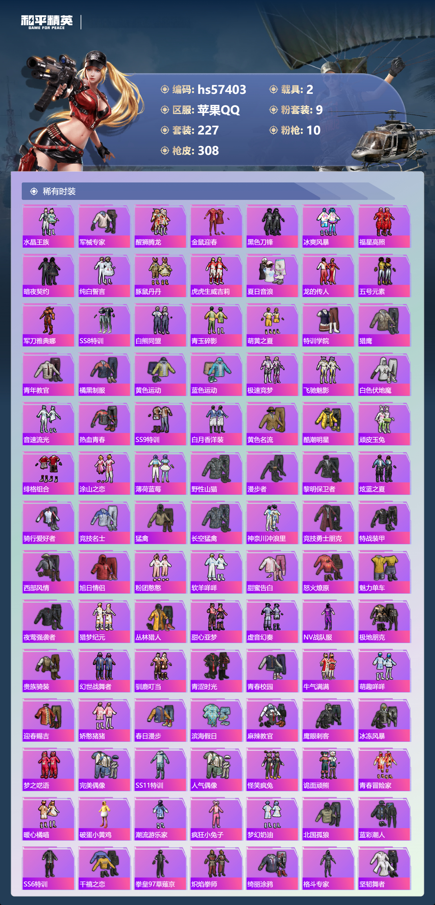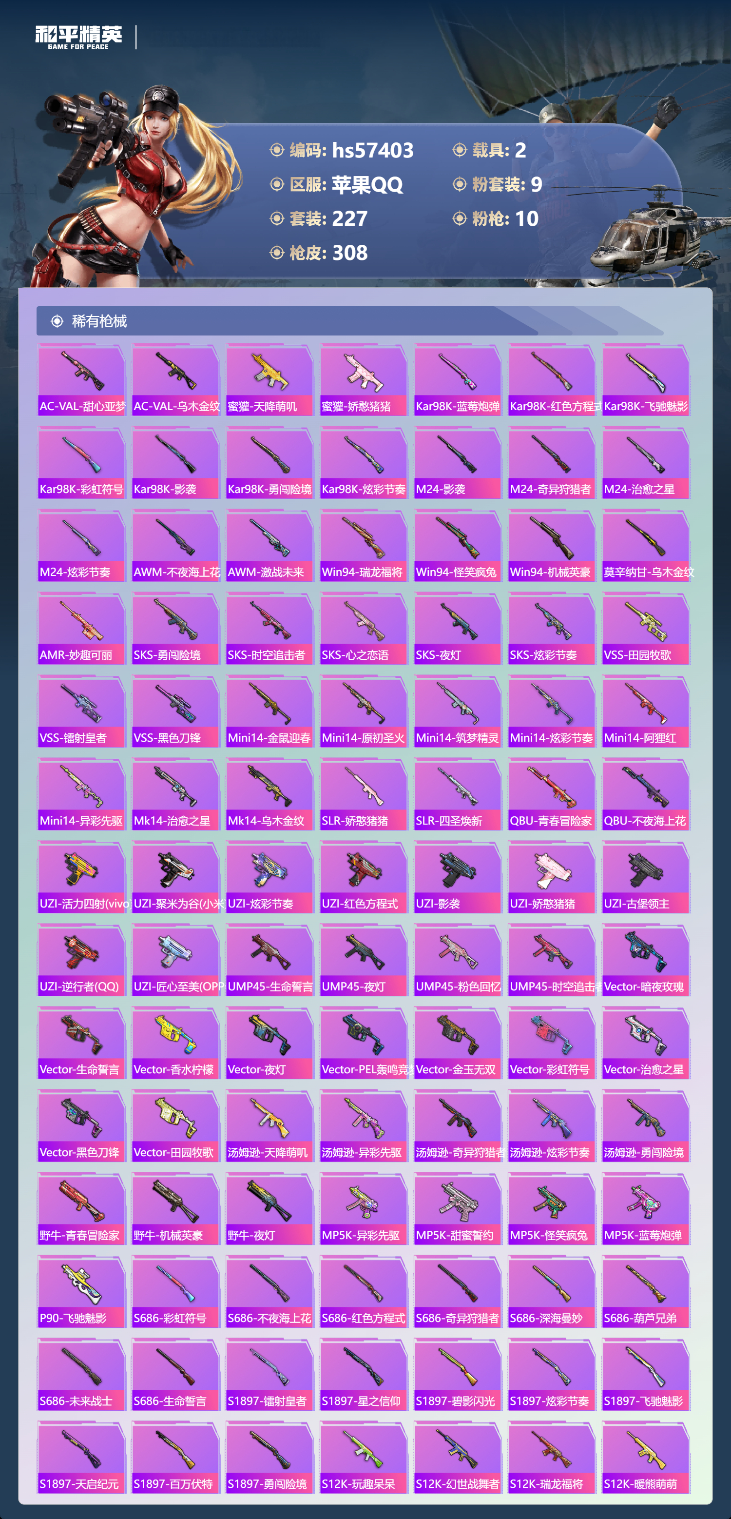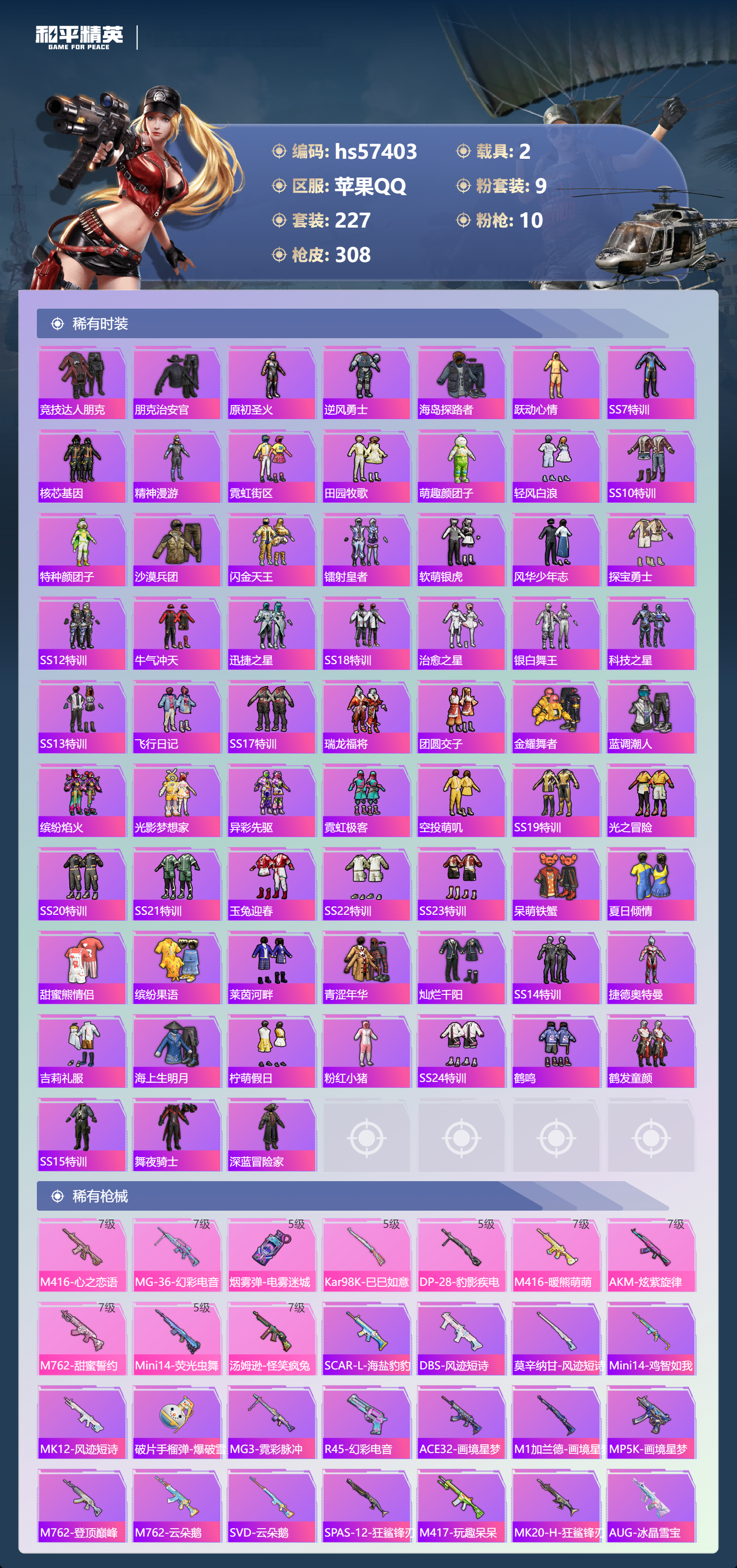 hs57403 苹果手q-26王牌印记-有战神框-9粉装-10特效呛-2载具-热力值-227套装-308呛皮-8卓越印记-6传奇印记【9粉装】套装-葫芦兄弟角色-异瞳寒姬套装-橘柚倾心套装-海盐物语套装-飒粉甜心套装-幻彩马卡龙套装-宝贝奶油派套装-梦幻火箭套装-星之彼岸【10特效呛】m416-心之恋语/7级m416-暖熊萌萌/7级mg-36-幻彩电音/7级汤