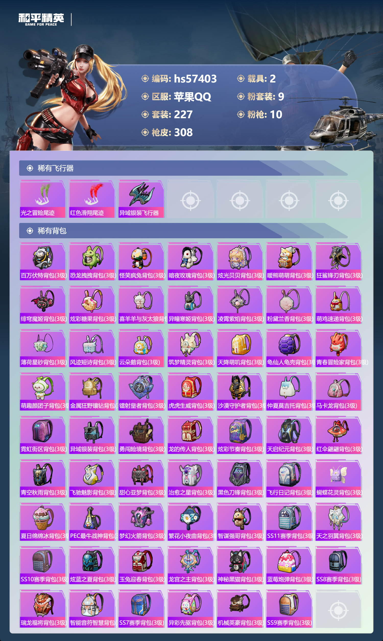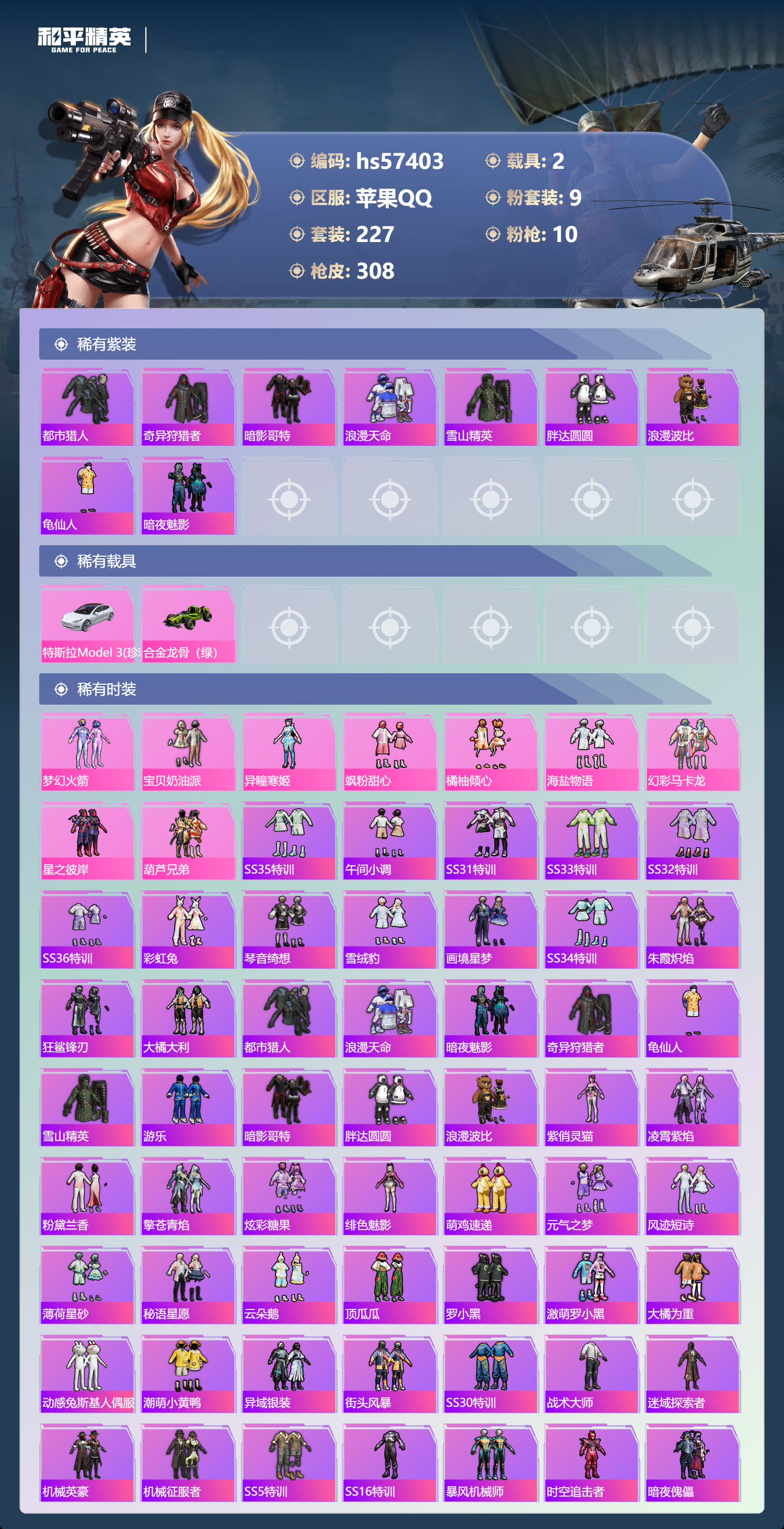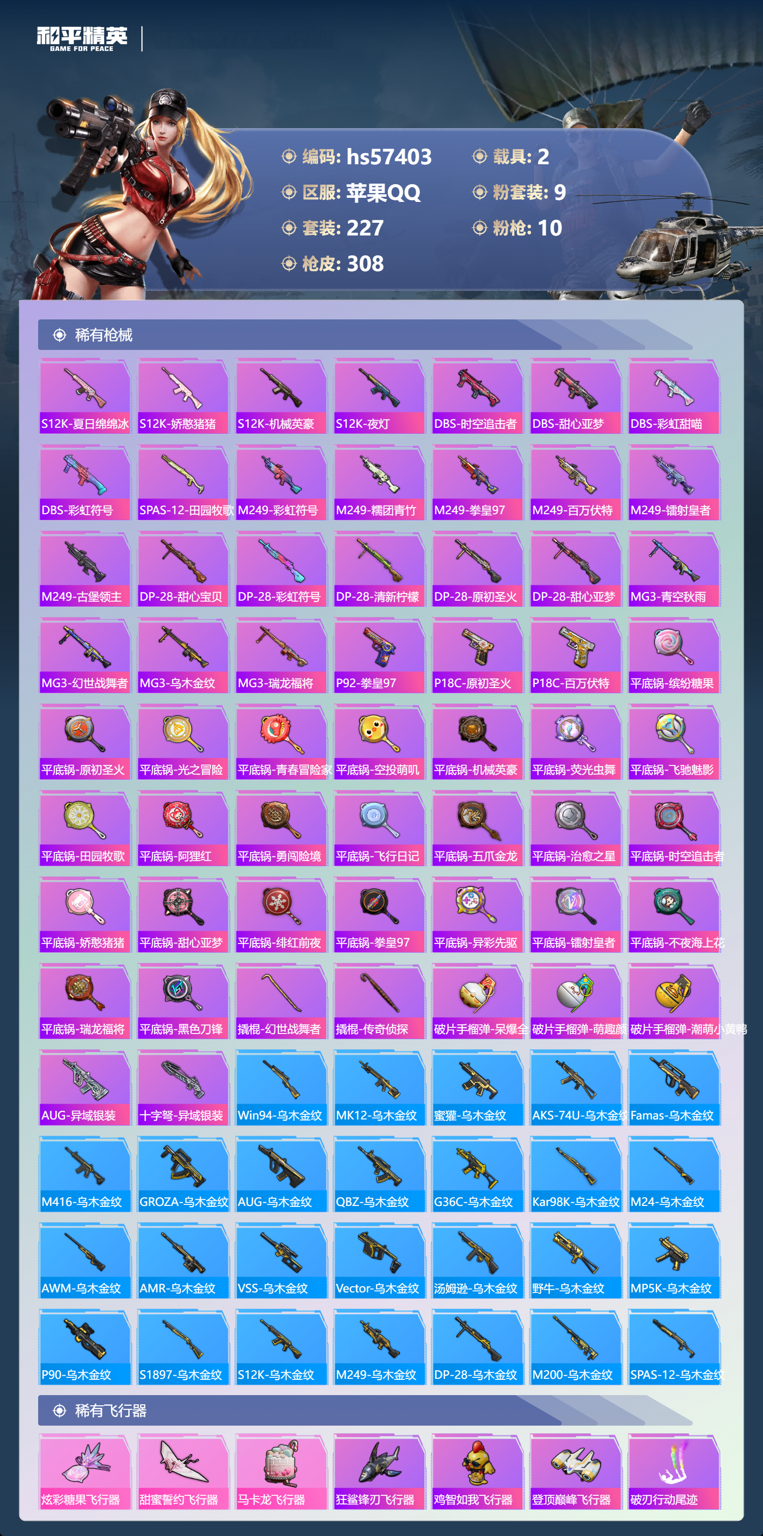 hs57403 苹果手q-26王牌印记-有战神框-9粉装-10特效呛-2载具-热力值-227套装-308呛皮-8卓越印记-6传奇印记【9粉装】套装-葫芦兄弟角色-异瞳寒姬套装-橘柚倾心套装-海盐物语套装-飒粉甜心套装-幻彩马卡龙套装-宝贝奶油派套装-梦幻火箭套装-星之彼岸【10特效呛】m416-心之恋语/7级m416-暖熊萌萌/7级mg-36-幻彩电音/7级汤