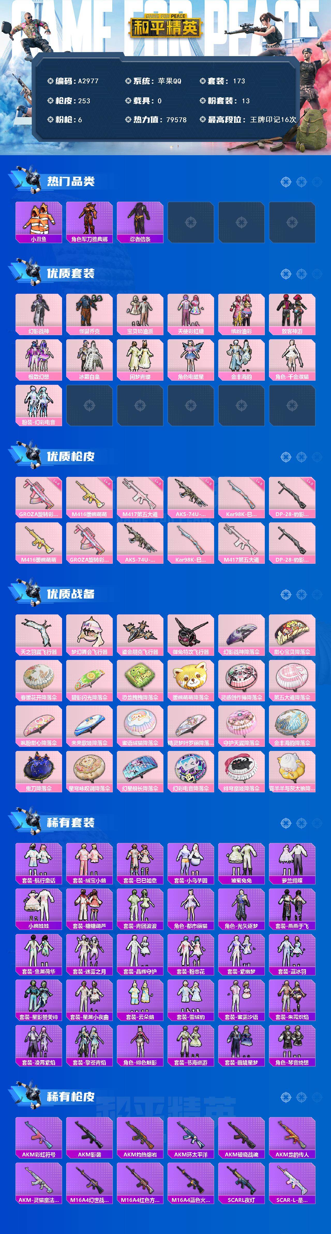 [15450928]苹果【男神号 粉装-幻影战神/粉装-怪诞乔克/m416-暖熊萌萌/groza-旋转彩虹/天之羽翼飞行器】 手q-13粉装-6特效呛-0载具-4粉色飞行器-79578热力值-16王牌印记-173套装-253呛皮 【热门品类】:粉装-怪诞乔克,粉装-缤纷油彩,套装-浪漫天命,套装-小丑鱼,角色-军刀雅典娜,套装-忍者信条,套装-龟仙人,套装-暗影哥特 【粉色套装】:粉装-幻影战神,粉装-怪诞乔克,粉装-宝贝奶油派,粉装-天使彩虹糖,粉装-缤纷油彩,粉装-放客神游,粉装-极致幻想,粉装-冰霜白皇,粉装-闲梦青缨,角色-电磁星,粉装-金丰海韵,角色-千金淑猫,粉装-幻彩电音 【粉色呛皮等级】:m416-暖熊萌萌六级,groza-旋转彩虹六级,aks-74u-信仰神谕五级,kar98k-巳巳如意五级,m417-第五大道五级,dp-28-豹影疾电五级 【粉色呛皮】:m416-暖熊萌萌,groza-旋转彩虹,aks-74u-信仰神谕,kar98k-巳巳如意,m417-第五大道,dp-28-豹影疾电 【粉色飞行器】:天之羽翼飞行器,梦幻舞会飞行器,鎏金朋克飞行器,御兔特攻飞行器 【粉色降落伞】:幻影战神降落伞,甜心宝贝降落伞,春暖花开降落伞,碧影闪光降落伞,恐龙拽拽降落伞,暖熊萌萌降落伞,灵感创作师降落伞,第五大道降落伞,飒粉甜心降落伞,未来歌姬降落伞,蜜语绒猫降落伞,精灵梦叶罗丽降落伞,守护天翼降落伞,金丰海韵降落伞,鬼刀降落伞,星穹咏叹调降落伞,幻星舰长降落伞,幻彩电音降落伞,绯穹魔姬降落伞,喜羊羊与灰太狼降落伞,炫彩糖果降落伞 【稀有套装】:套装-龟仙人,套装-航行童话,套装-绒宝小鹅,套装-巳巳如意,套装-小鸟芋圆,套装-雪国风尚,套装-雏菊兔兔,套装-萝兰蝴蝶,套装-小熊娃娃,套装-糖糖葫芦,套装-青团波波,角色-都市丽猫,角色-光矢逐梦,套装-燕燕于飞,套装-鱼渊荷华,套装-迷雾之月,套装-晶辉守护,套装-粉恋花,套装-紫幽梦,套装-蓝冰羽,套装-星影赞美诗,套装-星渊小夜曲,套装-云朵鹅,套装-雪绒豹,套装-蜜露汐语,套装-朱霞炽焰,套装-凌霄紫焰,套装-擎苍青焰,角色-绯色魅影,套装-书海巡游,套装-画境星梦,套装-琴音绮想 【稀有呛皮】:akm-彩虹符号,akm-影袭,akm-灼热熔岩,akm-环太平洋,akm-破晓战魂,akm-龙的传人
