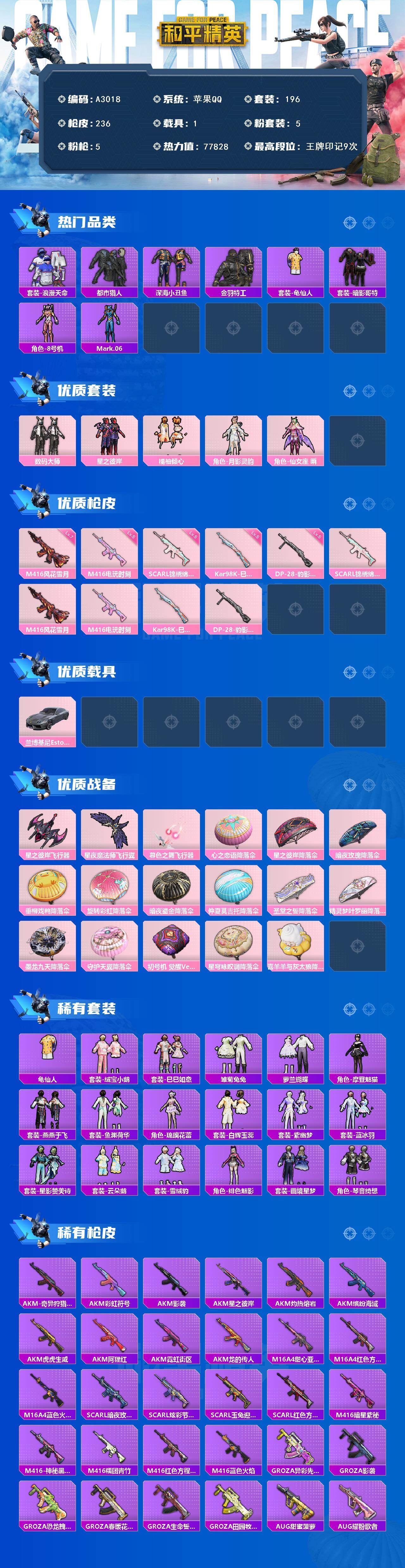 [15448000]苹果 【身法号/都市猎人/暗影哥特/角色-8号机/角色-mark.06/m416-风花雪月七级/兰博基尼estoque(银翼灰)/萌熊伴侣背包】手q-5粉装-5特效呛-1载具-4粉色飞行器-77828热力值-9王牌印记-196套装-236呛皮 【热门品类】:套装-浪漫天命,套装-都市猎人,套装-深海小丑鱼,套装-金羽特工,套装-龟仙人,套装-暗影哥特,角色-8号机,角色-mark.06 【粉色套装】:粉装-数码大师,粉装-星之彼岸,粉装-橘柚倾心,角色-月影灵韵,角色-仙女座 瞬 【粉色呛皮等级】:scar-l-锦绣绵绵五级,m416-风花雪月七级,m416-电玩时刻五级,kar98k-巳巳如意五级,dp-28-豹影疾电五级 【粉色载具】:兰博基尼estoque(银翼灰) 【粉色呛皮】:scar-l-锦绣绵绵,m416-风花雪月,m416-电玩时刻,kar98k-巳巳如意,dp-28-豹影疾电 【粉色飞行器】:星之彼岸飞行器,星夜魔法师飞行翼,暮色之舞飞行器 【粉色降落伞】:心之恋语降落伞,星之彼岸降落伞,暗夜玫瑰降落伞,垂柳戏鸭降落伞,旋转彩虹降落伞,暗夜鎏金降落伞,仲夏莫吉托降落伞,圣堂之誓降落伞,精灵梦叶罗丽降落伞,墨龙九天降落伞,守护天翼降落伞,初号机 觉醒ver.降落伞,星穹咏叹调降落伞,喜羊羊与灰太狼降落伞,炫彩糖果降落伞 【稀有套装】:套装-龟仙人,套装-绒宝小鹅,套装-巳巳如意,套装-雪国风尚,套装-雏菊兔兔,套装-萝兰蝴蝶,角色-摩登魅猫,套装-燕燕于飞,套装-鱼渊荷华,角色-琉璃花蕾,套装-白辉玉蕊,套装-紫幽梦,套装-蓝冰羽,套装-星影赞美诗,套装-云朵鹅,套装-雪绒豹,角色-绯色魅影,套装-画境星梦,套装-琴音绮想,套装-炫彩糖果 【稀有呛皮】:aug-冰晶雪宝,akm-奇异狩猎者,akm-彩虹符号,akm-影袭,akm-星之彼岸,akm-灼热熔岩,akm-缤纷海域,akm-虎虎生威,akm-阿狸红,akm-霓虹街区,akm-龙的传人,m16a4-甜心亚梦,m16a4-红色方程式,m16a4-蓝色火焰,scar-l-暗夜玫瑰,scar-l-炫彩节奏,scar-l-玉兔迎春,scar-l-红色方程式,m416-暗星紫秘,m416-神秘黑猫,m416-糯团青竹,m416-红色方程式,m416-蓝色火焰,groza-异彩先