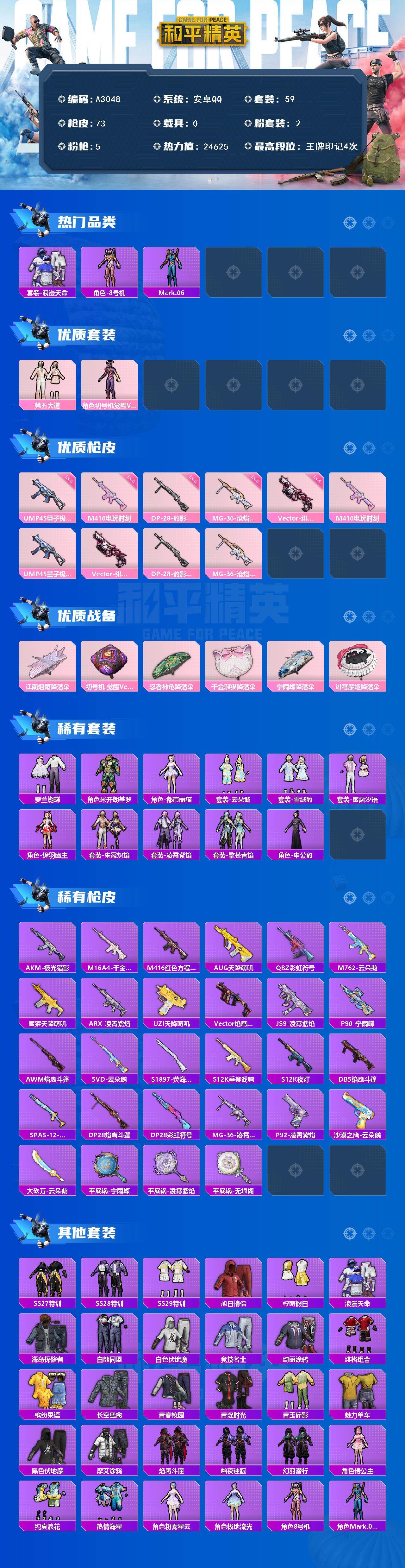 [15661946]安卓【小号/蓝螳螂/角色-初号机 觉醒ver.】 手q-2粉装-5特效呛-0载具-0粉色飞行器-24625热力值-4王牌印记-59套装-73呛皮 【热门品类】:套装-浪漫天命,角色-8号机,角色-mark.06 【粉色套装】:粉装-第五大道,角色-初号机 觉醒ver. 【粉色呛皮等级】:m416-电玩时刻五级,ump45-量子极限五级,vect-绯穹魔姬四级,dp-28-豹影疾电五级,mg-36-沧焰双生五级 【粉色呛皮】:m416-电玩时刻,ump45-量子极限,vect-绯穹魔姬,dp-28-豹影疾电,mg-36-沧焰双生 【粉色降落伞】:江南烟雨降落伞,初号机 觉醒ver.降落伞,忍者神龟降落伞,千金淑猫降落伞,宁雨蝶降落伞,绯穹魔姬降落伞 【稀有套装】:套装-萝兰蝴蝶,角色-米开朗基罗,角色-都市丽猫,套装-云朵鹅,套装-雪绒豹,套装-蜜露汐语,角色-绛羽幽主,套装-朱霞炽焰,套装-凌霄紫焰,套装-擎苍青焰,角色-申公豹 【稀有呛皮】:akm-极光猎影,m16a4-千金淑猫,m416-红色方程式,aug-天降萌叽,q-彩虹符号,m762-云朵鹅,蜜獾-天降萌叽,arx-凌霄紫焰,uzi-天降萌叽,vect-焰鹰斗篷,aks-74u-极光猎影,js9-凌霄紫焰,p90-宁雨蝶,awm-焰鹰斗篷,svd-云朵鹅,s1897-荧海星豚,s12k-垂柳戏鸭,s12k-夜灯,dbs-焰鹰斗篷,spas-12-云朵鹅,dp-28-焰鹰斗篷,dp-28-彩虹符号,mg-36-凌霄紫焰,p92-凌霄紫焰,沙墨之鹦-云朵鹅,大砍刀-云朵鹅,平底锅-宁雨蝶,平底锅-凌霄紫焰,平底锅-无垠阁 【其他套装】:套装-ss27特训,套装-ss28特训,套装-ss29特训,套装-旭日情侣,套装-柠萌假日,套装-浪漫天命,套装-海岛探路者,套装-白熊同盟,套装-白色伏地魔,套装-竞技名士,套装-绮丽涂鸦,套装-绯格组合,套装-缤纷果语,套装-长空猛禽,套装-青春校园,套装-青涩时光,套装-青玉碎影,套装-魅力单车,套装-黑色伏地魔,套装-摩艾涂鸦,套装-焰鹰斗篷,套装-幽夜迷踪,套装-幻羽潜行,角色-情公主,套装-纯真浪花,套装-热情海星,角色-粉雾星云,角色-极地流光,角色-8号机,角色-mark.06 【营地id】:944060396