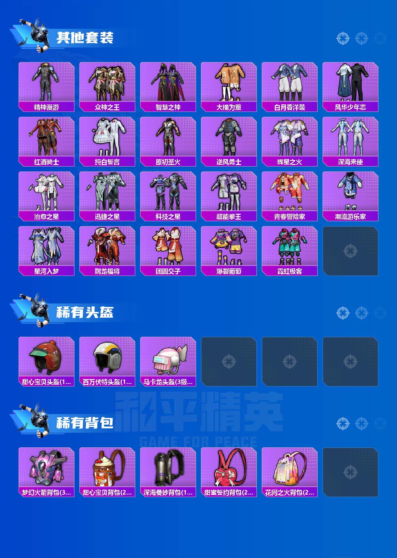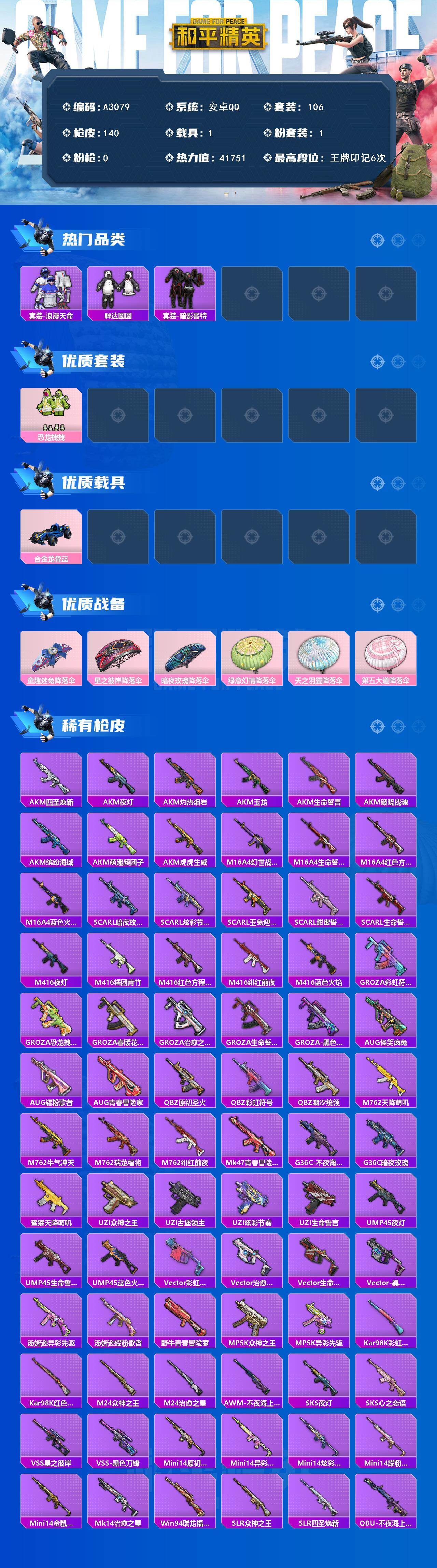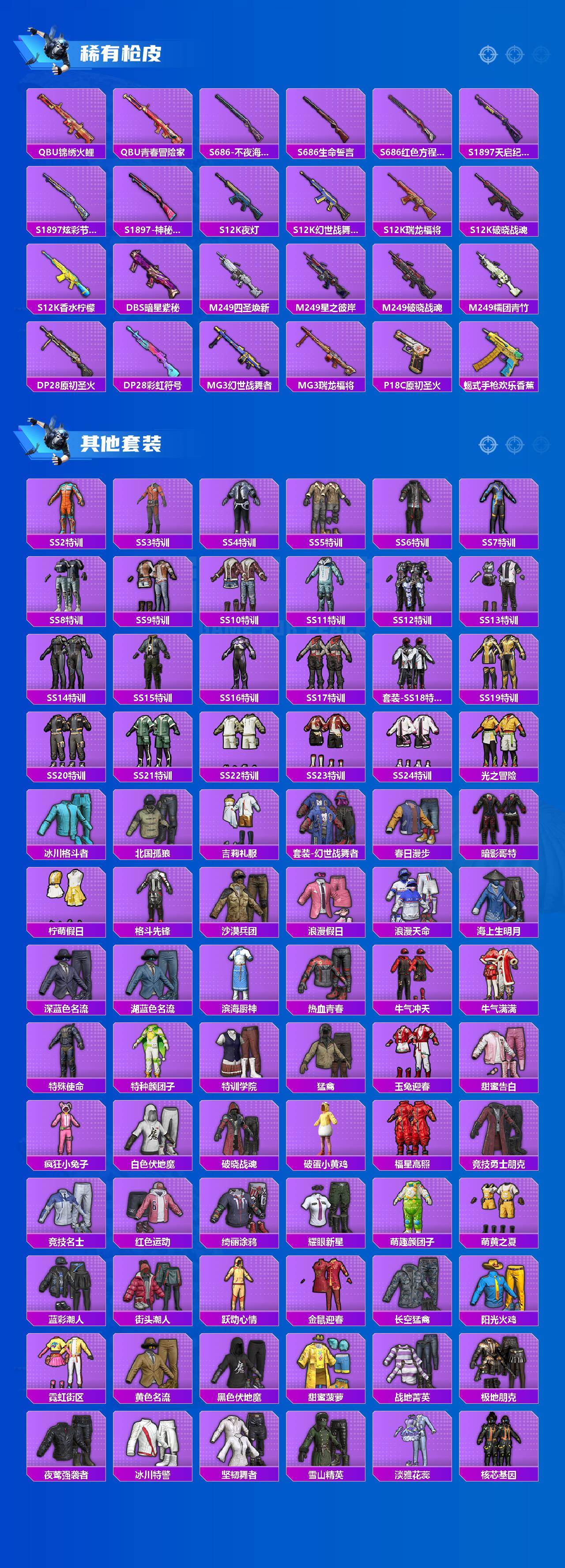 [15492071]安卓【小号/暗影哥特】 手q-1粉装-0特效呛-1载具-0粉色飞行器-41751热力值-6王牌印记-106套装-140呛皮 【热门品类】:套装-浪漫天命,套装-胖达圆圆,套装-暗影哥特 【粉色套装】:粉装-恐龙拽拽 【粉色载具】:合金龙骨(蓝) 【粉色降落伞】:童趣迷兔降落伞,星之彼岸降落伞,暗夜玫瑰降落伞,绿意幻情降落伞,天之羽翼降落伞,第五大道降落伞 【稀有呛皮】:akm-四圣焕新,akm-夜灯,akm-灼热熔岩,akm-玉龙,akm-生命誓言,akm-破晓战魂,akm-缤纷海域,akm-萌趣颜团子,akm-虎虎生威,m16a4-幻世战舞者,m16a4-生命誓言,m16a4-红色方程式,m16a4-蓝色火焰,scar-l-暗夜玫瑰,scar-l-炫彩节奏,scar-l-玉兔迎春,scar-l-甜蜜誓约,scar-l-生命誓言,m416-夜灯,m416-糯团青竹,m416-红色方程式,m416-绯红前夜,m416-蓝色火焰,groza-彩虹符号,groza-恐龙拽拽,groza-春暖花开,groza-治愈之星,groza-生命誓言,groza-黑色刀锋,aug-怪笑疯兔,aug-耀粉歌者,aug-青春冒险家,q-原初圣火,q-彩虹符号,q-潮汐统领,m762-天降萌叽,m762-牛气冲天,m762-瑞龙福将,m762-绯红前夜,mk47-青春冒险家,g36c-不夜海上花,g36c-暗夜玫瑰,蜜獾-天降萌叽,uzi-众神之王,uzi-古堡领主,uzi-炫彩节奏,uzi-生命誓言,ump45-夜灯,ump45-生命誓言,ump45-蓝色火焰,vect-彩虹符号,vect-治愈之星,vect-生命誓言,vect-黑色刀锋,汤姆逊-异彩先驱,汤姆逊-耀粉歌者,野牛-青春冒险家,mp5k-众神之王,mp5k-异彩先驱,kar98k-彩虹符号,kar98k-红色方程式,m24-治愈之星,m24-众神之王,awm-不夜海上花,sks-夜灯,sks-心之恋语,vss-星之彼岸,vss-黑色刀锋,mini14-原初圣火,mini14-异彩先驱,mini14-炫彩节奏,mini14-耀粉歌者,mini14-金鼠迎春,mk14-治愈之星,win94-瑞龙福将,slr-众神之王,slr-四圣焕新,qbu-不夜海上花,qbu-锦绣火鲤,qbu-青春冒险家,s6
