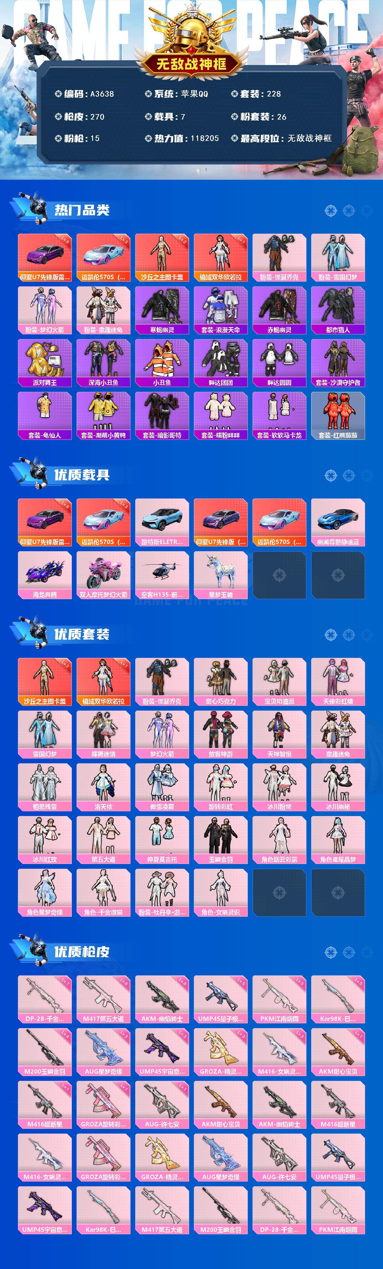 [15594233]苹果【素材号/沙丘之主-图卡盟二级/怪诞乔克/雪国幻梦/梦幻火箭/寒蝎幽灵/赤蝎幽灵/都市猎人/派对舞王/暗影哥特/甜心巧克力】 手q-无敌战神框-2神装-26粉装-15特效呛-7载具-12粉色飞行器-118205热力值-9王牌印记-228套装-270呛皮 【红色载具】:迈凯伦570s(炫冰蓝)三级,仰望u7(雷霆紫)六级 【红色神装等级】:镜域双华-欧若拉一级,沙丘之主-图卡盟二级 【红色角色神装】:镜域双华-欧若拉,沙丘之主-图卡盟 【热门品类】:粉装-怪诞乔克,粉装-雪国幻梦,粉装-梦幻火箭,粉装-童趣迷兔,套装-寒蝎幽灵,套装-浪漫天命,套装-赤蝎幽灵,套装-都市猎人,套装-派对舞王,套装-深海小丑鱼,套装-小丑鱼,套装-胖达团团,套装-胖达圆圆,套装-沙漠守护者,套装-龟仙人,套装-潮萌小黄鸭,套装-暗影哥特,套装-糯粉咩咩,套装-软软马卡龙,套装-红熊茄茄 【粉色套装】:粉装-怪诞乔克,粉装-甜心巧克力,粉装-宝贝奶油派,粉装-天使彩虹糖,粉装-雪国幻梦,粉装-蝶舞迷情,粉装-梦幻火箭,粉装-放客神游,粉装-天禅智恒,粉装-童趣迷兔,粉装-相思残雪,角色-洛天依,粉装-傲雪凌霜,粉装-旋转彩虹,粉装-冰川粉黛,粉装-冰川幽秘,粉装-冰川红玫,粉装-第五大道,粉装-仲夏莫吉托,粉装-玉鳞金羽,角色-烟云彩露,角色-鸢尾晶梦,角色-星梦奇缘,角色-千金淑猫,粉装-牡丹亭·游园,角色-女娲灵识 【粉色呛皮等级】:akm-甜心宝贝一级,akm-幽焰骑士六级,m416-超新星一级,m416-女娲灵识三级,groza-旋转彩虹一级,groza-精灵之光三级,aug-星梦奇缘三级,aug-许七安一级,ump45-量子极限五级,ump45-宇宙意志三级,kar98k-巳巳如意五级,m417-第五大道六级,m200-玉鳞金羽四级,dp-28-千金淑猫七级,pkm-江南烟雨五级 【粉色载具】:路特斯eletre(冰川蓝),仰望u7(雷霆紫),迈凯伦570s(炫冰蓝),幽澜尊爵(静谧蓝),海龙奔腾,双人摩托-梦幻火箭,空客h135-蔚蓝之翼,星梦玉骢 【粉色呛皮】:akm-甜心宝贝,akm-幽焰骑士,m416-超新星,m416-女娲灵识,groza-旋转彩虹,groza-精灵之光,aug-星梦奇