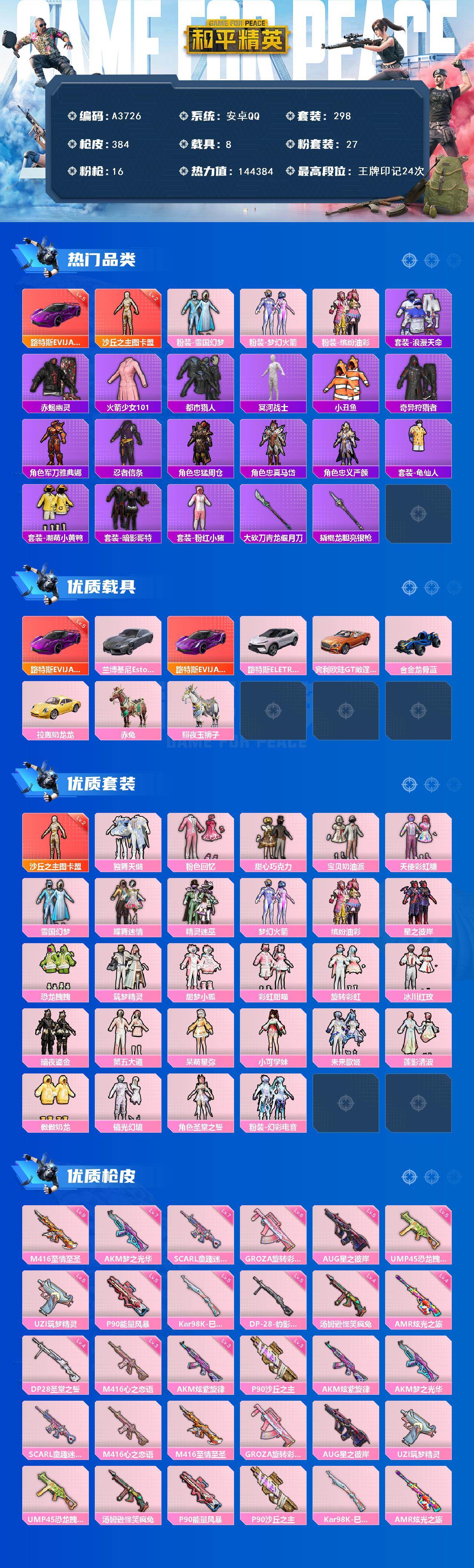 [15504168]安卓 【极品神装号 沙丘之主-图卡盟二级/雪国幻梦/缤纷油彩/火箭少女101/冥河战士/m416-至情至圣九级路特斯evija(电光紫)五级】手q-1神装-27粉装-16特效呛-8载具-8粉色飞行器-144384热力值-24王牌印记-298套装-384呛皮 【红色载具】:路特斯evija(电光紫)五级 【红色神装等级】:沙丘之主-图卡盟二级 【红色角色神装】:沙丘之主-图卡盟 【热门品类】:粉装-雪国幻梦,粉装-梦幻火箭,粉装-缤纷油彩,套装-浪漫天命,套装-赤蝎幽灵,套装-火箭少女101,套装-都市猎人,套装-冥河战士,套装-小丑鱼,套装-奇异狩猎者,角色-军刀雅典娜,套装-忍者信条,角色-忠猛周仓,角色-忠真马岱,角色-忠义严颜,套装-龟仙人,套装-潮萌小黄鸭,套装-暗影哥特,套装-粉红小猪,大砍刀-青龙偃月刀,撬棍-龙胆亮银呛 【粉色套装】:粉装-独舞天鹅,粉装-粉色回忆,粉装-甜心巧克力,粉装-宝贝奶油派,粉装-天使彩虹糖,粉装-雪国幻梦,粉装-蝶舞迷情,粉装-精灵迷巫,粉装-梦幻火箭,粉装-缤纷油彩,粉装-星之彼岸,粉装-恐龙拽拽,粉装-筑梦精灵,粉装-甜梦小狐,粉装-彩虹甜喵,粉装-旋转彩虹,粉装-冰川红玫,粉装-暗夜鎏金,粉装-第五大道,角色-呆萌星弥,角色-小可学妹,粉装-未来歌姬,粉装-莲影清波,粉装-傲傲奶龙,粉装-镜光幻境,角色-圣堂之誓,粉装-幻彩电音 【粉色呛皮等级】:akm-炫紫旋律三级,akm-梦之光华七级,scar-l-童趣迷兔七级,m416-心之恋语三级,m416-至情至圣九级,groza-旋转彩虹六级,aug-星之彼岸五级,uzi-筑梦精灵五级,ump45-恐龙拽拽五级,汤姆逊-怪笑疯兔四级,p90-能量风暴五级,p90-沙丘之主三级,kar98k-巳巳如意五级,amr-炫光之旅四级,dp-28-圣堂之誓四级,dp-28-豹影疾电五级 【粉色载具】:兰博基尼estoque(银翼灰),路特斯evija(电光紫),路特斯eletre(花绽灰),宾利欧陆gt敞篷(火焰橘),合金龙骨(蓝),拉轰奶龙龙,赤兔,照夜玉狮子 【粉色呛皮】:akm-炫紫旋律,akm-梦之光华,scar-l-童趣迷兔,m416-心之恋语,m416-至情至圣,groza-旋转彩虹,