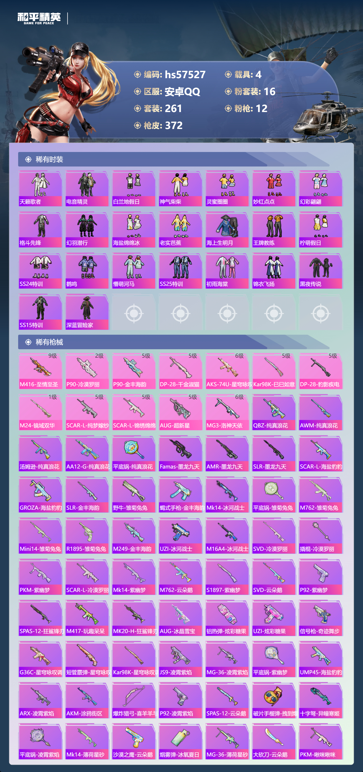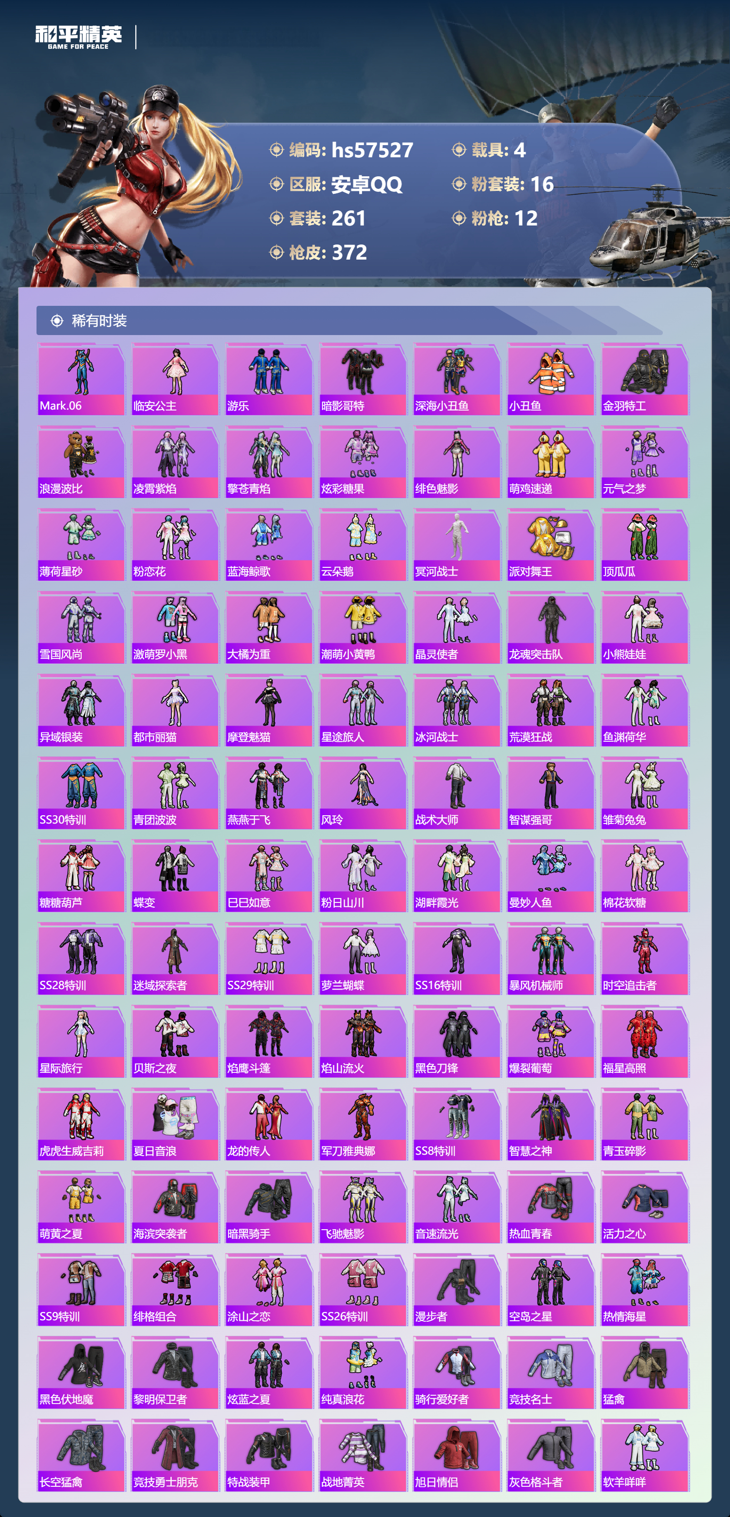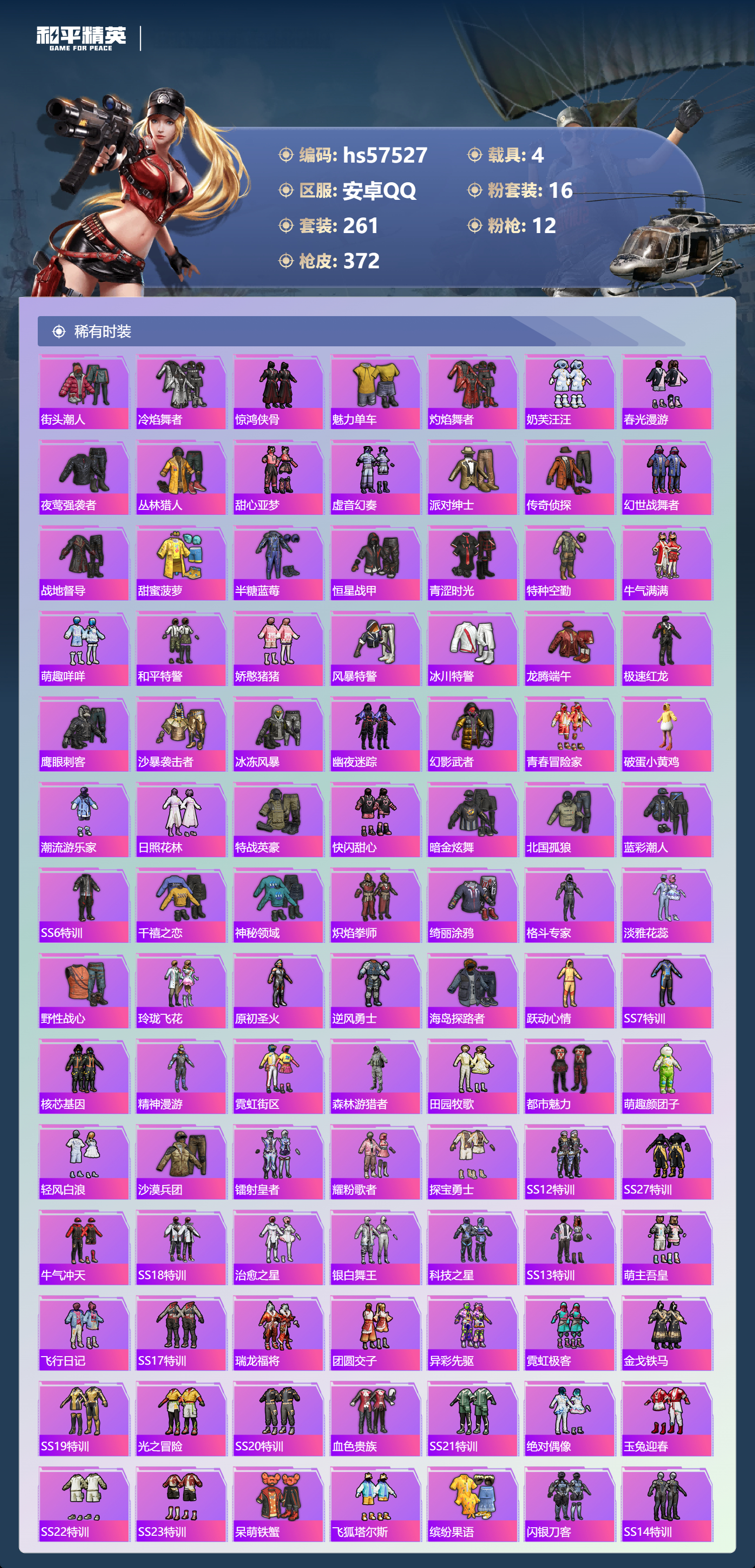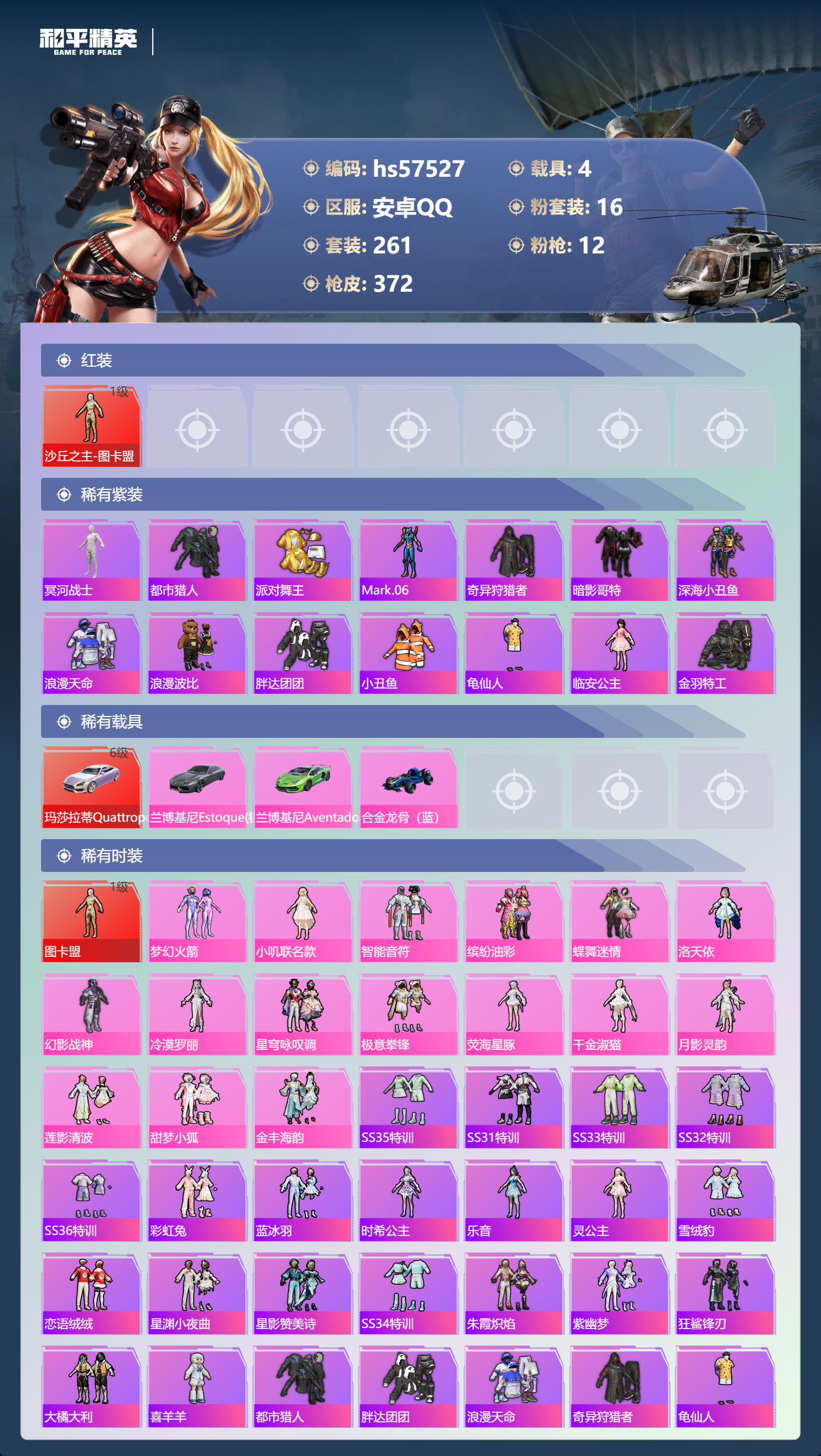 hs57527 安卓手q-19王牌印记-1红装-16粉装-12特效呛-4载具-热力值-261套装-372呛皮-6卓越印记-3传奇印记【1红装】沙丘之主-图卡盟/1级【16粉装】套装-金丰海韵角色-洛天依套装-蝶舞迷情套装-梦幻火箭套装-星穹咏叹调角色-千金淑猫套装-莲影清波角色-荧海星豚套装-智能音符套装-甜梦小狐套装-极意拳锋角色-冷漠罗丽角色-小叽联名款
