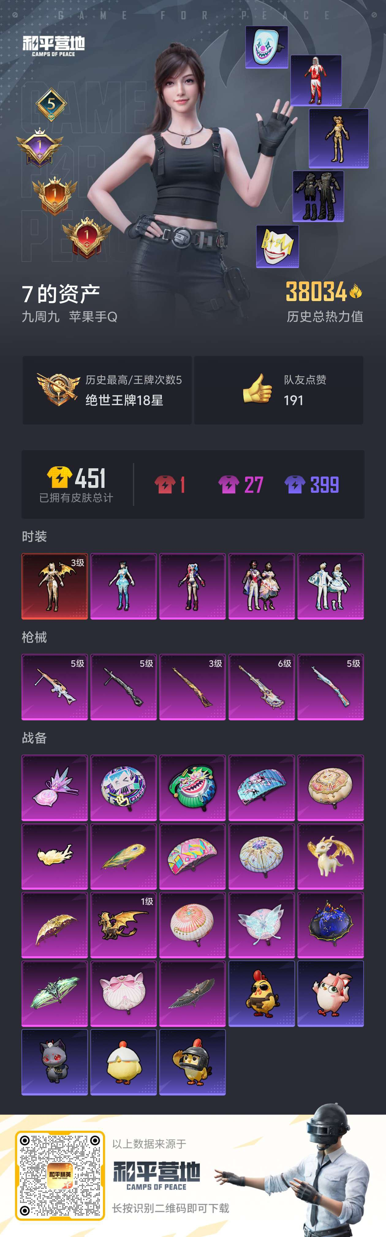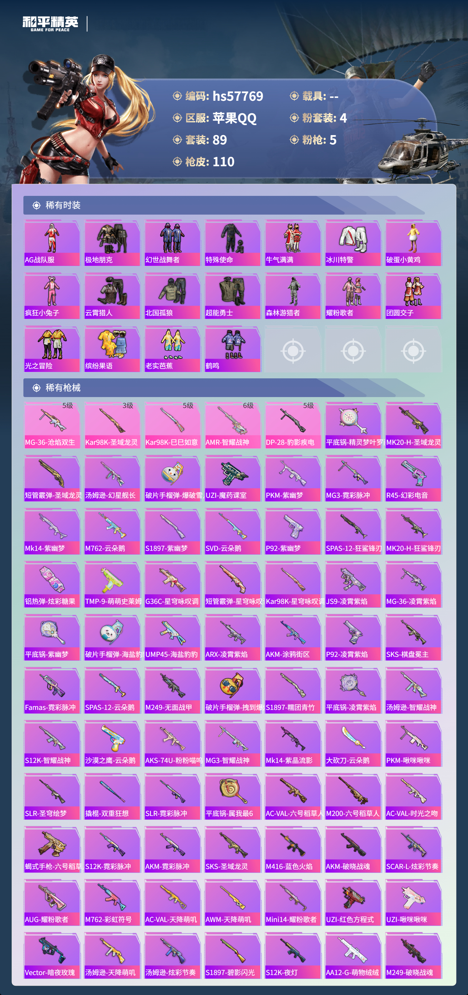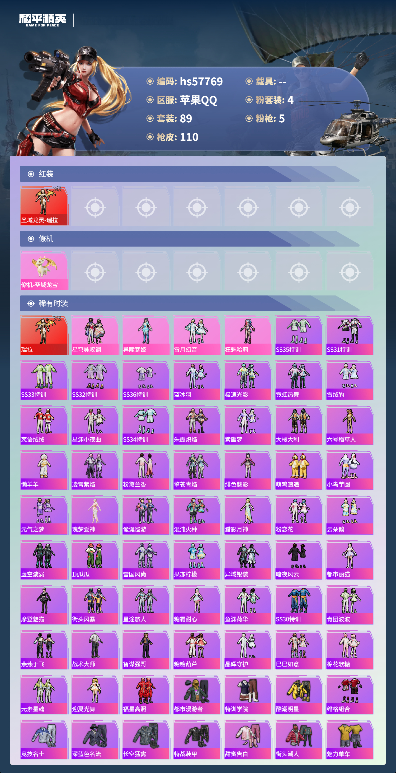 0载具-89套装-110呛皮-hs57769 苹果手q-5王牌印记-1红装-4粉装-5特效呛-38034热力值-89套装-110呛皮-1卓越印记-1传奇印记【1红装】圣域龙灵-瑞拉/3级【4粉装】角色-异瞳寒姬套装-雪月幻音套装-星穹咏叹调角色-狂魅哈莉【5特效呛】kar98k-巳巳如意/5级kar98k-圣域龙灵/3级dp-28-豹影疾电/5级mg-36-沧焰双生/5级amr-智耀战神/6级【1僚机】