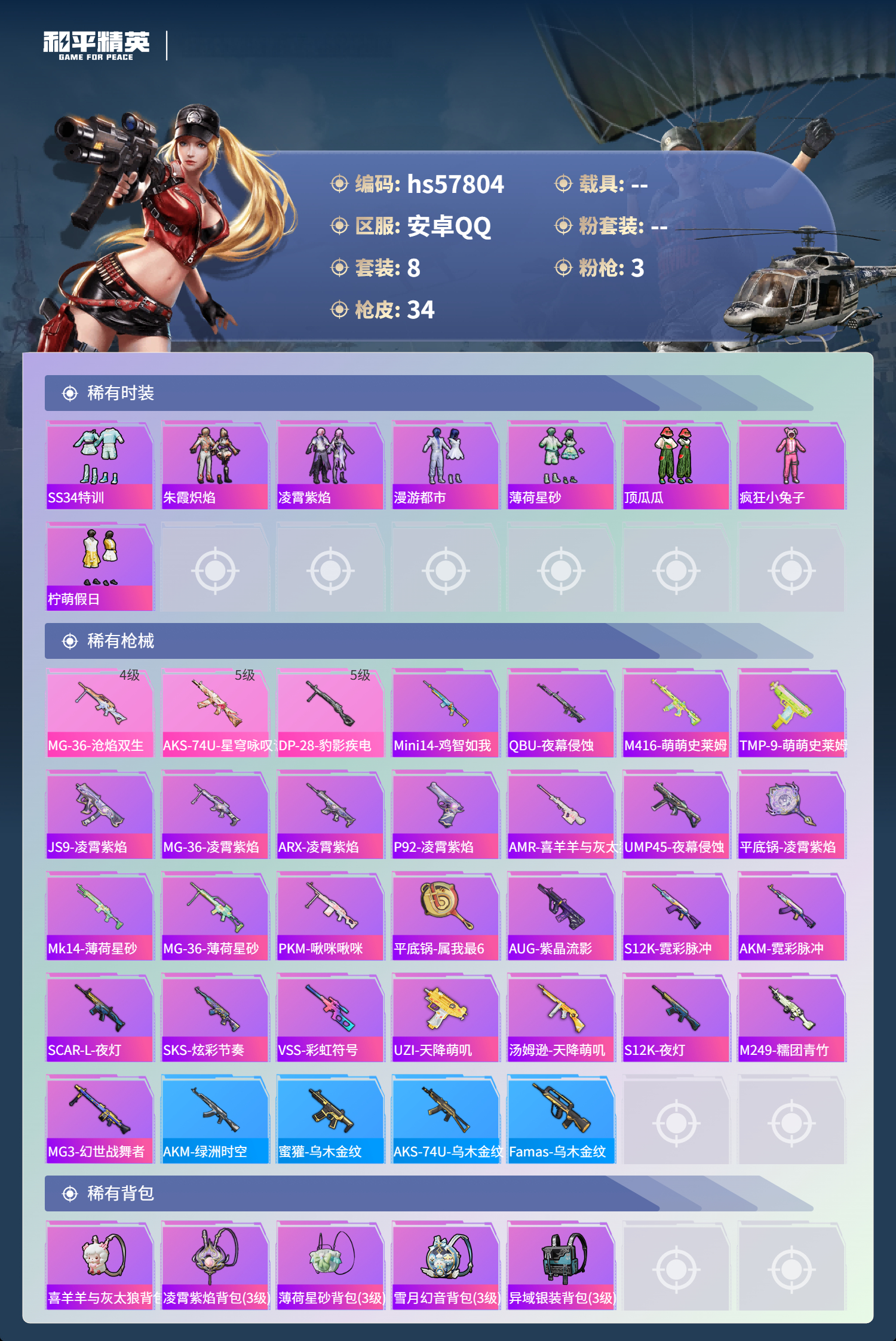 0载具-8套装-34呛皮-hs57804 安卓手q-0王牌印记-3特效呛-6843热力值-8套装-34呛皮【3特效呛】dp-28-豹影疾电/5级mg-36-沧焰双生/4级aks-74u-星穹咏叹调/5级【8稀有时装】ss34特训朱霞炽焰凌霄紫焰漫游都市薄荷星砂顶瓜瓜疯狂小兔子柠萌假日【33稀有呛械】mg-36-沧焰双生/4级aks-74u-星穹咏叹调/5级dp-28-豹影疾电/5级mini1