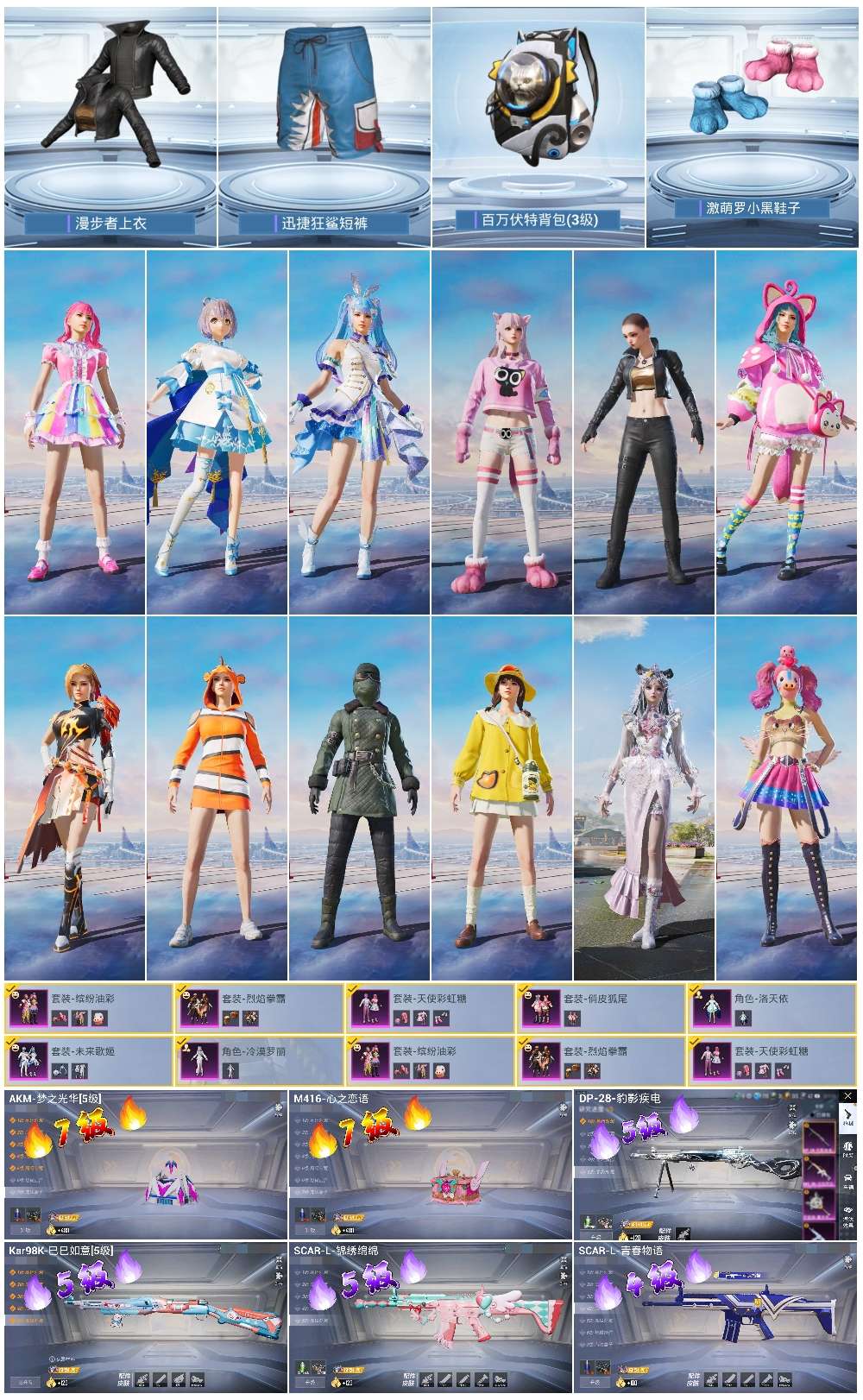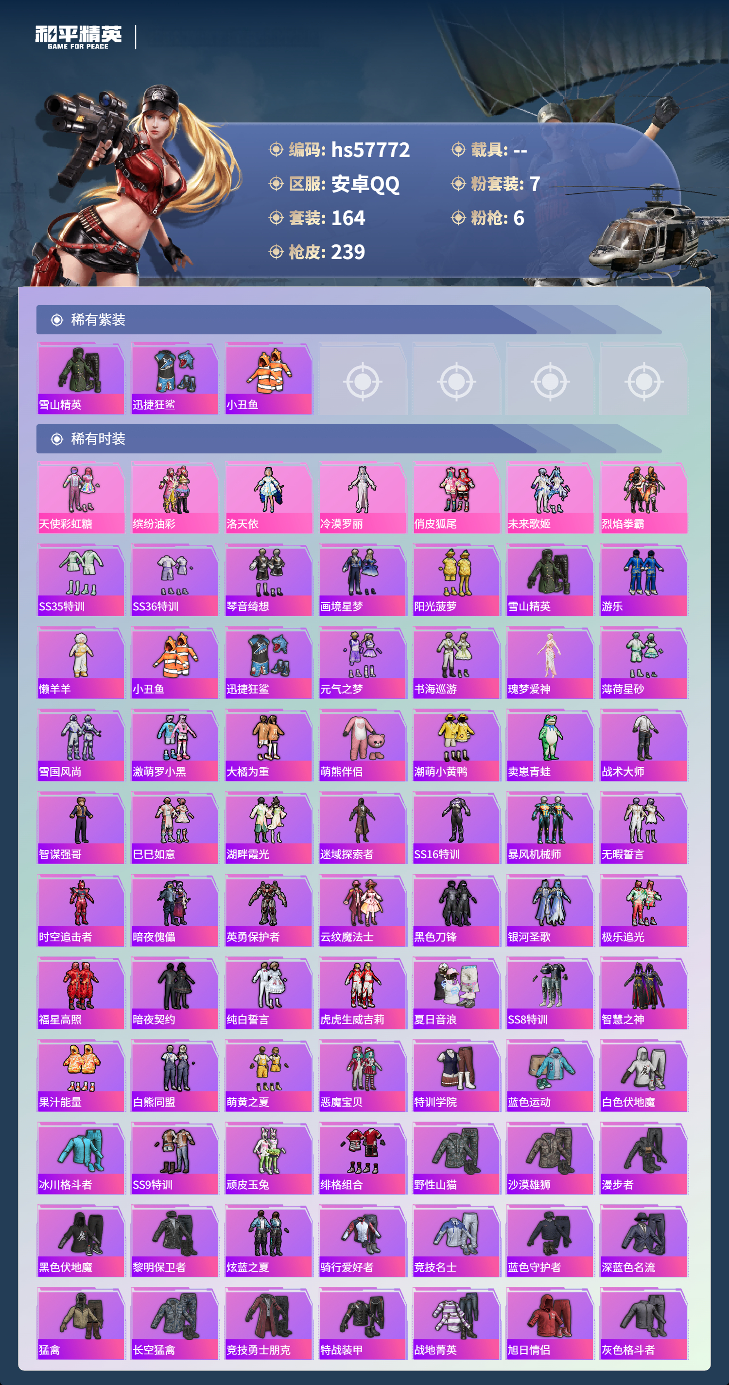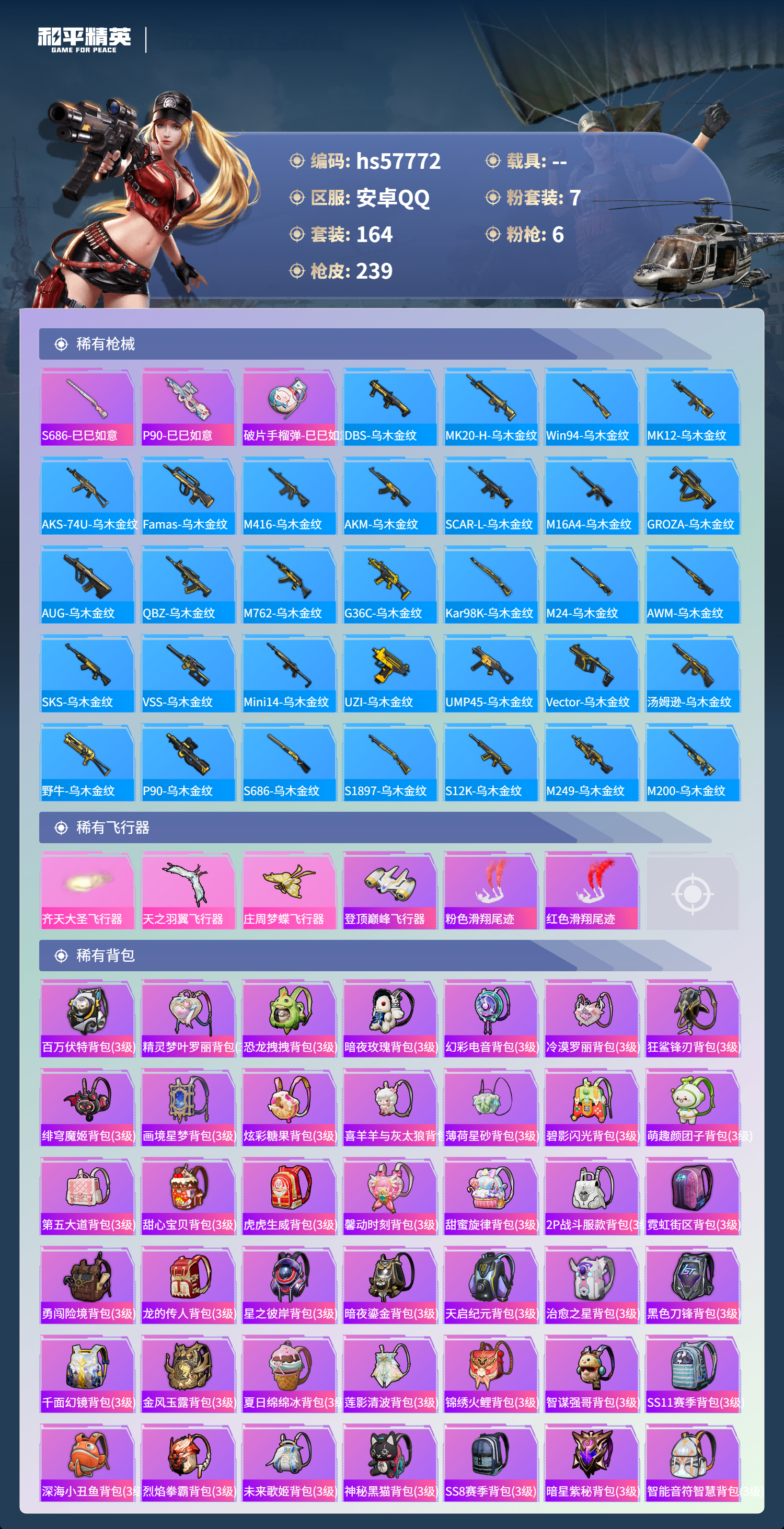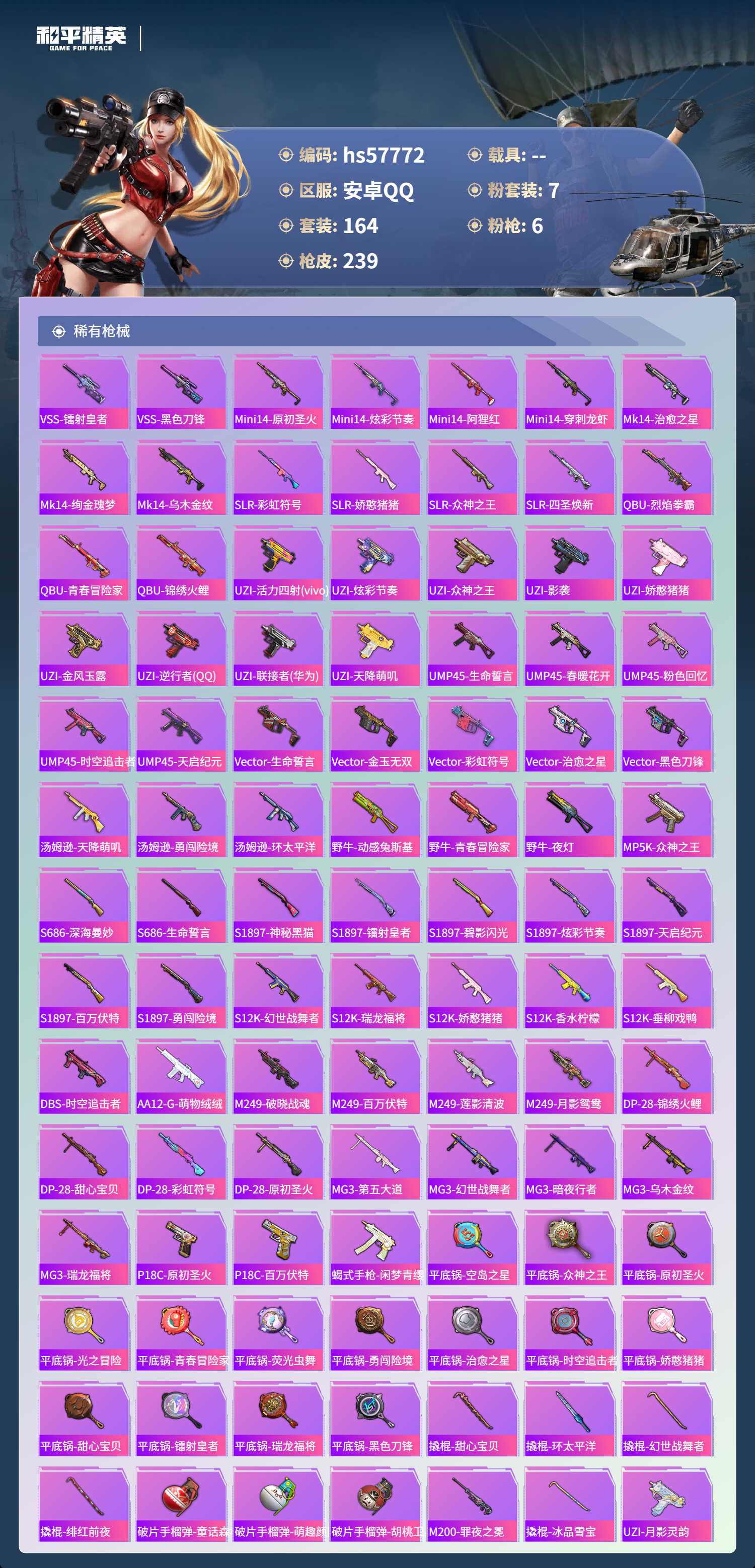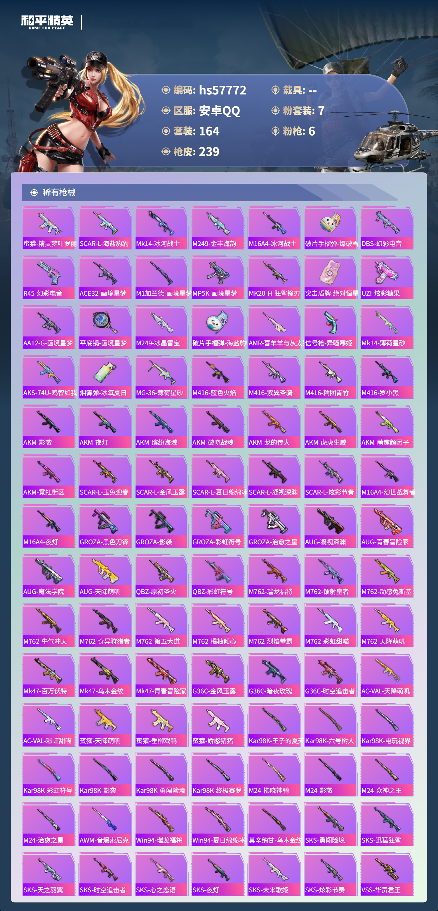 0载具-164套装-239呛皮-hs57772 安卓手q-4王牌印记-7粉装-6特效呛-74439热力值-164套装-239呛皮【7粉装】套装-未来歌姬套装-烈焰拳霸套装-缤纷油彩套装-天使彩虹糖角色-冷漠罗丽角色-洛天依套装-俏皮狐尾【6特效呛】scar-l-锦绣绵绵/5级dp-28-豹影疾电/5级akm-梦之光华/7级kar98k-巳巳如意/5级scar-l-青春物语/4级m416-心之恋语/7级