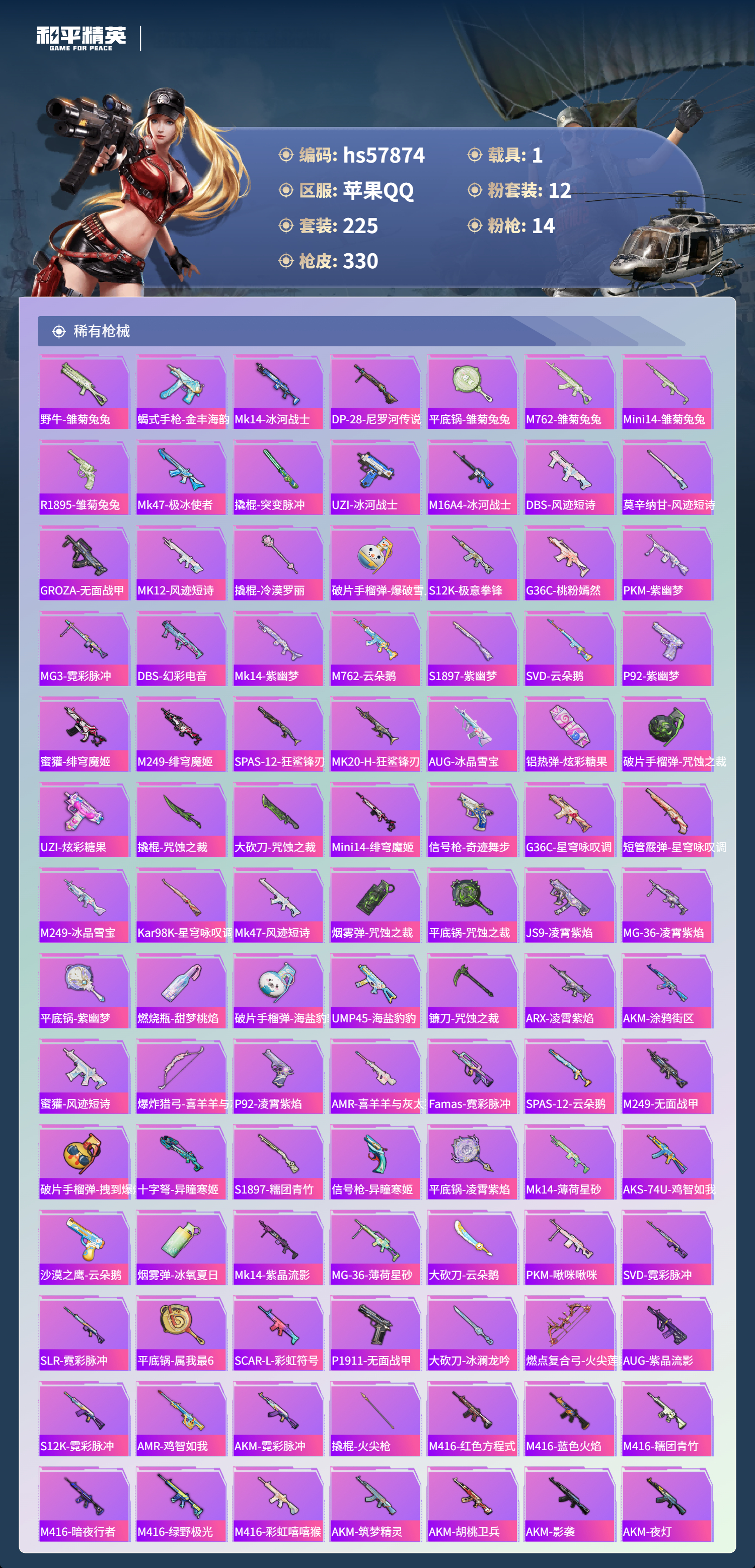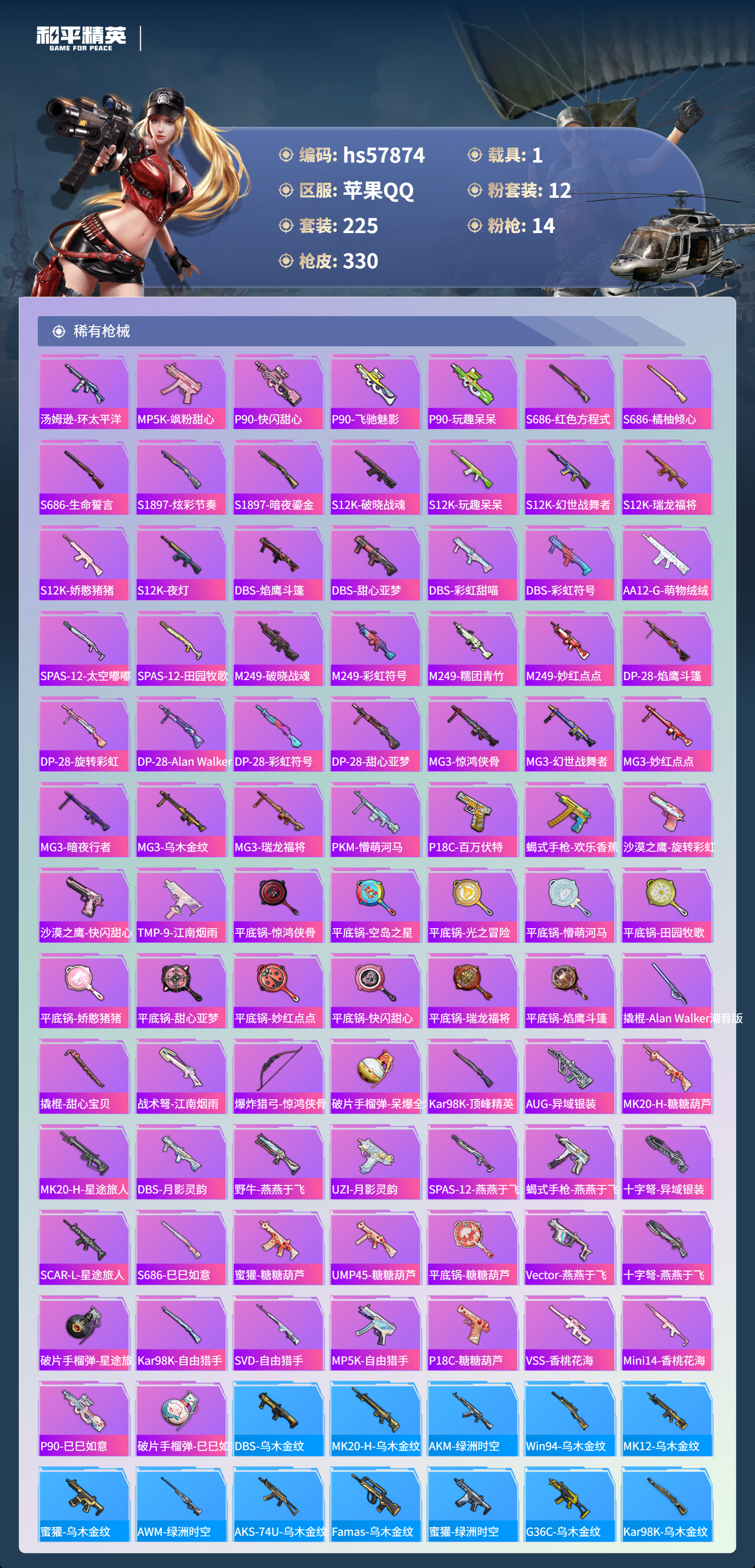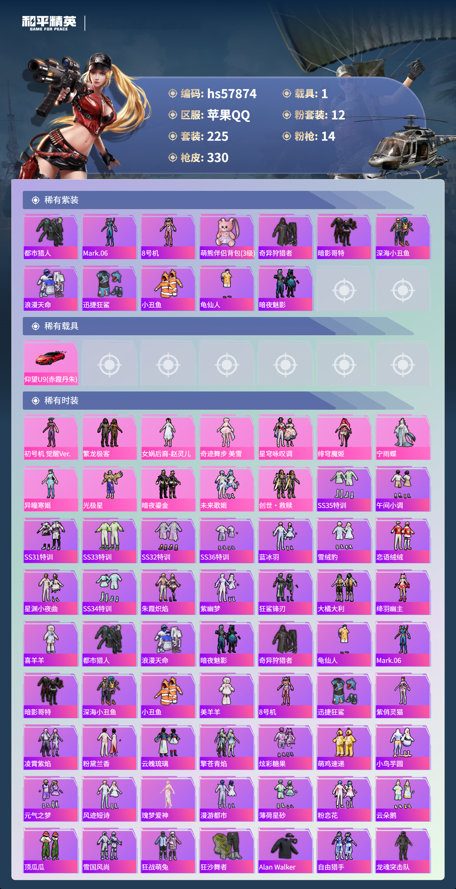 1载具-225套装-330呛皮-hs57874 苹果手q-13王牌印记-12粉装-14特效呛-1载具-96696热力值-225套装-330呛皮-2卓越印记【12粉装】角色-初号机 觉醒ver.套装-暗夜鎏金角色-异瞳寒姬套装-创世·救赎套装-星穹咏叹调角色-奇迹舞步 美雪女娲后裔-赵灵儿角色-绯穹魔姬角色-光极星套装-繁龙极客角色-宁雨蝶套装-未来歌姬【14特效呛】akm-绿萝繁花/5级scar-l