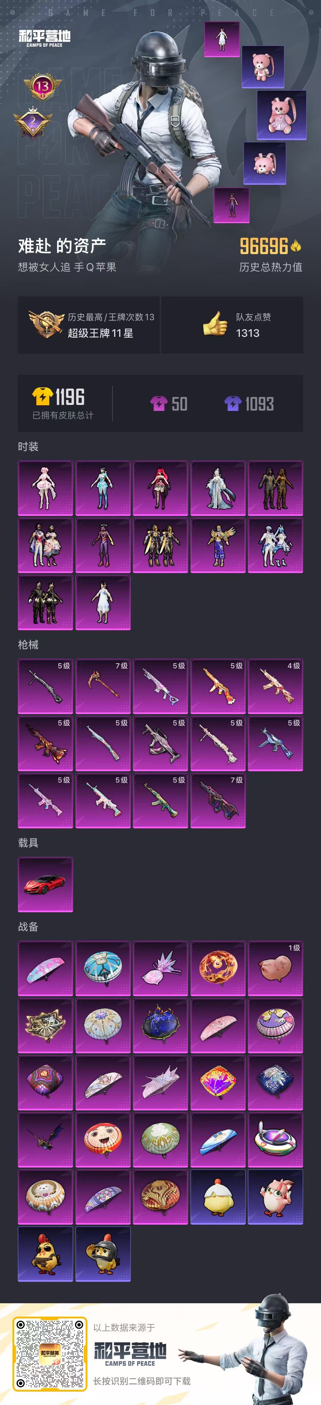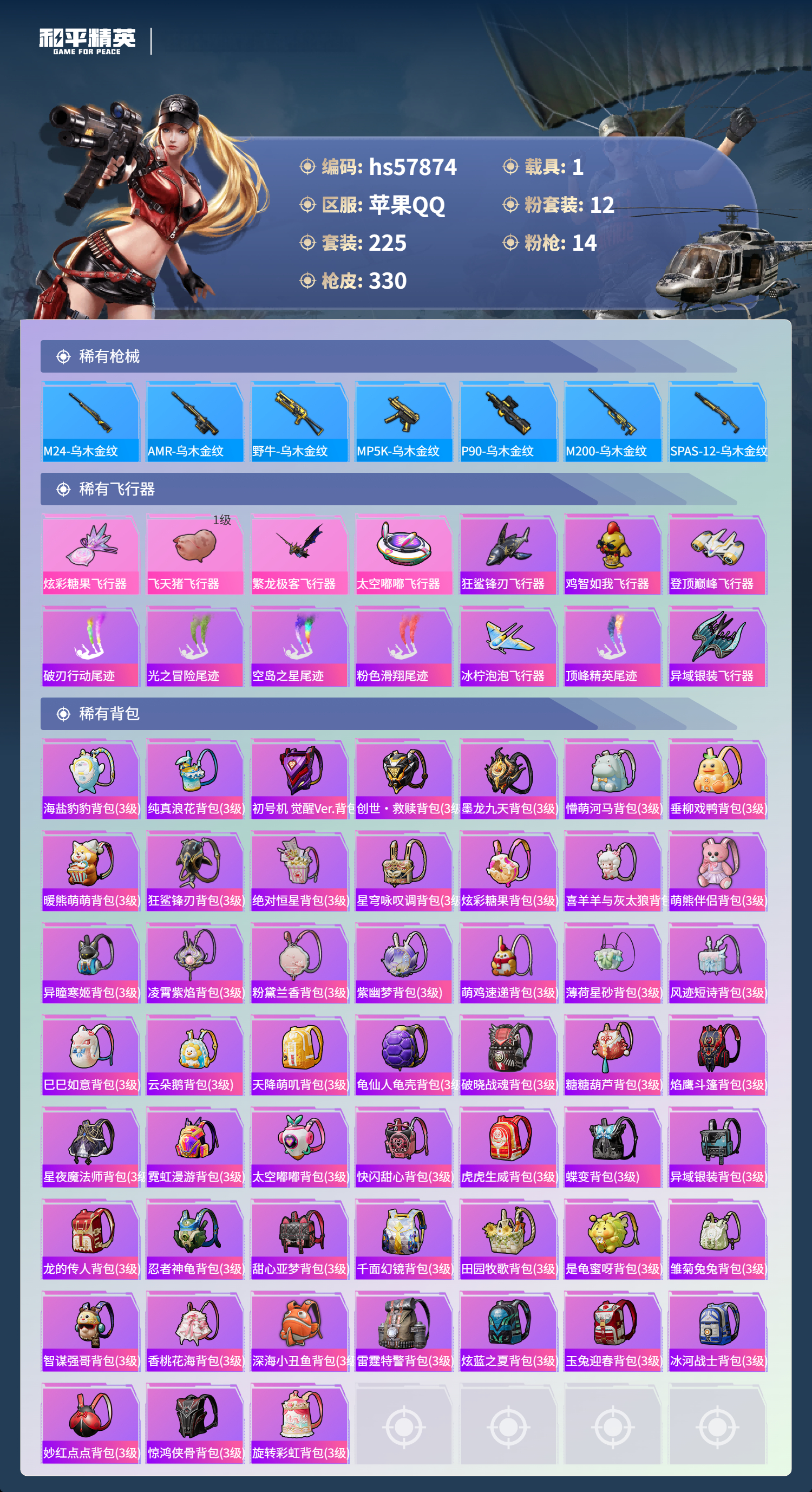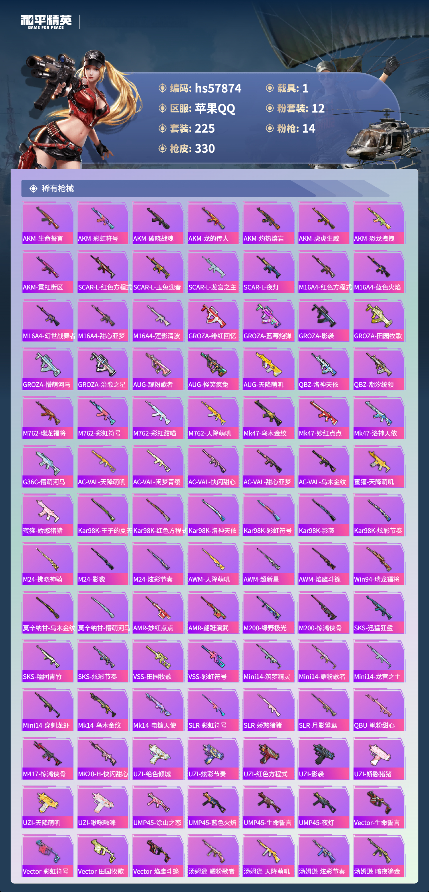 1载具-225套装-330呛皮-hs57874 苹果手q-13王牌印记-12粉装-14特效呛-1载具-96696热力值-225套装-330呛皮-2卓越印记【12粉装】角色-初号机 觉醒ver.套装-暗夜鎏金角色-异瞳寒姬套装-创世·救赎套装-星穹咏叹调角色-奇迹舞步 美雪女娲后裔-赵灵儿角色-绯穹魔姬角色-光极星套装-繁龙极客角色-宁雨蝶套装-未来歌姬【14特效呛】akm-绿萝繁花/5级scar-l