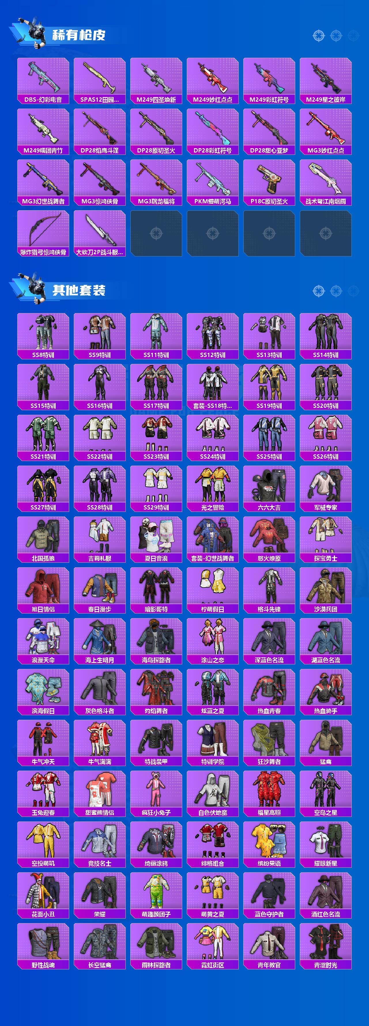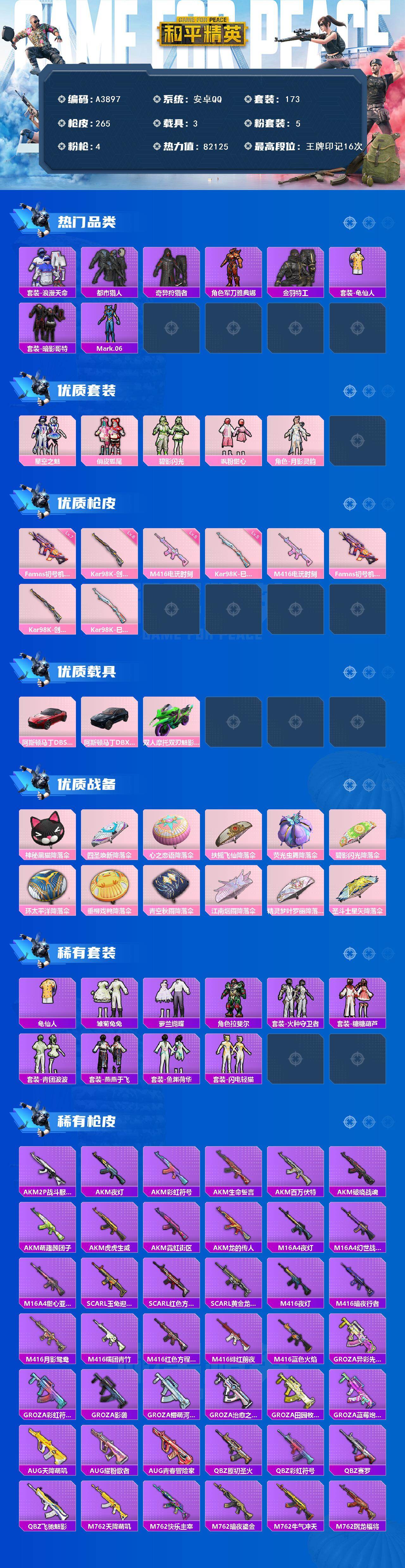 [15730836]安卓【男神号 粉装-星空之魅/阿斯顿马丁dbs(红)/阿斯顿马丁dbx(蓝)/m416-电玩时刻】 手q-5粉装-4特效呛-3载具-0粉色飞行器-82125热力值-16王牌印记-173套装-265呛皮 【热门品类】:套装-浪漫天命,套装-都市猎人,套装-奇异狩猎者,角色-军刀雅典娜,套装-金羽特工,套装-龟仙人,套装-暗影哥特,角色-mark.06 【粉色套装】:粉装-星空之魅,粉装-俏皮狐尾,粉装-碧影闪光,粉装-飒粉甜心,角色-月影灵韵 【粉色呛皮等级】:m416-电玩时刻五级,famas-初号机 觉醒ver.七级,kar98k-创世·救赎六级,kar98k-巳巳如意五级 【粉色载具】:阿斯顿马丁dbs(红),阿斯顿马丁dbx(蓝),双人摩托-双刃魅影(绿) 【粉色呛皮】:m416-电玩时刻,famas-初号机 觉醒ver.,kar98k-创世·救赎,kar98k-巳巳如意 【粉色降落伞】:神秘黑猫降落伞,四圣焕新降落伞,心之恋语降落伞,扶摇飞仙降落伞,荧光虫舞降落伞,碧影闪光降落伞,环太平洋降落伞,垂柳戏鸭降落伞,青空秋雨降落伞,江南烟雨降落伞,精灵梦叶罗丽降落伞,圣斗士星矢降落伞,炫彩糖果降落伞 【稀有套装】:套装-龟仙人,套装-雏菊兔兔,套装-萝兰蝴蝶,角色-拉斐尔,套装-火种守卫者,套装-糖糖葫芦,套装-青团波波,套装-燕燕于飞,套装-鱼渊荷华,套装-闪电轻猫 【稀有呛皮】:akm-2p战斗服款,akm-夜灯,akm-彩虹符号,akm-生命誓言,akm-百万伏特,akm-破晓战魂,akm-萌趣颜团子,akm-虎虎生威,akm-霓虹街区,akm-龙的传人,m16a4-夜灯,m16a4-幻世战舞者,m16a4-甜心亚梦,scar-l-玉兔迎春,scar-l-红色方程式,scar-l-黄金龙骨,m416-夜灯,m416-暗夜行者,m416-月影鸳鸯,m416-糯团青竹,m416-红色方程式,m416-绯红前夜,m416-蓝色火焰,groza-异彩先驱,groza-彩虹符号,groza-影袭,groza-懵萌河马,groza-治愈之星,groza-田园牧歌,groza-蓝莓炮弹,aug-天降萌叽,aug-耀粉歌者,aug-青春冒险家,q-原初圣火,q-彩虹符号,q-赛罗,q-飞驰魅影,m762-天降萌叽,m762-快乐主宰,m7