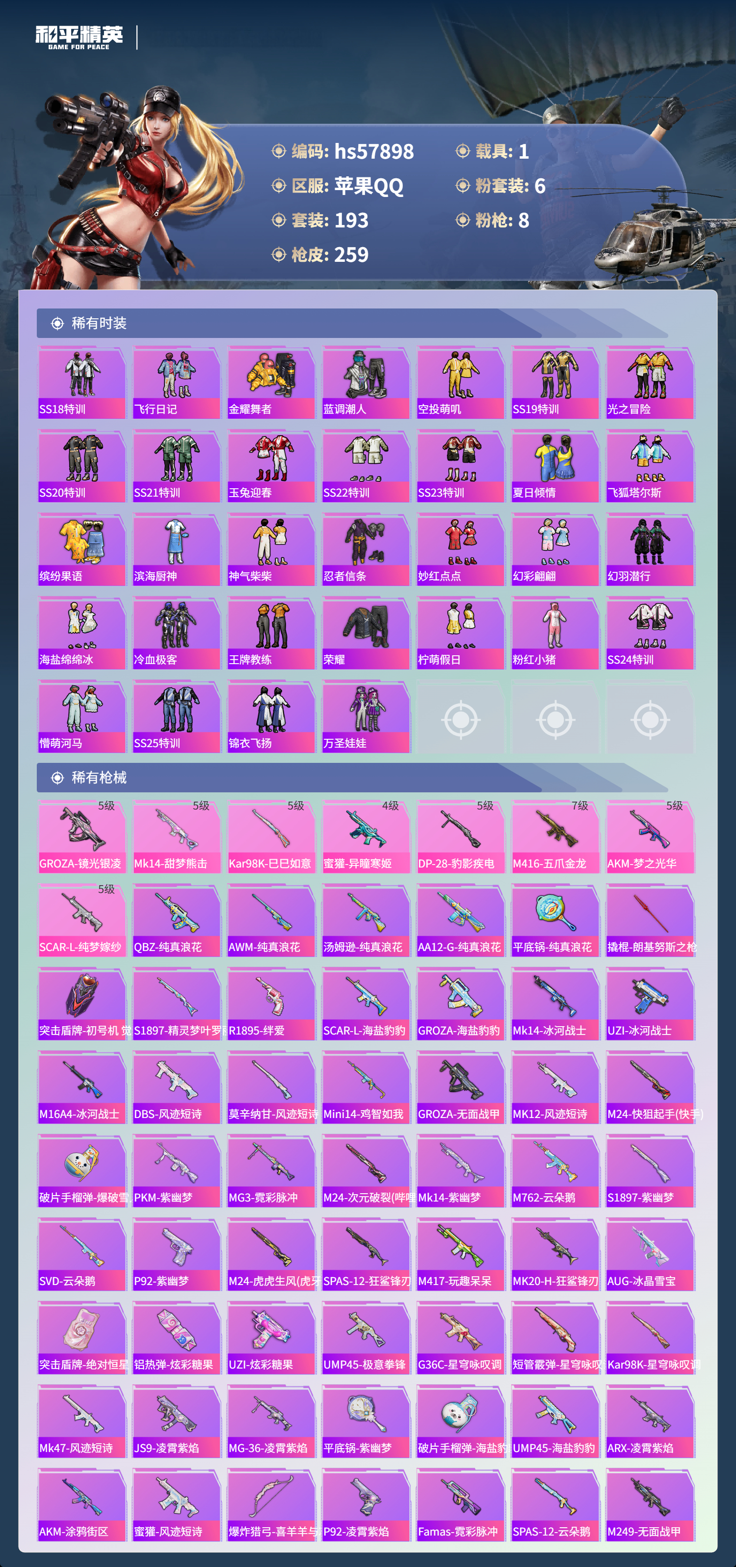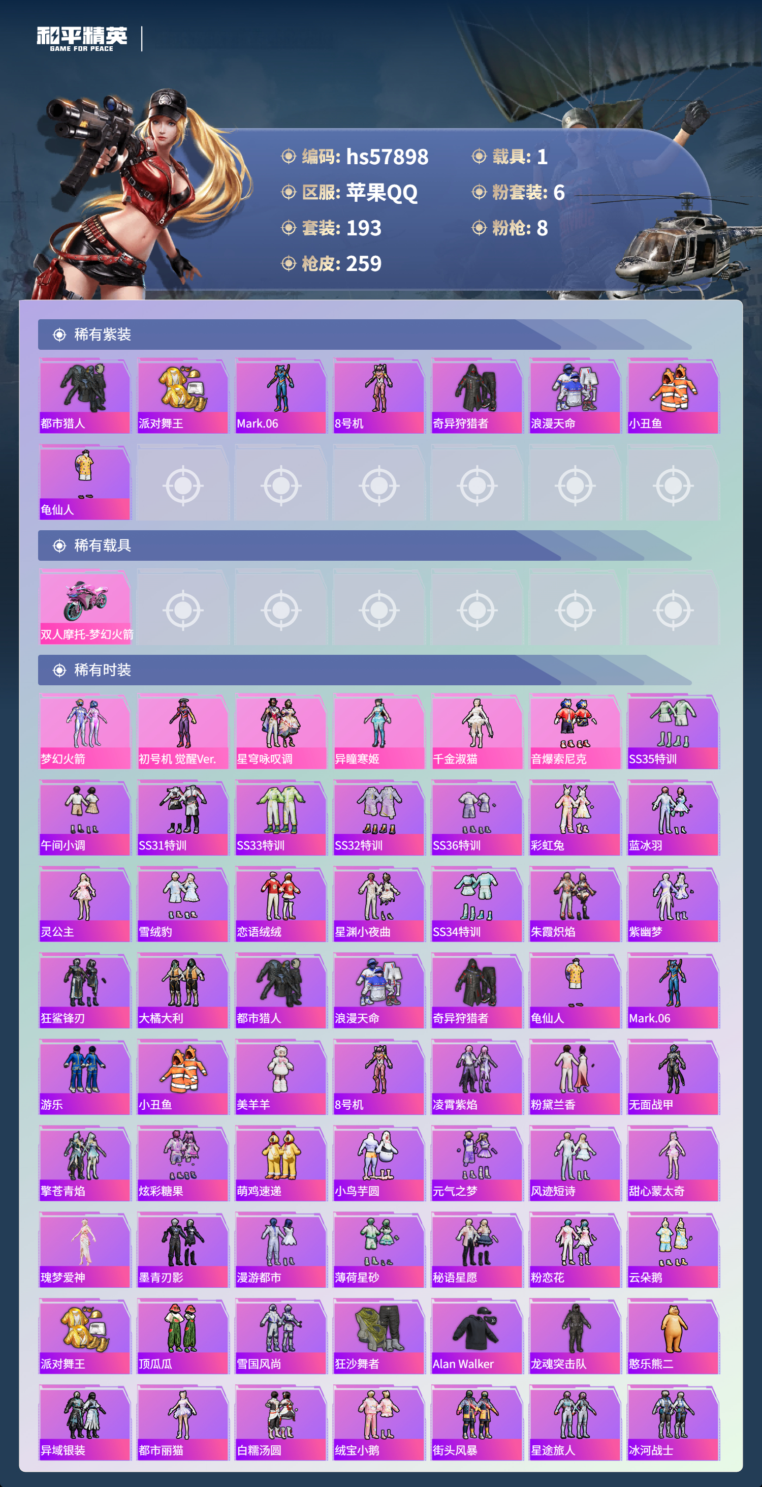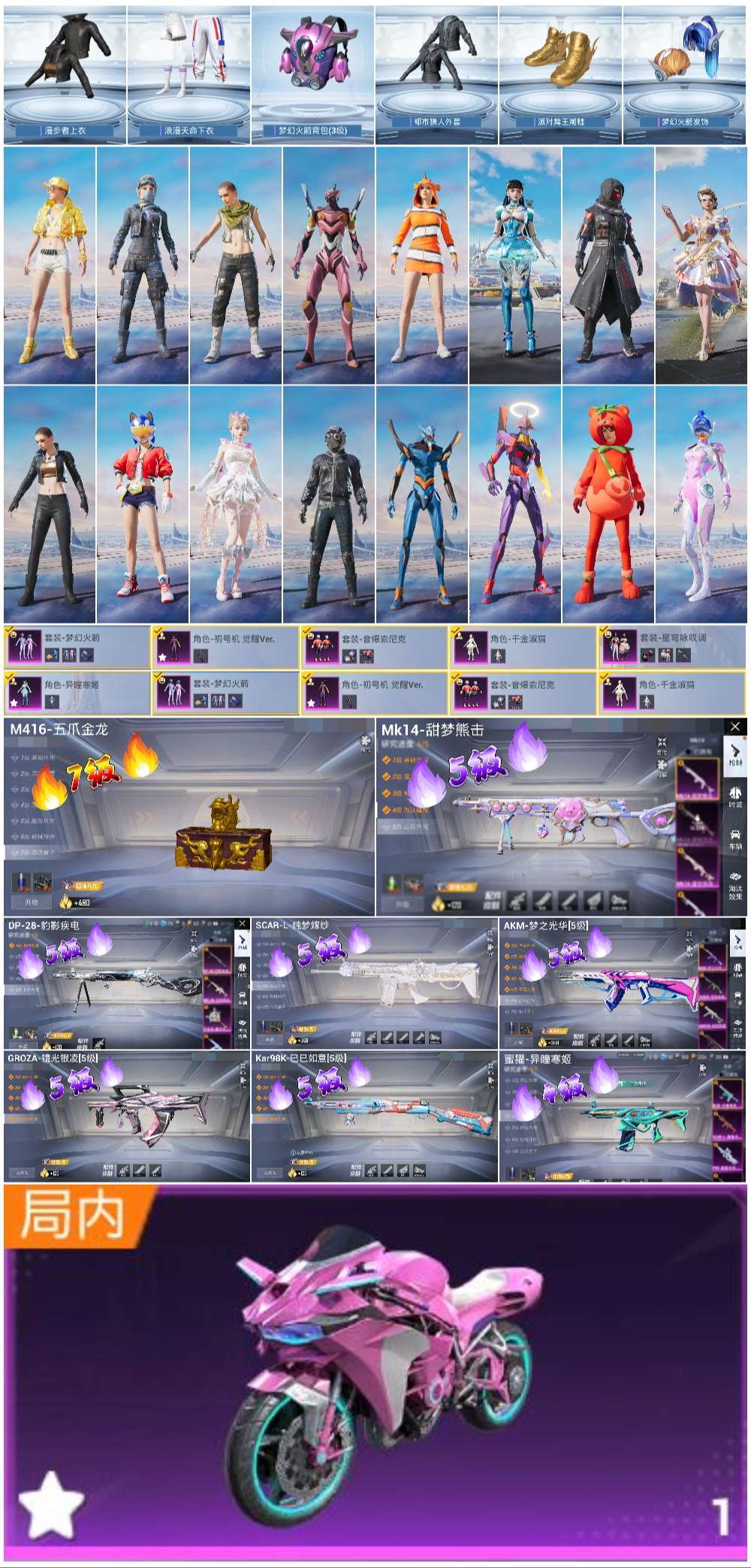 1载具-193套装-259呛皮-hs57898 苹果手q-12王牌印记-6粉装-8特效呛-1载具-77678热力值-193套装-259呛皮-5卓越印记-4传奇印记【6粉装】角色-千金淑猫角色-异瞳寒姬套装-音爆索尼克角色-初号机 觉醒ver.套装-梦幻火箭套装-星穹咏叹调【8特效呛】groza-镜光银凌/5级dp-28-豹影疾电/5级m416-五爪金龙/7级mk14-甜梦熊击/5级kar98k-巳巳如意/