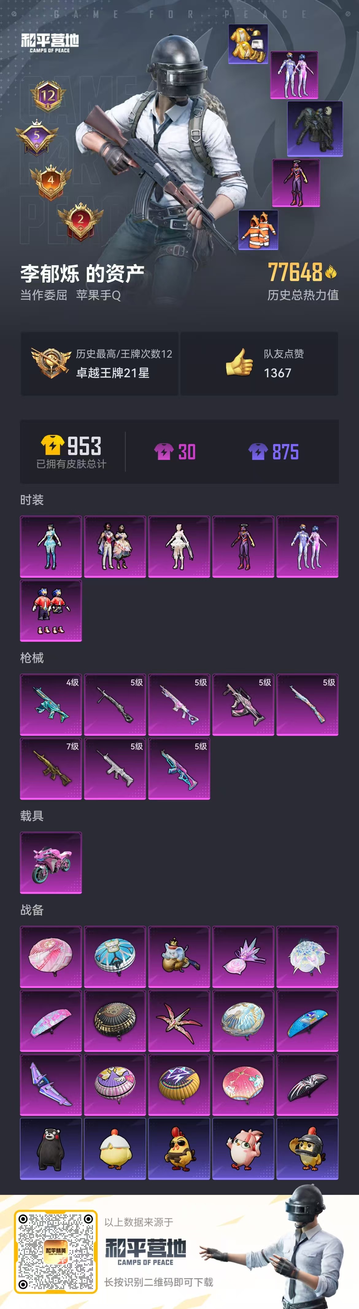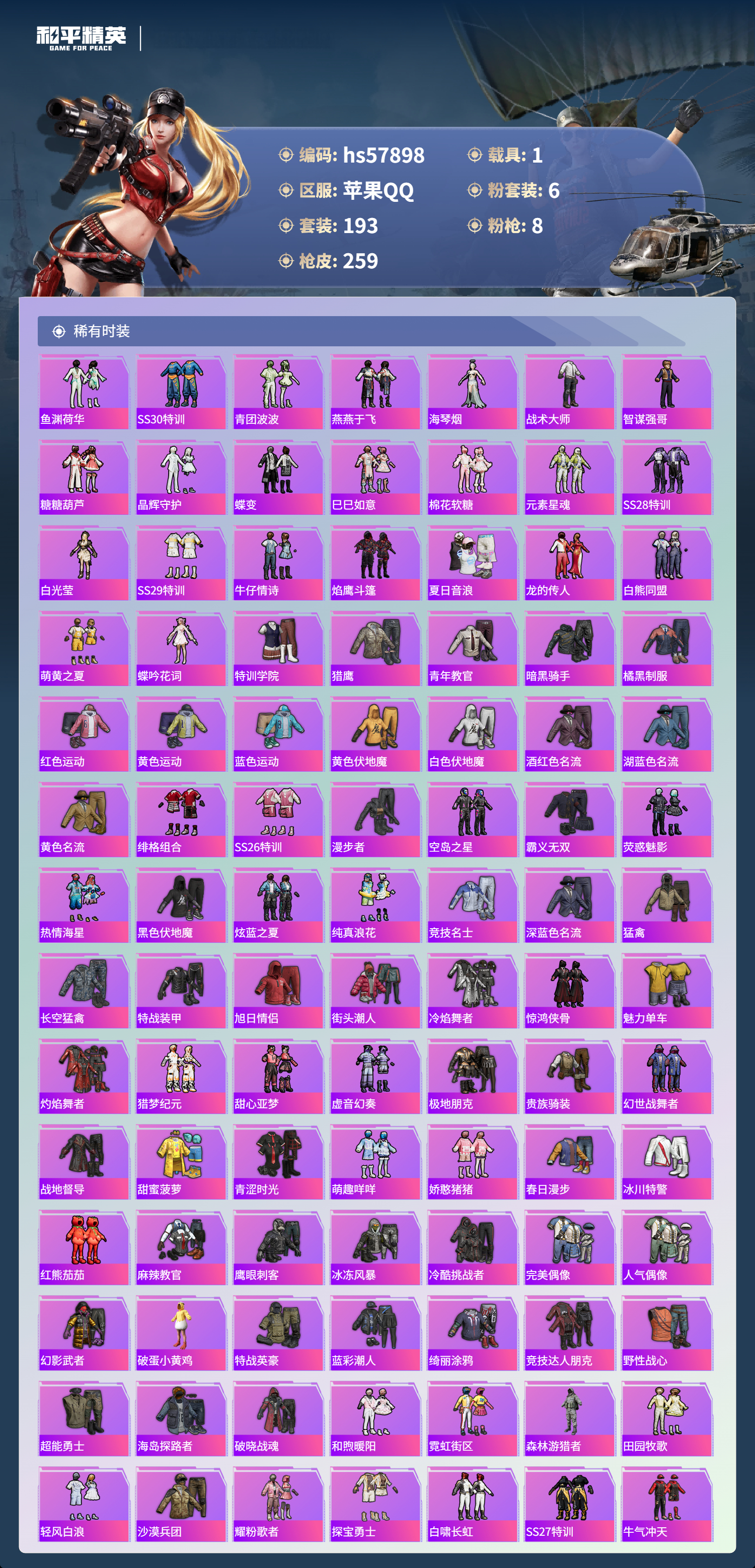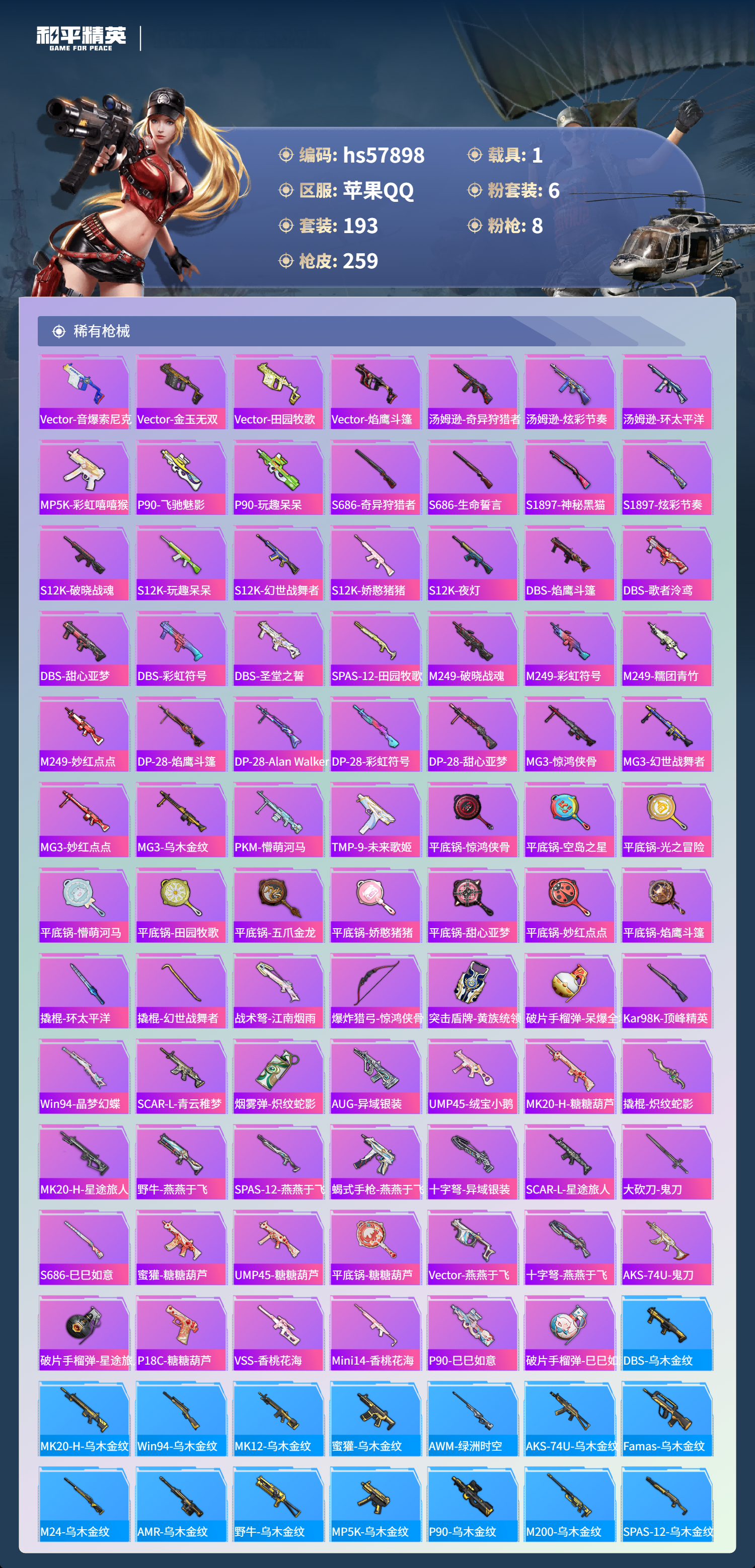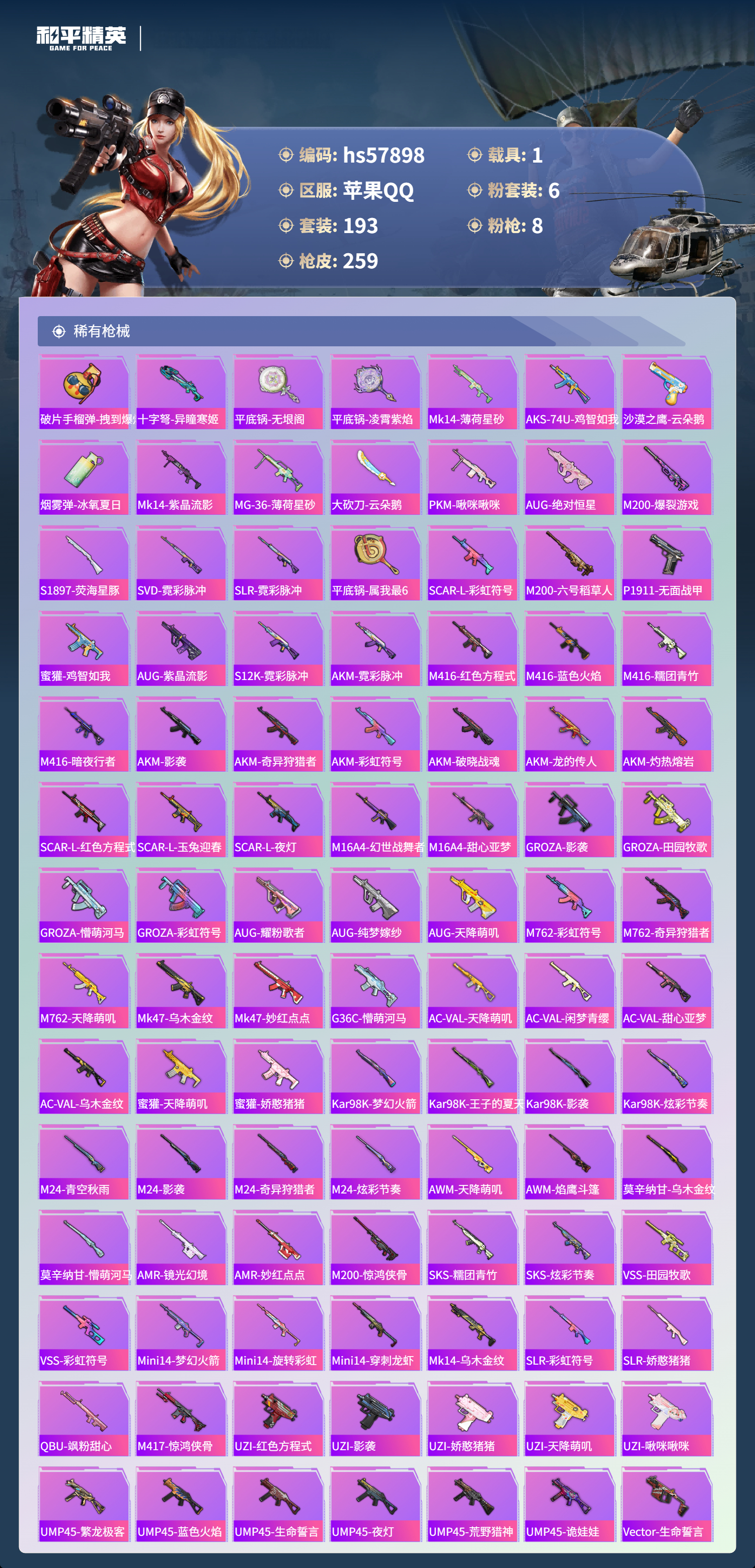 1载具-193套装-259呛皮-hs57898 苹果手q-12王牌印记-6粉装-8特效呛-1载具-77678热力值-193套装-259呛皮-5卓越印记-4传奇印记【6粉装】角色-千金淑猫角色-异瞳寒姬套装-音爆索尼克角色-初号机 觉醒ver.套装-梦幻火箭套装-星穹咏叹调【8特效呛】groza-镜光银凌/5级dp-28-豹影疾电/5级m416-五爪金龙/7级mk14-甜梦熊击/5级kar98k-巳巳如意/