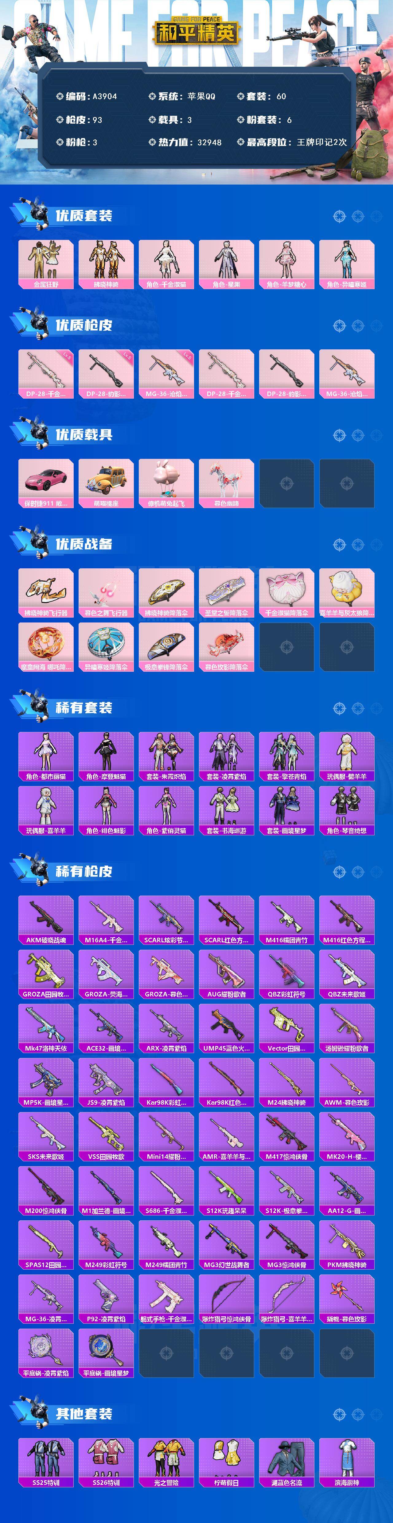 [15731169]苹果【公主号 角色-千金淑猫/角色-羊梦糖心/保时捷911 敞篷版(星珀红)/萌喵橘座/dp-28-千金淑猫/mg-36-沧焰双生】 手q-6粉装-3特效呛-3载具-3粉色飞行器-32948热力值-2王牌印记-60套装-93呛皮 【粉色套装】:粉装-金属狂野,粉装-拂晓神骑,角色-千金淑猫,角色-星渊,角色-羊梦糖心,角色-异瞳寒姬 【粉色呛皮等级】:dp-28-千金淑猫五级,dp-28-豹影疾电五级,mg-36-沧焰双生五级 【粉色载具】:保时捷911 敞篷版(星珀红),萌喵橘座,僚机-萌兔起飞,暮色幽蹄 【粉色呛皮】:dp-28-千金淑猫,dp-28-豹影疾电,mg-36-沧焰双生 【粉色飞行器】:拂晓神骑飞行器,暮色之舞飞行器 【粉色降落伞】:拂晓神骑降落伞,圣堂之誓降落伞,千金淑猫降落伞,喜羊羊与灰太狼降落伞,魔童闹海 哪吒降落伞,异瞳寒姬降落伞,极意拳锋降落伞,炫彩糖果降落伞,暮色玫影降落伞 【稀有套装】:角色-都市丽猫,角色-摩登魅猫,套装-朱霞炽焰,套装-凌霄紫焰,套装-擎苍青焰,玩偶服-懒羊羊,玩偶服-喜羊羊,角色-绯色魅影,角色-紫俏灵猫,套装-书海巡游,套装-画境星梦,套装-琴音绮想,套装-炫彩糖果 【稀有呛皮】:akm-破晓战魂,m16a4-千金淑猫,scar-l-炫彩节奏,scar-l-红色方程式,m416-糯团青竹,m416-红色方程式,groza-田园牧歌,groza-荧海星豚,groza-暮色玫影,aug-耀粉歌者,q-彩虹符号,q-未来歌姬,mk47-洛神天依,ace32-画境星梦,arx-凌霄紫焰,ump45-蓝色火焰,vect-田园牧歌,汤姆逊-耀粉歌者,mp5k-画境星梦,js9-凌霄紫焰,kar98k-彩虹符号,kar98k-红色方程式,m24-拂晓神骑,awm-暮色玫影,sks-未来歌姬,vss-田园牧歌,mini14-耀粉歌者,amr-喜羊羊与灰太狼,m417-惊鸿侠骨,mk20-h-樱桃泡泡,m200-惊鸿侠骨,m1加兰德-画境星梦,s686-千金淑猫,s12k-玩趣呆呆,s12k-极意拳锋,aa12-g-画境星梦,spas-12-田园牧歌,m249-彩虹符号,m249-糯团青竹,mg3-幻世战舞者,mg3-惊鸿侠骨,pkm-拂晓神骑,mg-36-凌霄紫焰,p92-凌霄紫焰,蝎式手呛-千金淑猫,