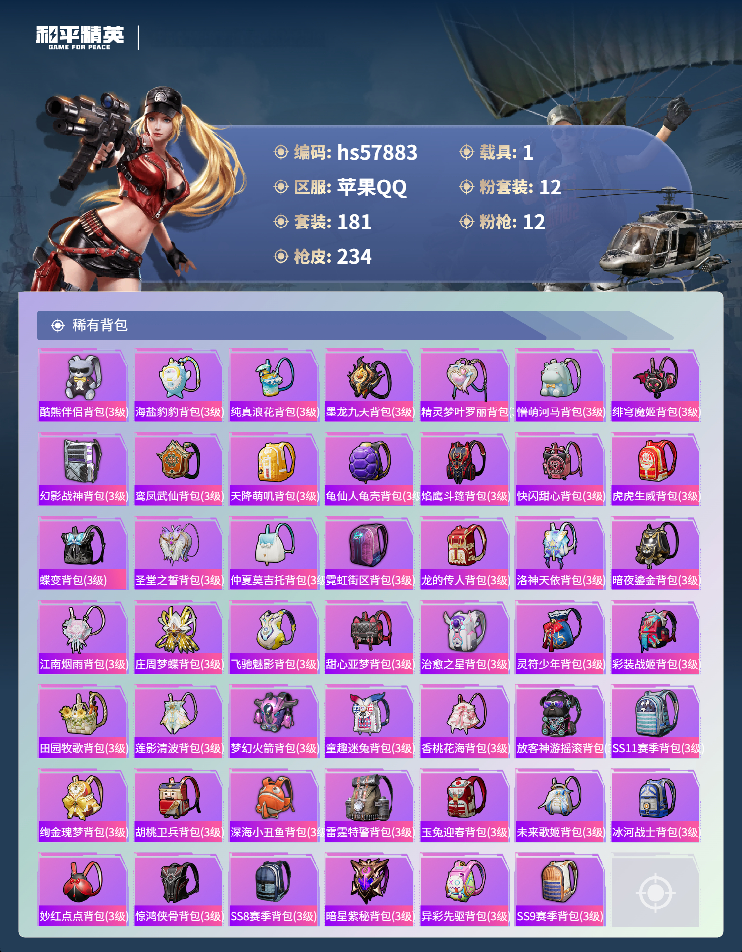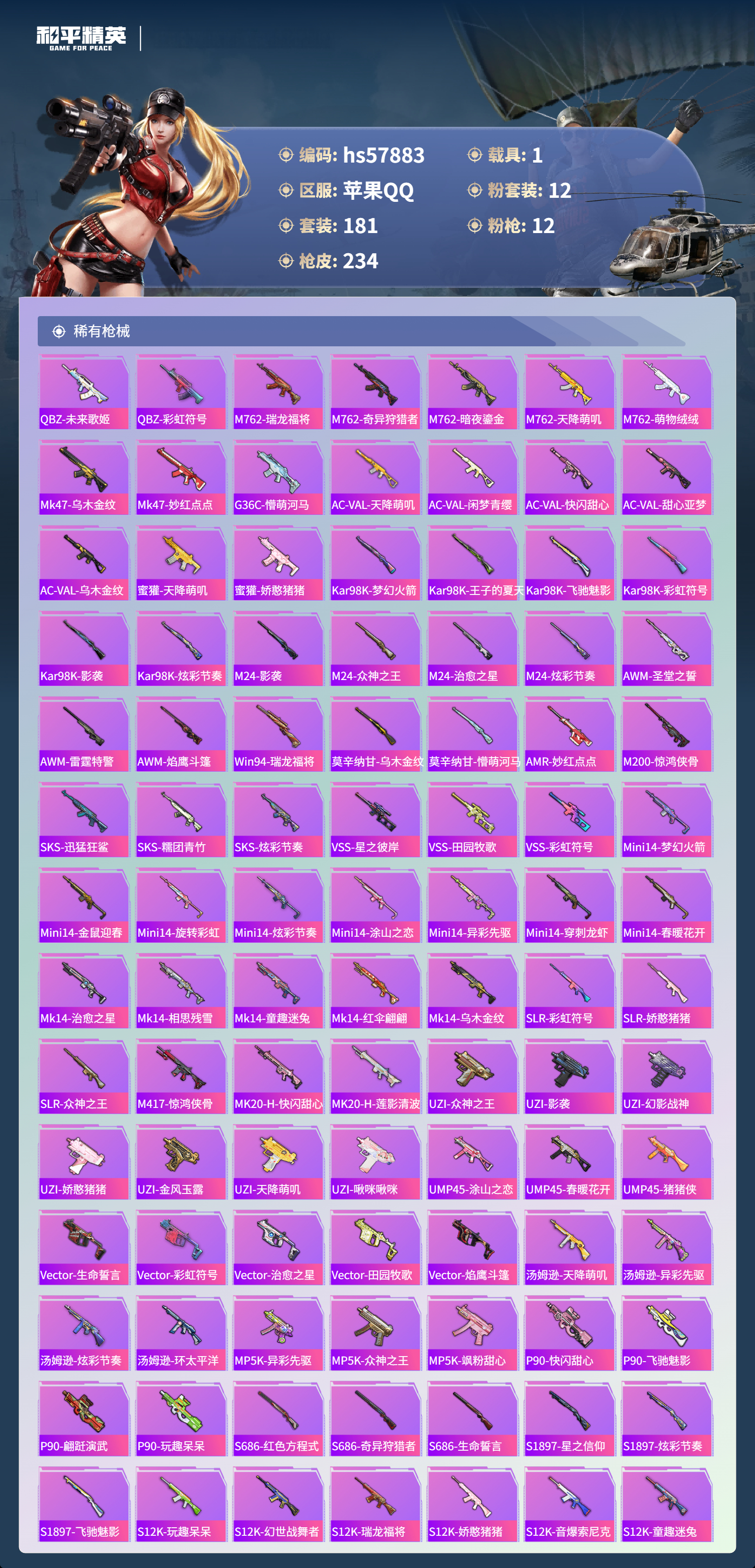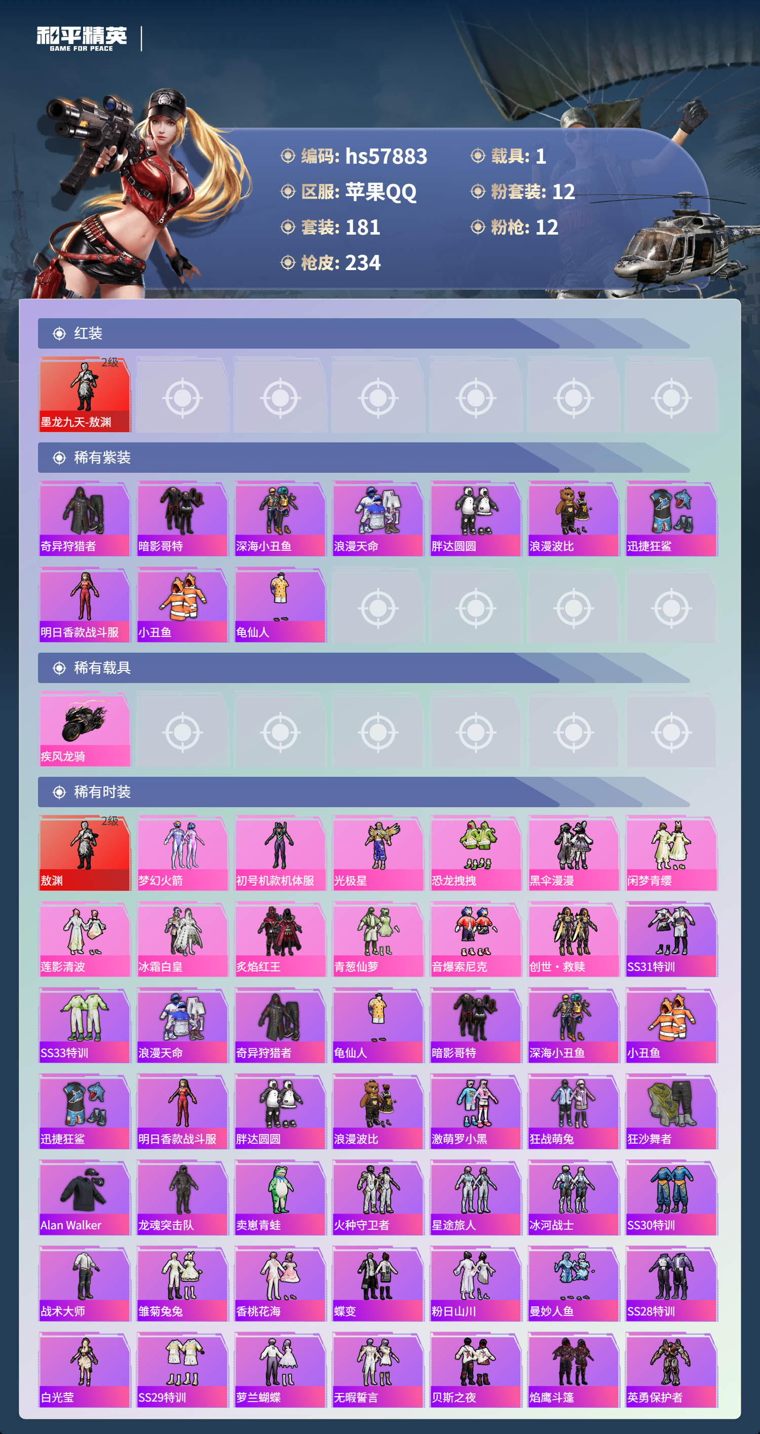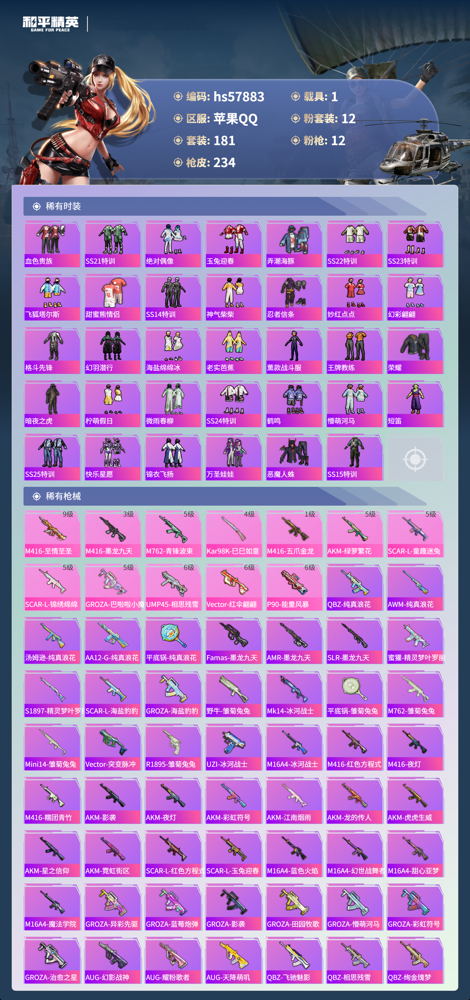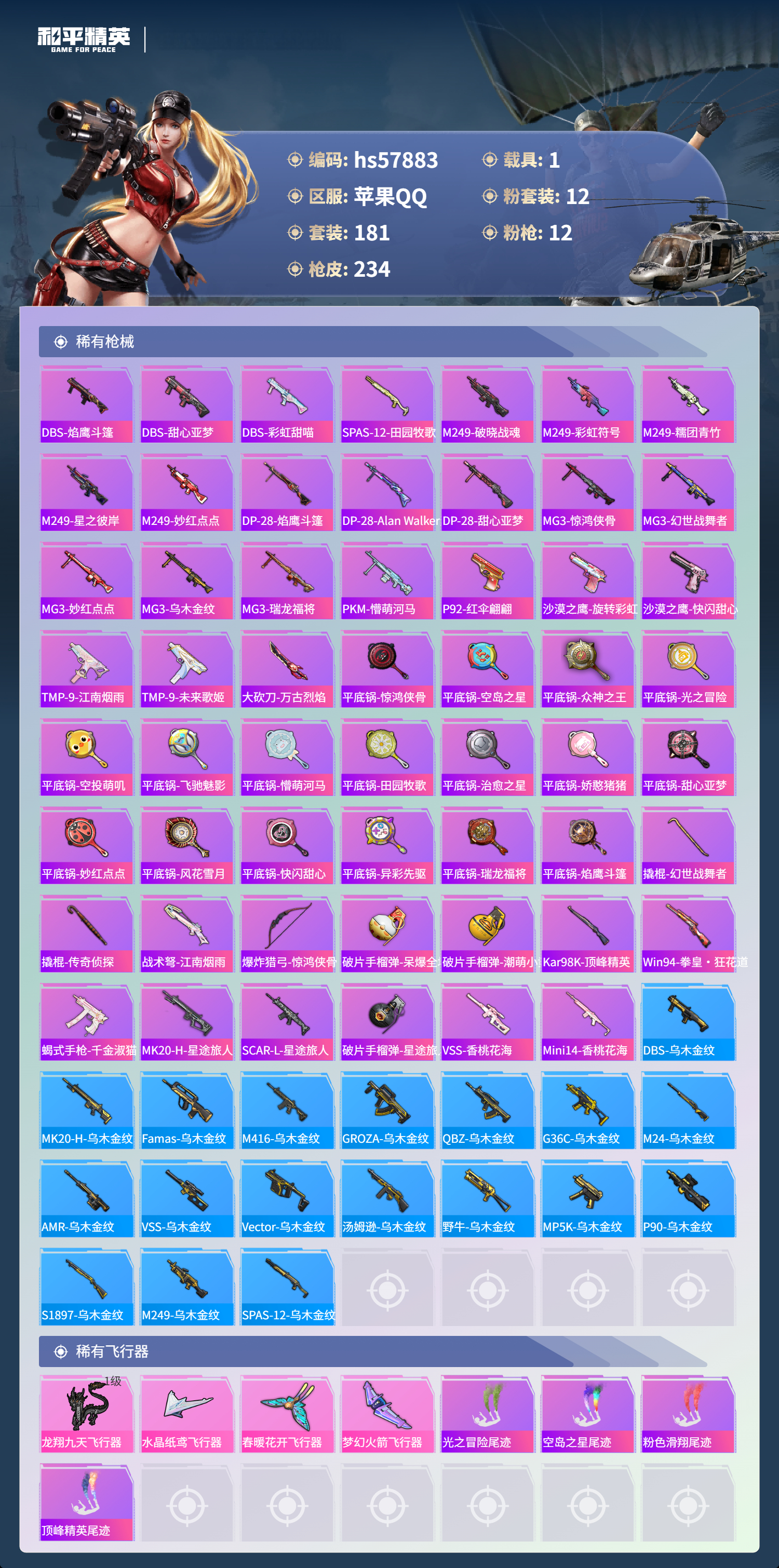1载具-181套装-234呛皮-hs57883 苹果手q-6王牌印记-1红装-12粉装-12特效呛-1载具-84252热力值-181套装-234呛皮【1红装】墨龙九天-敖渊/2级【12粉装】角色-初号机款机体服套装-创世·救赎套装-音爆索尼克套装-冰霜白皇套装-莲影清波套装-黑伞漫漫套装-炙焰红王角色-光极星套装-青葱仙萝套装-闲梦青缨套装-恐龙拽拽套装-梦幻火箭【12特效呛】ump45-相思残雪/