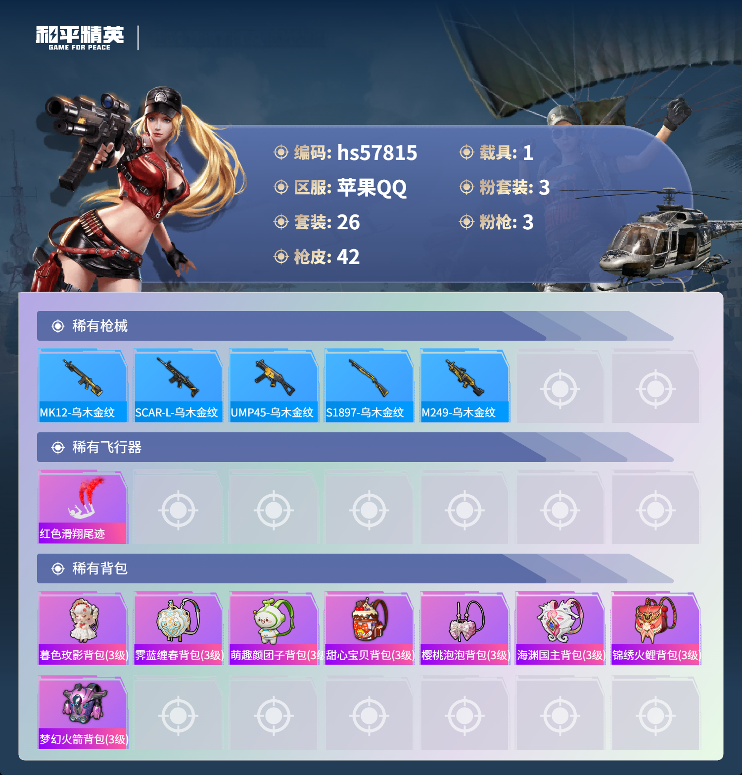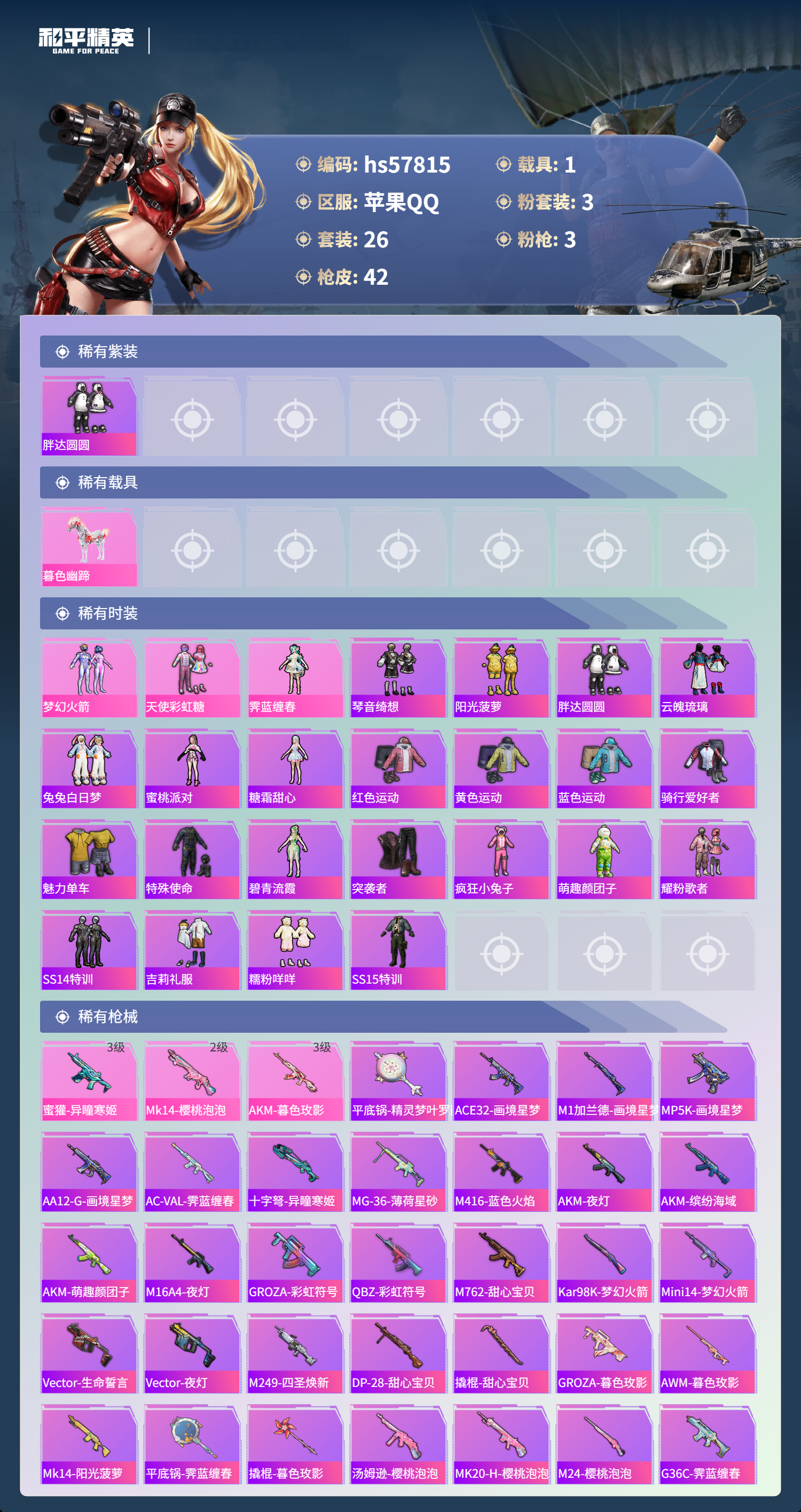 1载具-26套装-42呛皮-hs57815 苹果手q-0王牌印记-3粉装-3特效呛-1载具-14939热力值-26套装-42呛皮【3粉装】套装-天使彩虹糖套装-梦幻火箭角色-霁蓝缠春【3特效呛】蜜獾-异瞳寒姬/3级akm-暮色玫影/3级mk14-樱桃泡泡/2级【1稀有紫装】胖达圆圆【1稀有载具】暮色幽蹄【25稀有时装】梦幻火箭天使彩虹糖琴音绮想阳光菠萝胖达圆圆云魄琉璃兔兔白日梦蜜桃派对糖霜