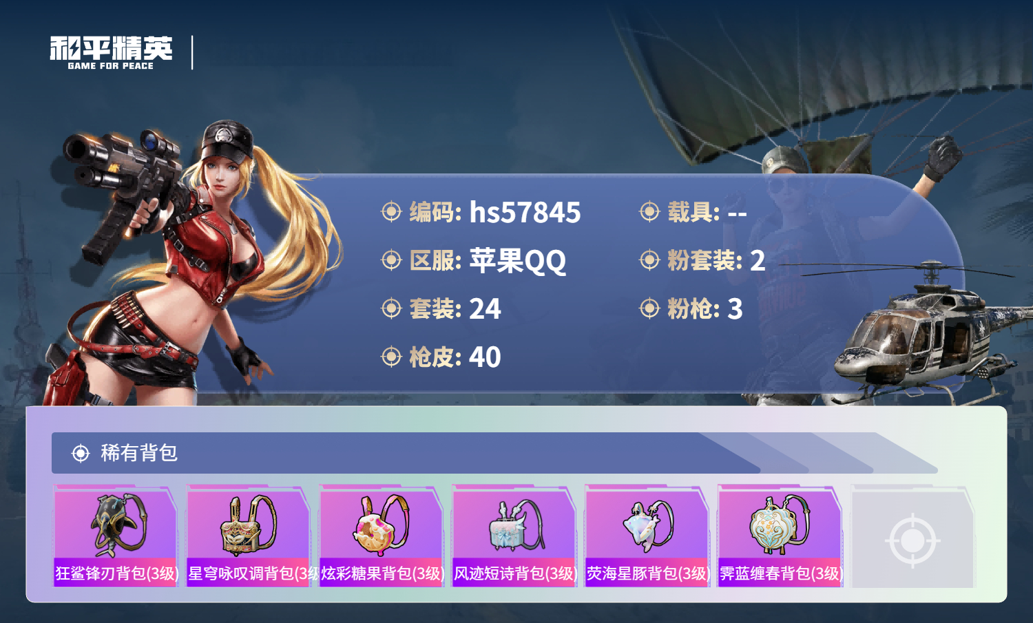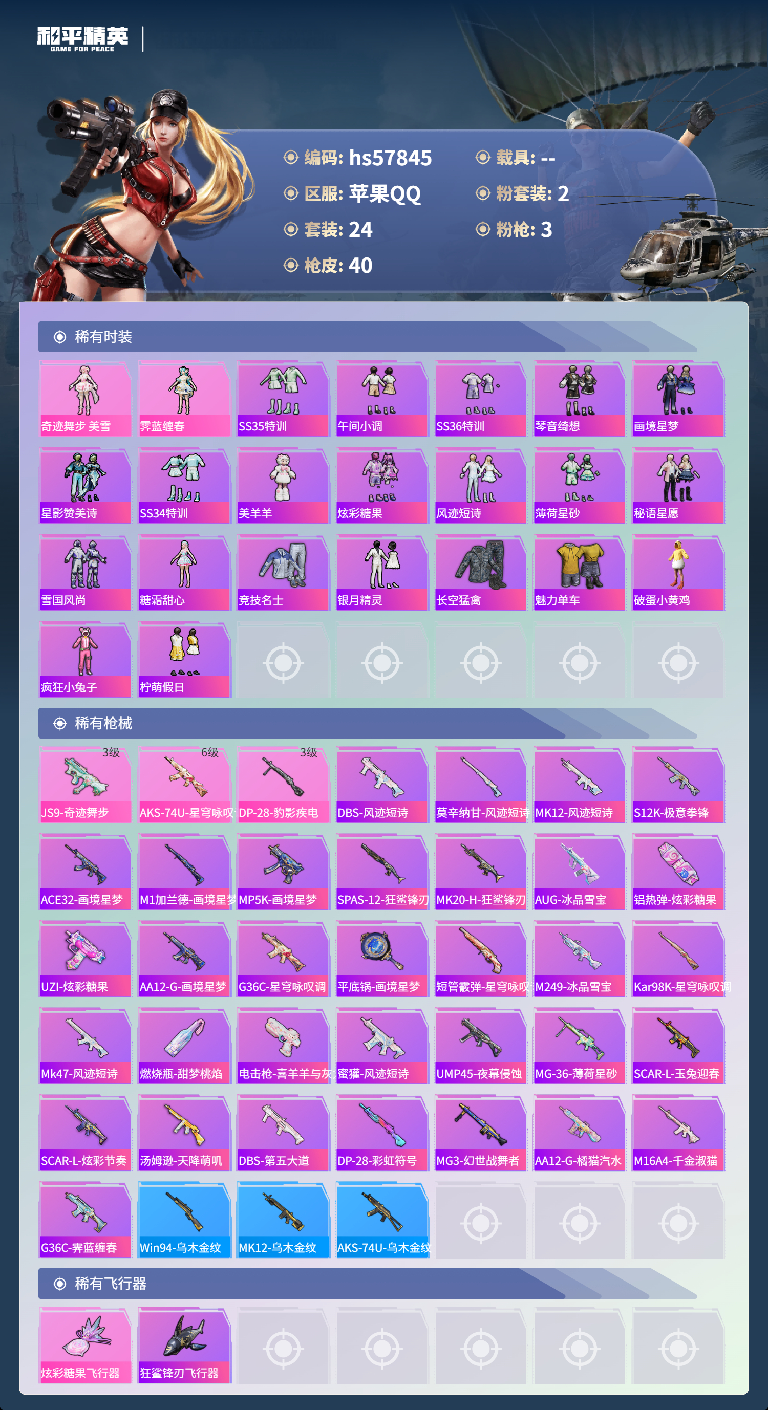 0载具-24套装-40呛皮-hs57845 苹果手q-2王牌印记-2粉装-3特效呛-12125热力值-24套装-40呛皮【2粉装】角色-奇迹舞步 美雪角色-霁蓝缠春【3特效呛】dp-28-豹影疾电/3级js9-奇迹舞步/3级aks-74u-星穹咏叹调/6级【23稀有时装】奇迹舞步 美雪ss35特训午间小调ss36特训琴音绮想画境星梦星影赞美诗ss34特训美羊羊炫彩糖果风迹短诗薄荷星砂秘语