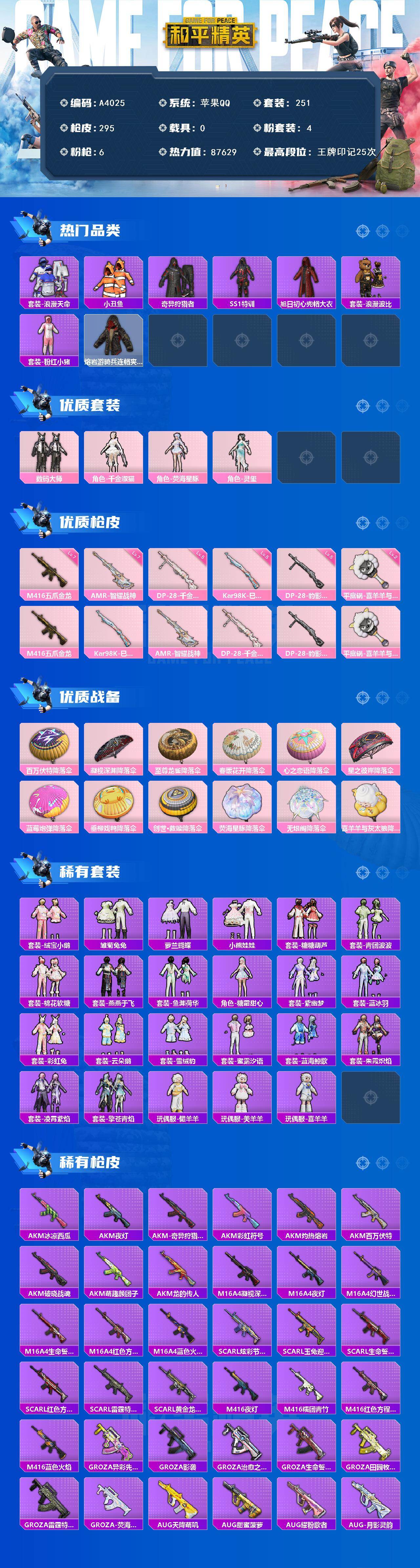 [15732359]苹果【小号 粉装-数码大师/角色-千金淑猫/m416-五爪金龙/kar98k-巳巳如意/amr-智耀战神/角色-灵玺】 手q-4粉装-6特效呛-0载具-0粉色飞行器-87629热力值-25王牌印记-251套装-295呛皮 【热门品类】:套装-浪漫天命,套装-小丑鱼,套装-奇异狩猎者,套装-ss1特训,旭日初心兜帽大衣,套装-浪漫波比,套装-粉红小猪,熔岩游骑兵连帽夹克 【粉色套装】:粉装-数码大师,角色-千金淑猫,角色-荧海星豚,角色-灵玺 【粉色呛皮等级】:m416-五爪金龙七级,kar98k-巳巳如意五级,amr-智耀战神七级,dp-28-千金淑猫五级,dp-28-豹影疾电五级,平底锅-喜羊羊与灰太狼二级 【粉色呛皮】:m416-五爪金龙,kar98k-巳巳如意,amr-智耀战神,dp-28-千金淑猫,dp-28-豹影疾电,平底锅-喜羊羊与灰太狼 【粉色降落伞】:百万伏特降落伞,凝视深渊降落伞,至尊龙雀降落伞,春暖花开降落伞,心之恋语降落伞,星之彼岸降落伞,蓝莓炮弹降落伞,垂柳戏鸭降落伞,创世·救赎降落伞,荧海星豚降落伞,无垠阁降落伞,喜羊羊与灰太狼降落伞 【稀有套装】:套装-绒宝小鹅,套装-雏菊兔兔,套装-萝兰蝴蝶,套装-小熊娃娃,套装-糖糖葫芦,套装-青团波波,套装-棉花软糖,套装-燕燕于飞,套装-鱼渊荷华,角色-糖霜甜心,套装-紫幽梦,套装-蓝冰羽,套装-彩虹兔,套装-云朵鹅,套装-雪绒豹,套装-蜜露汐语,套装-蓝海鲸歌,套装-朱霞炽焰,套装-凌霄紫焰,套装-擎苍青焰,玩偶服-懒羊羊,玩偶服-美羊羊,玩偶服-喜羊羊 【稀有呛皮】:akm-冰凉西瓜,akm-夜灯,akm-奇异狩猎者,akm-彩虹符号,akm-灼热熔岩,akm-百万伏特,akm-破晓战魂,akm-萌趣颜团子,akm-龙的传人,m16a4-凝视深渊,m16a4-夜灯,m16a4-幻世战舞者,m16a4-生命誓言,m16a4-红色方程式,m16a4-蓝色火焰,scar-l-炫彩节奏,scar-l-玉兔迎春,scar-l-生命誓言,scar-l-红色方程式,scar-l-雷霆特警,scar-l-黄金龙骨,m416-夜灯,m416-糯团青竹,m416-红色方程式,m416-蓝色火焰,groza-异彩先驱,groza-影袭,groza-治愈之星,groza-生命誓言,groza