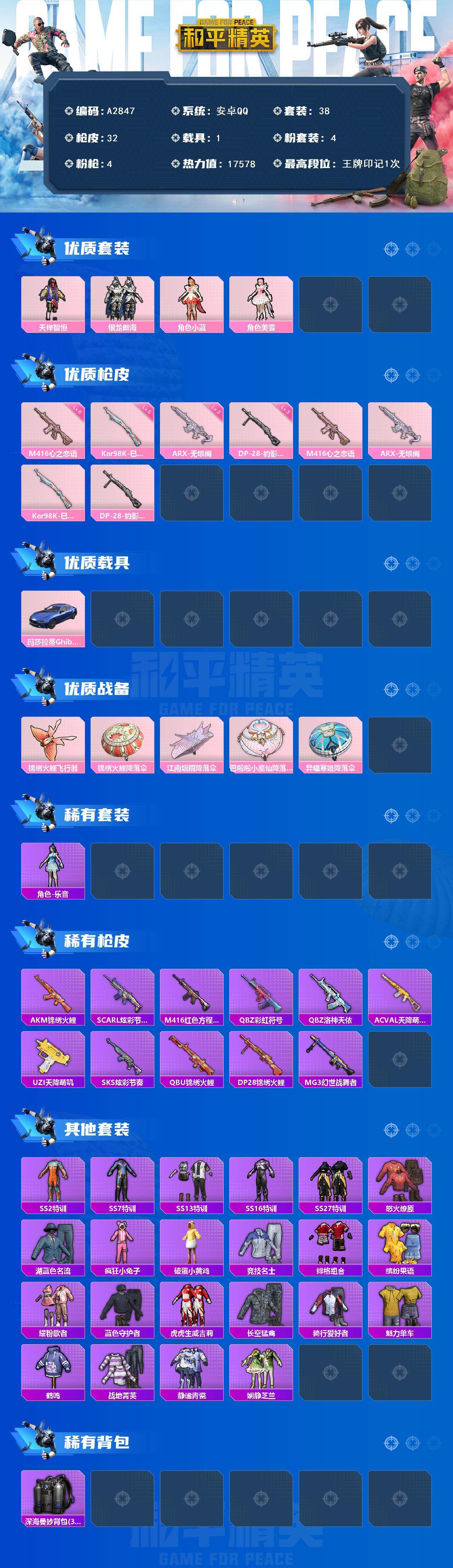 [15732383]安卓【小号/玛莎拉蒂ghibli(蓝)/m416-心之恋语六级】 手q-4粉装-4特效呛-1载具-1粉色飞行器-17578热力值-1王牌印记-38套装-32呛皮 【粉色套装】:粉装-天禅智恒,粉装-银龙傲海,角色-小蓝,角色-美雪 【粉色呛皮等级】:m416-心之恋语六级,arx-无垠阁三级,kar98k-巳巳如意五级,dp-28-豹影疾电三级 【粉色载具】:玛莎拉蒂ghibli(蓝) 【粉色呛皮】:m416-心之恋语,arx-无垠阁,kar98k-巳巳如意,dp-28-豹影疾电 【粉色飞行器】:锦绣火鲤飞行器 【粉色降落伞】:锦绣火鲤降落伞,江南烟雨降落伞,巴啦啦小魔仙降落伞,异瞳寒姬降落伞 【稀有套装】:角色-乐音 【稀有呛皮】:akm-锦绣火鲤,scar-l-炫彩节奏,m416-红色方程式,q-彩虹符号,q-洛神天依,ac-val-天降萌叽,uzi-天降萌叽,sks-炫彩节奏,qbu-锦绣火鲤,dp-28-锦绣火鲤,mg3-幻世战舞者 【其他套装】:套装-ss2特训,套装-ss7特训,套装-ss13特训,套装-ss16特训,套装-ss27特训,套装-怒火燎原,套装-湖蓝色名流,套装-疯狂小兔子,套装-破蛋小黄鸡,套装-竞技名士,套装-绯格组合,套装-缤纷果语,套装-耀粉歌者,套装-蓝色守护者,套装-虎虎生威吉莉,套装-长空猛禽,套装-骑行爱好者,套装-魅力单车,套装-鹤鸣,套装-战地菁英,套装-静谧青瓷,套装-娴静芝兰 【稀有背包】:深海曼妙背包3级 【营地id】:780846526