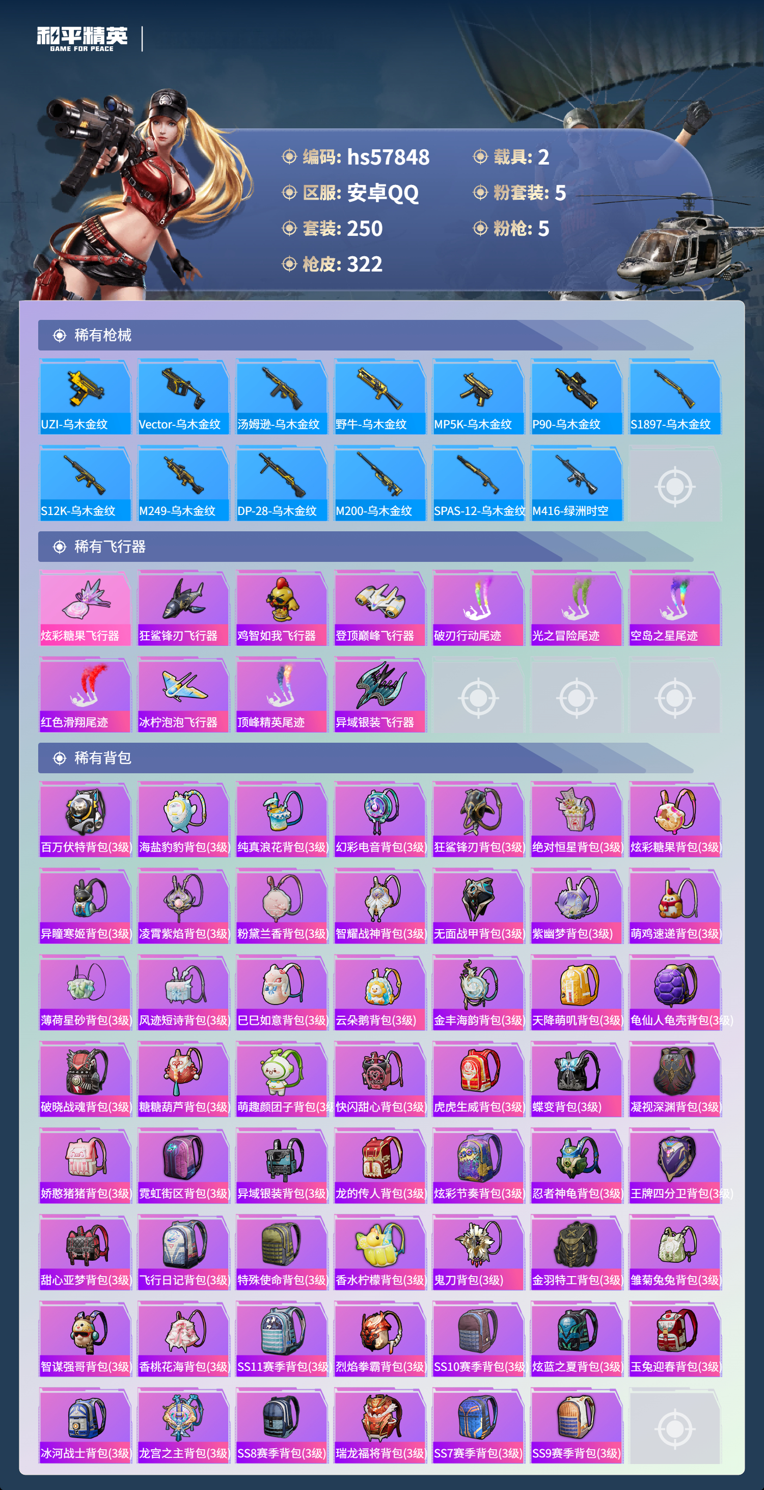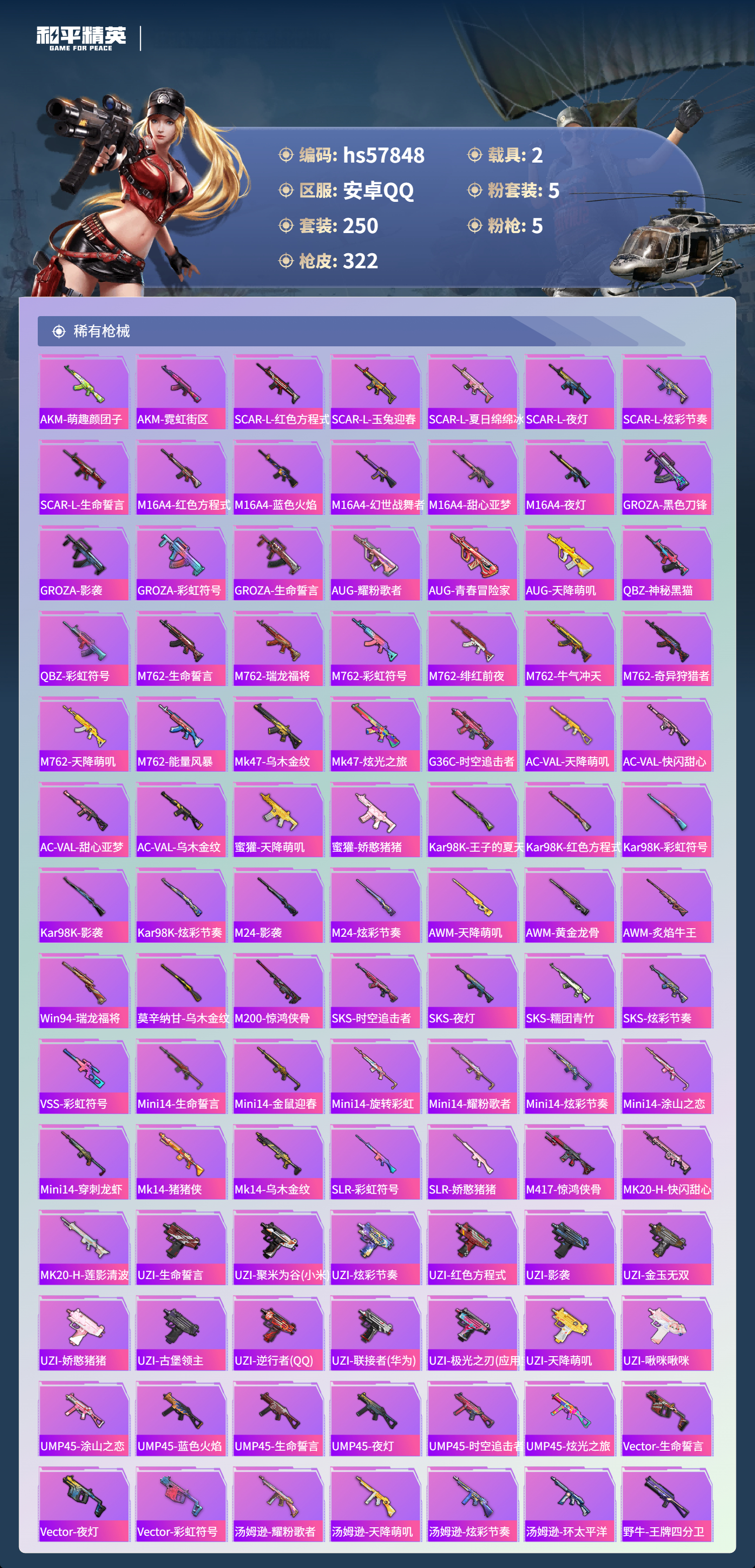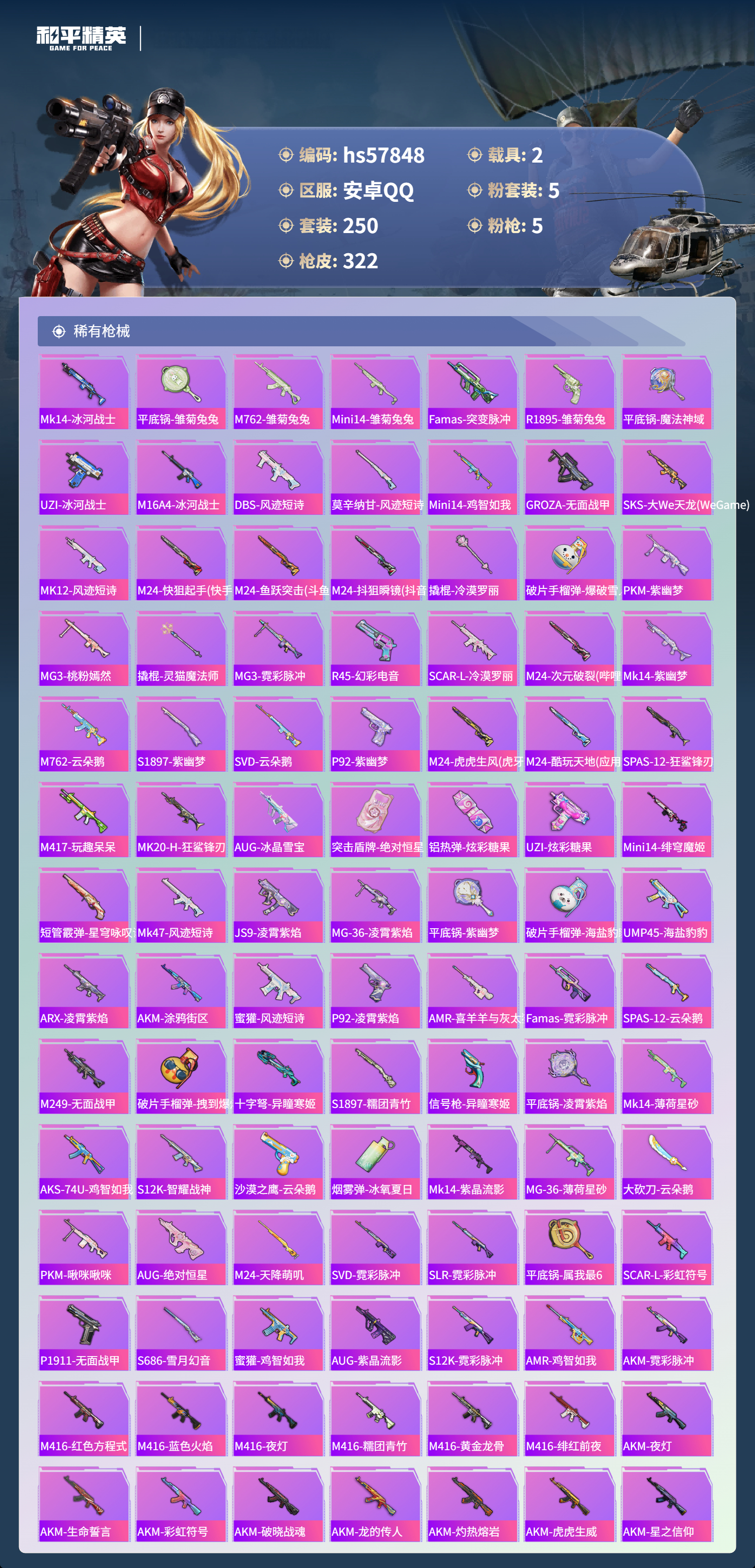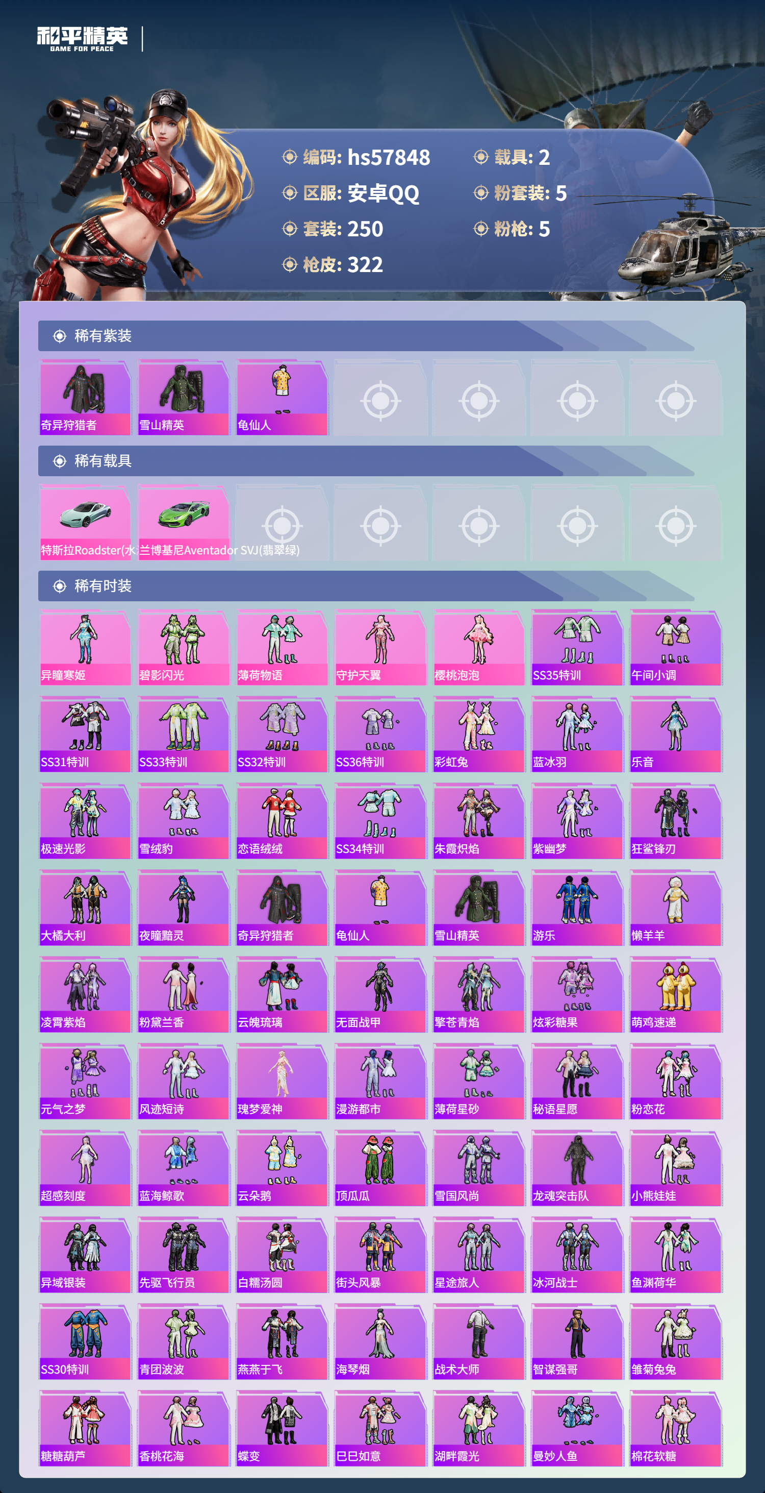 2载具-250套装-322呛皮-hs57848 安卓手q-20王牌印记-5粉装-5特效呛-2载具-98949热力值-250套装-322呛皮-13卓越印记-1传奇印记【5粉装】角色-异瞳寒姬角色-守护天翼角色-樱桃泡泡套装-薄荷物语套装-碧影闪光【5特效呛】m416-心之恋语/7级蜜獾-异瞳寒姬/7级mk14-精灵梦叶罗丽/7级dp-28-豹影疾电/5级kar98k-巳巳如意/5级【3稀有紫装】奇异狩猎者