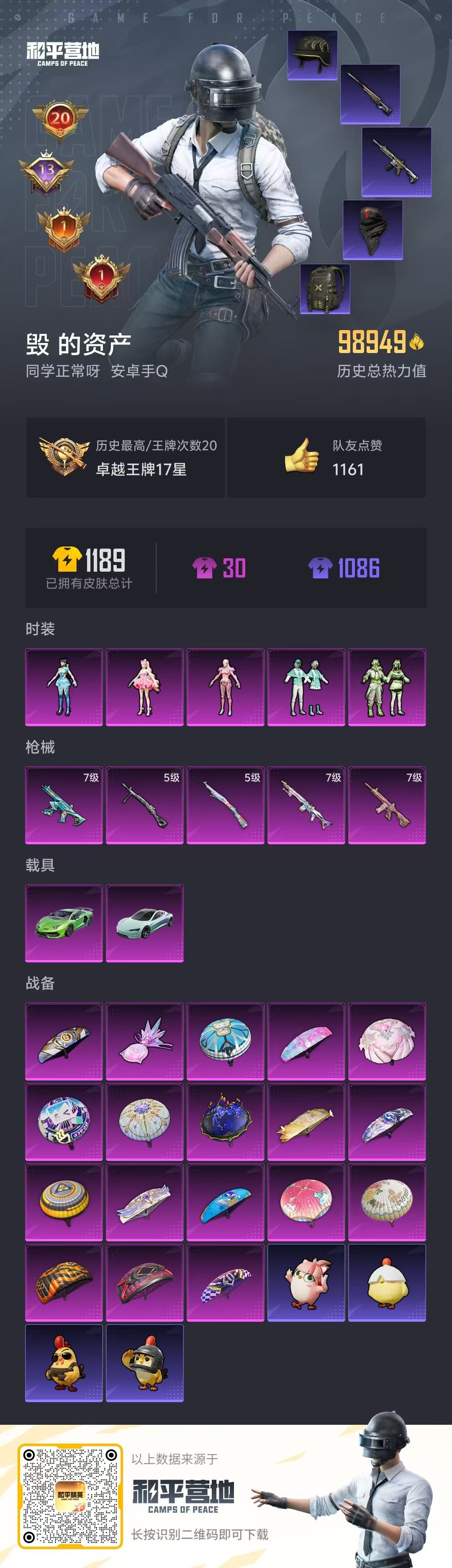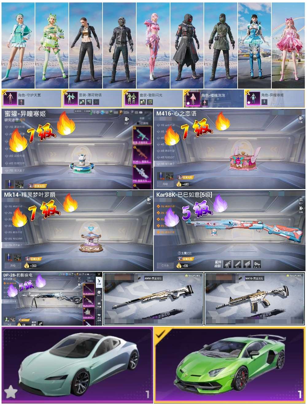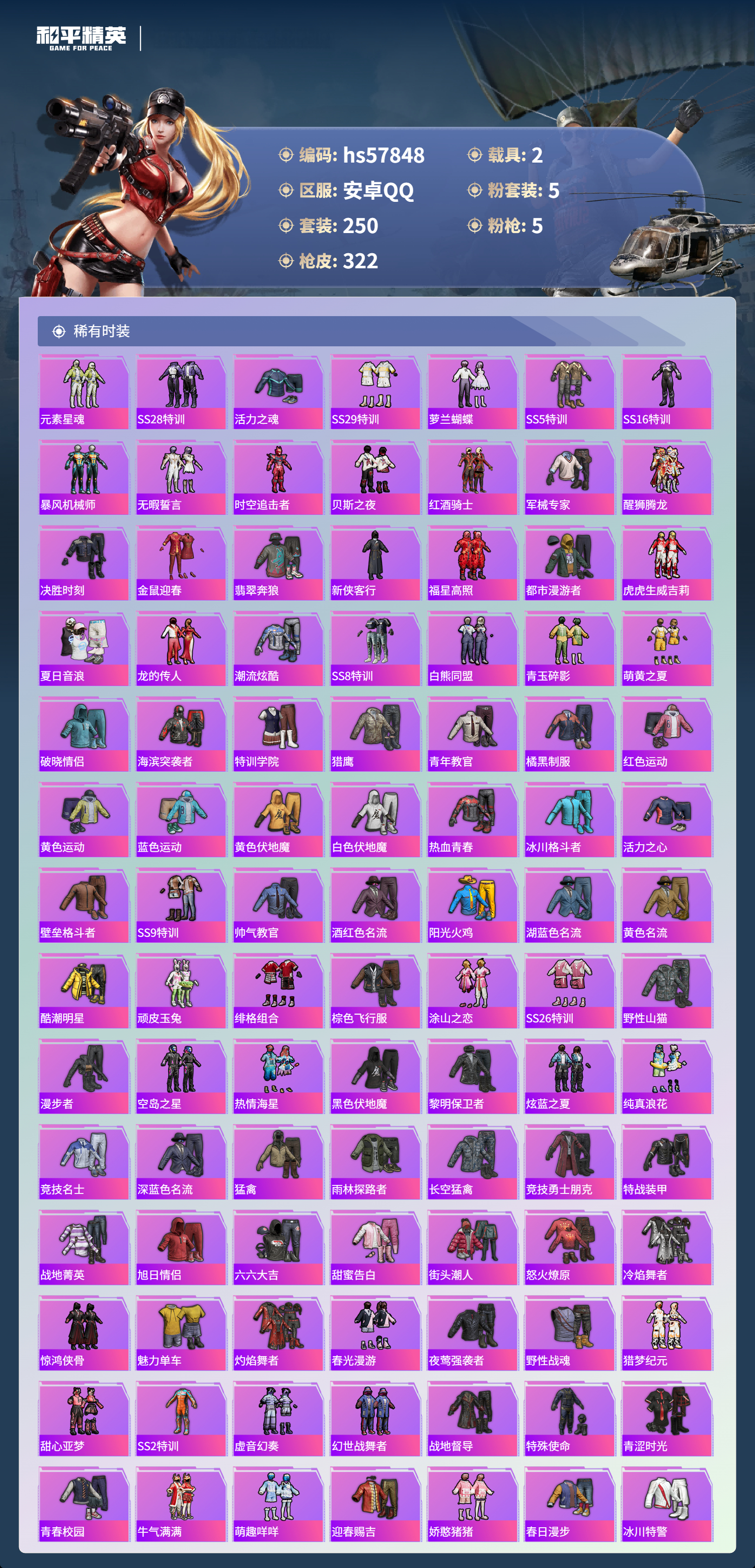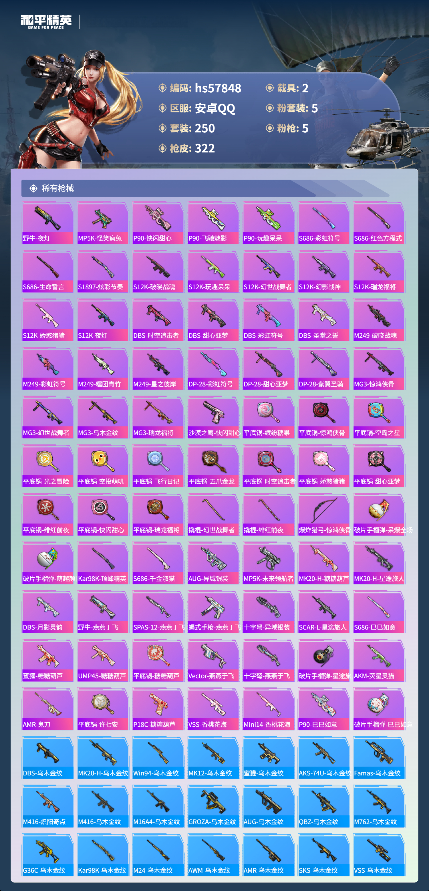 2载具-250套装-322呛皮-hs57848 安卓手q-20王牌印记-5粉装-5特效呛-2载具-98949热力值-250套装-322呛皮-13卓越印记-1传奇印记【5粉装】角色-异瞳寒姬角色-守护天翼角色-樱桃泡泡套装-薄荷物语套装-碧影闪光【5特效呛】m416-心之恋语/7级蜜獾-异瞳寒姬/7级mk14-精灵梦叶罗丽/7级dp-28-豹影疾电/5级kar98k-巳巳如意/5级【3稀有紫装】奇异狩猎者