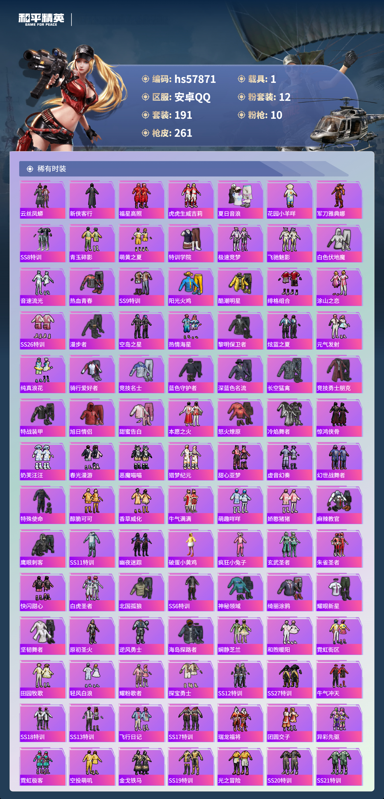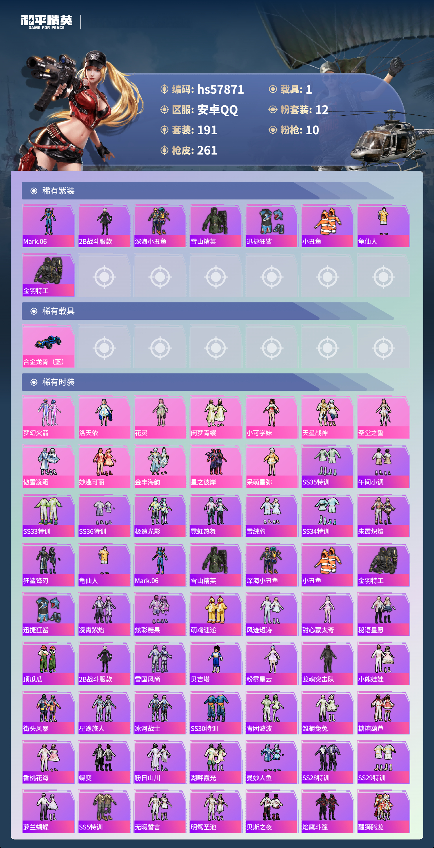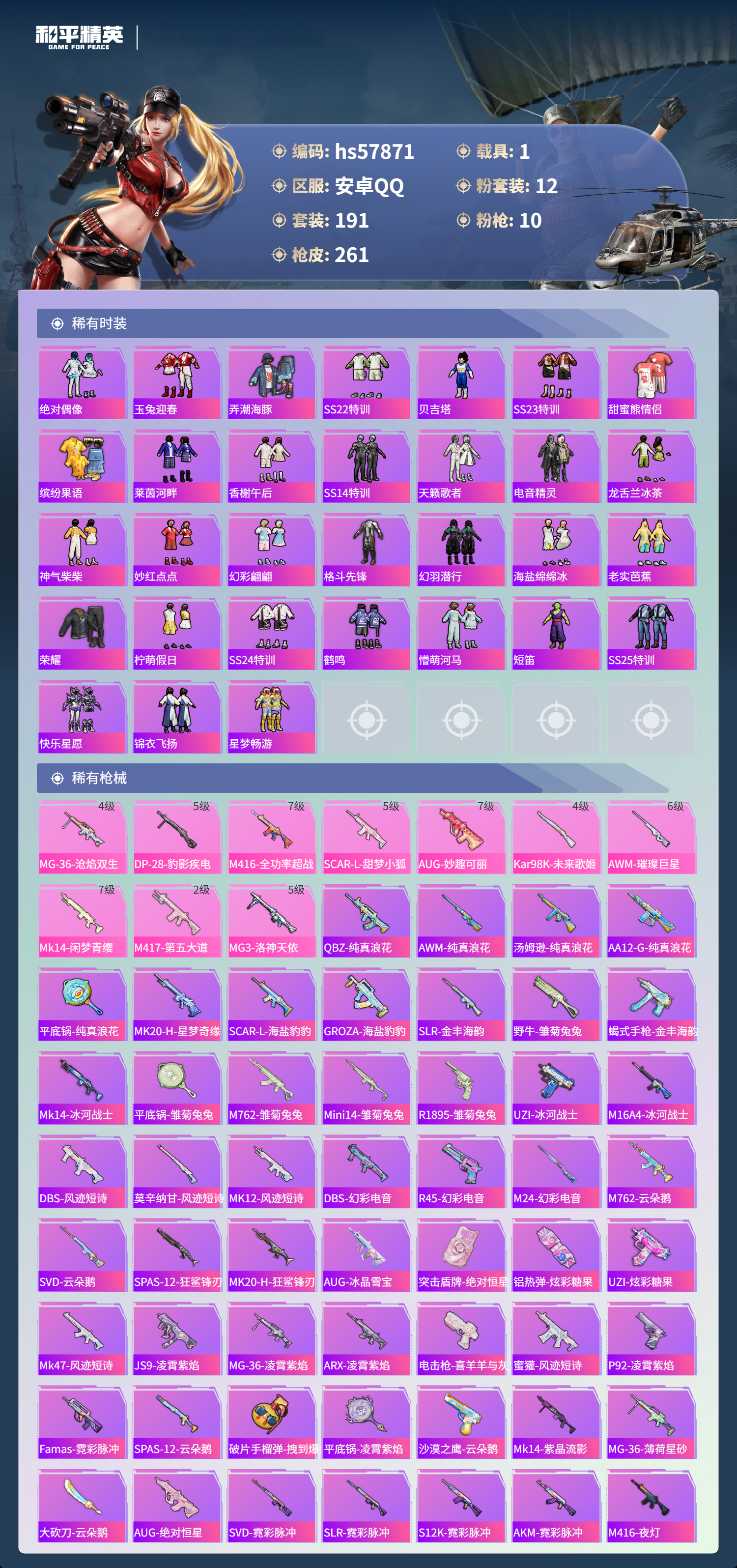 1载具-191套装-261呛皮-hs57871 安卓手q-12王牌印记-12粉装-10特效呛-1载具-93016热力值-191套装-261呛皮-3卓越印记-2传奇印记【12粉装】套装-闲梦青缨角色-小可学妹角色-圣堂之誓套装-金丰海韵套装-妙趣可丽套装-梦幻火箭角色-呆萌星弥套装-天星战神套装-傲雪凌霜套装-星之彼岸角色-洛天依角色-花灵【10特效呛】kar98k-未来歌姬/4级awm-璀璨巨星/6
