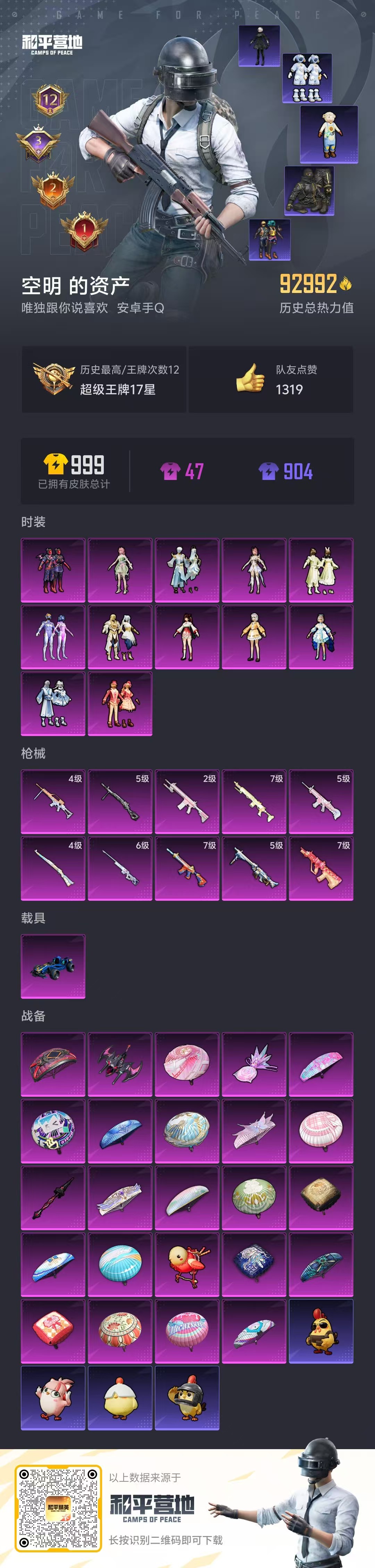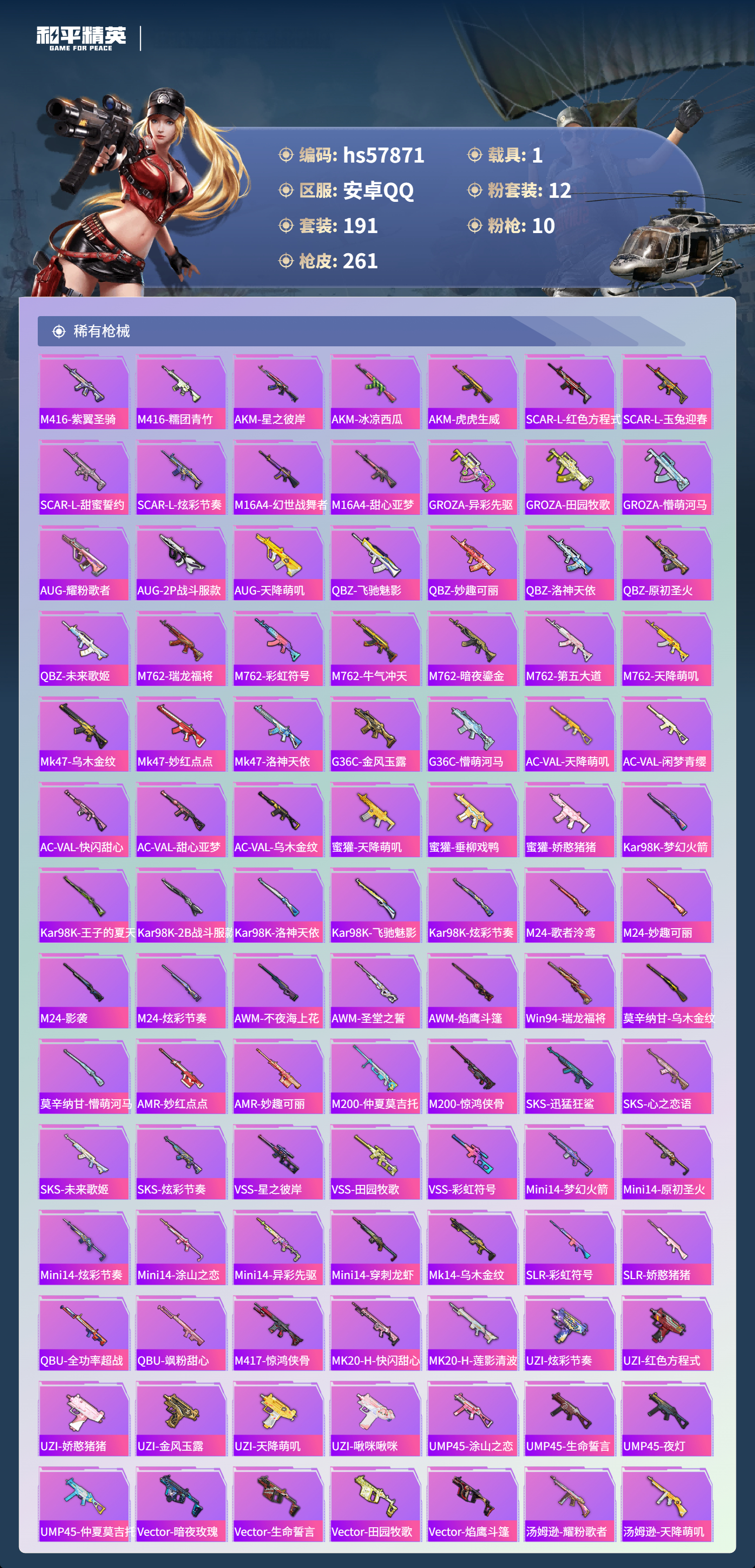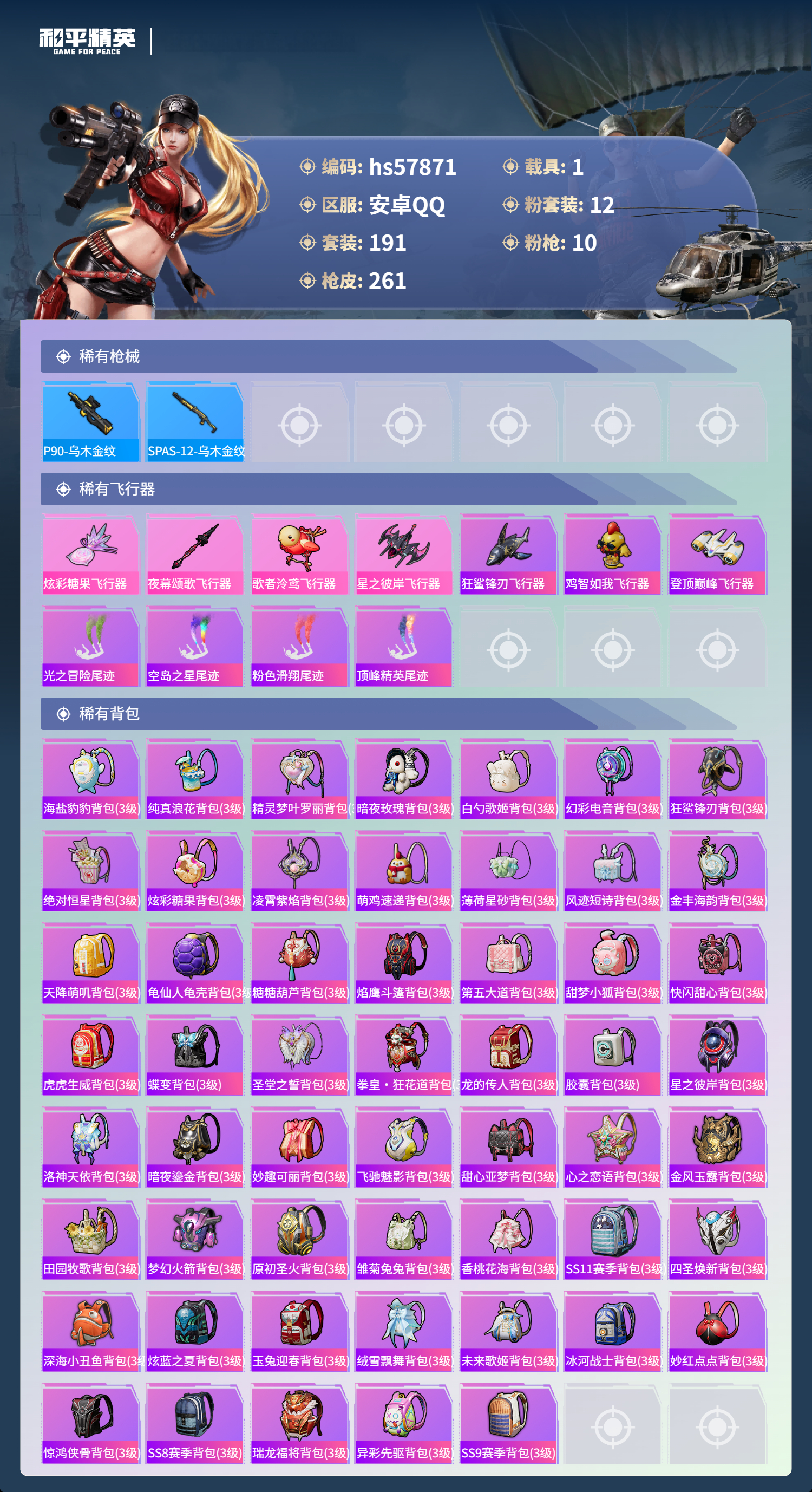 1载具-191套装-261呛皮-hs57871 安卓手q-12王牌印记-12粉装-10特效呛-1载具-93016热力值-191套装-261呛皮-3卓越印记-2传奇印记【12粉装】套装-闲梦青缨角色-小可学妹角色-圣堂之誓套装-金丰海韵套装-妙趣可丽套装-梦幻火箭角色-呆萌星弥套装-天星战神套装-傲雪凌霜套装-星之彼岸角色-洛天依角色-花灵【10特效呛】kar98k-未来歌姬/4级awm-璀璨巨星/6