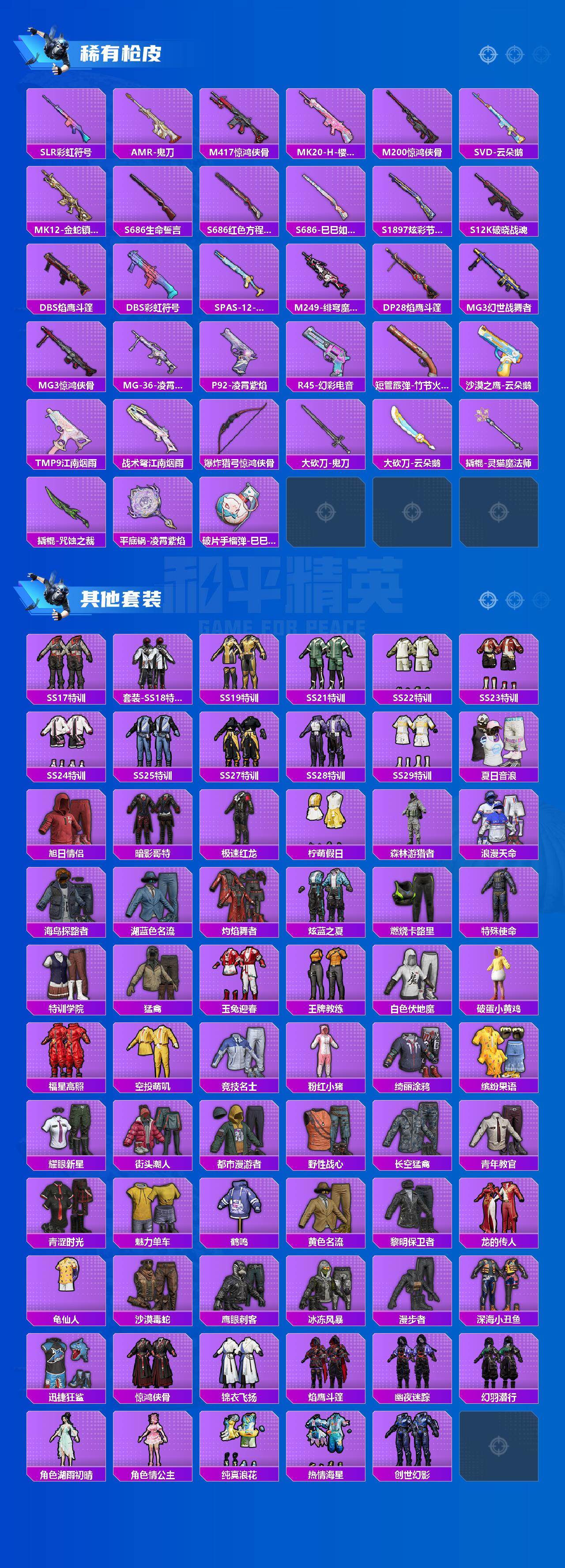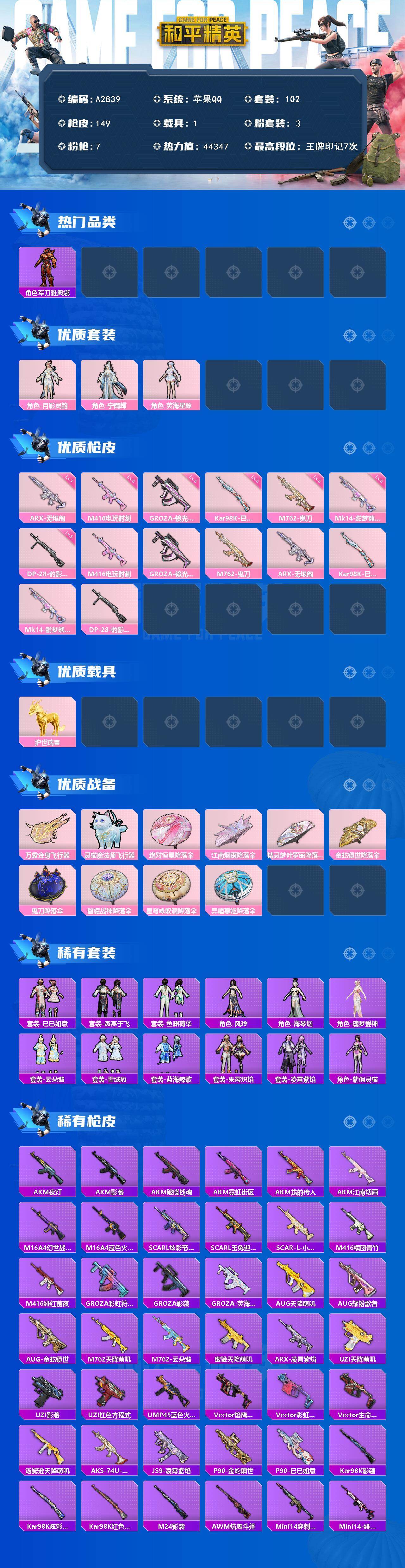 [15732595]苹果 手q【小号/护世瑞兽/暗影哥特】-3粉装-7特效呛-1载具-4粉色飞行器-44347热力值-7王牌印记-102套装-149呛皮 【热门品类】:套装-浪漫天命,套装-深海小丑鱼,角色-军刀雅典娜,套装-龟仙人,套装-暗影哥特,套装-粉红小猪 【粉色套装】:角色-月影灵韵,角色-宁雨蝶,角色-荧海星豚 【粉色呛皮等级】:m416-电玩时刻五级,groza-镜光银凌五级,m762-鬼刀五级,arx-无垠阁七级,kar98k-巳巳如意五级,mk14-甜梦熊击五级,dp-28-豹影疾电五级 【粉色载具】:护世瑞兽 【粉色呛皮】:m416-电玩时刻,groza-镜光银凌,m762-鬼刀,arx-无垠阁,kar98k-巳巳如意,mk14-甜梦熊击,dp-28-豹影疾电 【粉色飞行器】:万象金身飞行器,灵猫魔法师飞行器 【粉色降落伞】:绝对恒星降落伞,江南烟雨降落伞,精灵梦叶罗丽降落伞,金蛇镇世降落伞,鬼刀降落伞,智耀战神降落伞,星穹咏叹调降落伞,异瞳寒姬降落伞,炫彩糖果降落伞 【稀有套装】:套装-龟仙人,套装-巳巳如意,套装-雪国风尚,套装-燕燕于飞,套装-鱼渊荷华,角色-风玲,角色-海琴烟,角色-瑰梦爱神,套装-云朵鹅,套装-雪绒豹,套装-蓝海鲸歌,套装-朱霞炽焰,套装-凌霄紫焰,角色-紫俏灵猫,套装-炫彩糖果 【稀有呛皮】:aug-冰晶雪宝,akm-夜灯,akm-影袭,akm-江南烟雨,akm-破晓战魂,akm-霓虹街区,akm-龙的传人,m16a4-幻世战舞者,m16a4-蓝色火焰,scar-l-炫彩节奏,scar-l-玉兔迎春,scar-l-小狗蛇点点,m416-糯团青竹,m416-绯红前夜,groza-彩虹符号,groza-影袭,groza-荧海星豚,aug-天降萌叽,aug-耀粉歌者,aug-金蛇镇世,m762-天降萌叽,m762-云朵鹅,蜜獾-天降萌叽,arx-凌霄紫焰,uzi-天降萌叽,uzi-影袭,uzi-红色方程式,ump45-蓝色火焰,vect-焰鹰斗篷,vect-彩虹符号,vect-生命誓言,汤姆逊-天降萌叽,aks-74u-鬼刀,aks-74u-极光猎影,js9-凌霄紫焰,p90-金蛇镇世,p90-巳巳如意,kar98k-影袭,kar98k-炫彩节奏,kar98k-红色方程式,m24-影袭,awm-焰鹰斗篷