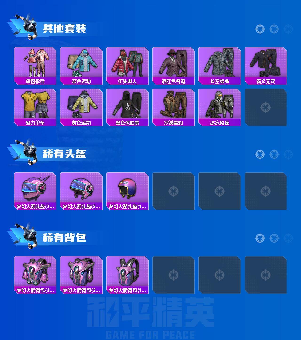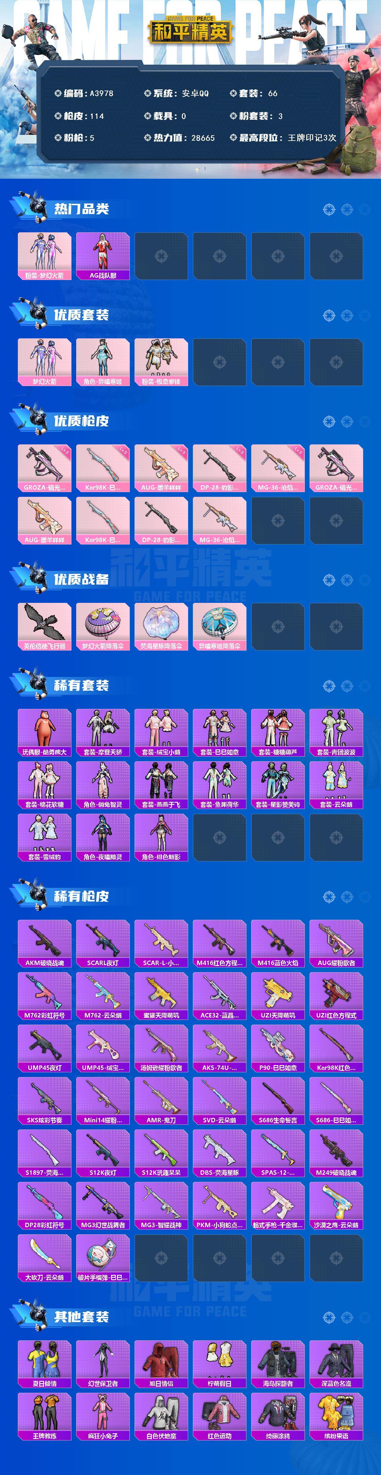 [15733774]安卓【小号/梦幻火箭】 手q-3粉装-5特效呛-0载具-2粉色飞行器-28665热力值-3王牌印记-66套装-114呛皮 【热门品类】:粉装-梦幻火箭,套装-ag战队服 【粉色套装】:粉装-梦幻火箭,角色-异瞳寒姬,粉装-极意拳锋 【粉色呛皮等级】:groza-镜光银凌五级,aug-暖羊咩咩五级,kar98k-巳巳如意五级,dp-28-豹影疾电五级,mg-36-沧焰双生五级 【粉色呛皮】:groza-镜光银凌,aug-暖羊咩咩,kar98k-巳巳如意,dp-28-豹影疾电,mg-36-沧焰双生 【粉色飞行器】:英伦信使飞行器 【粉色降落伞】:梦幻火箭降落伞,荧海星豚降落伞,异瞳寒姬降落伞,炫彩糖果降落伞 【稀有套装】:玩偶服-酷勇熊大,套装-摩登天骄,套装-绒宝小鹅,套装-巳巳如意,套装-雪国风尚,套装-糖糖葫芦,套装-青团波波,套装-棉花软糖,角色-俏兔智灵,套装-燕燕于飞,套装-鱼渊荷华,套装-星影赞美诗,套装-云朵鹅,套装-雪绒豹,角色-夜瞳黯灵,角色-绯色魅影,套装-炫彩糖果 【稀有呛皮】:aug-冰晶雪宝,akm-破晓战魂,scar-l-夜灯,scar-l-小狗蛇点点,m416-红色方程式,m416-蓝色火焰,aug-耀粉歌者,m762-彩虹符号,m762-云朵鹅,蜜獾-天降萌叽,ace32-蓝晶绮麟,uzi-天降萌叽,uzi-红色方程式,ump45-夜灯,ump45-绒宝小鹅,汤姆逊-耀粉歌者,aks-74u-鬼刀,p90-巳巳如意,kar98k-红色方程式,sks-炫彩节奏,mini14-耀粉歌者,amr-鬼刀,svd-云朵鹅,s686-生命誓言,s686-巳巳如意,s1897-荧海星豚,s12k-玩趣呆呆,s12k-夜灯,dbs-荧海星豚,spas-12-云朵鹅,m249-破晓战魂,dp-28-彩虹符号,mg3-幻世战舞者,mg3-智耀战神,pkm-小狗蛇点点,蝎式手呛-千金淑猫,沙墨之鹦-云朵鹅,大砍刀-云朵鹅,破片手留单-巳巳如意 【其他套装】:套装-夏日倾情,套装-幻世保卫者,套装-旭日情侣,套装-柠萌假日,套装-海岛探路者,套装-深蓝色名流,套装-王牌教练,套装-疯狂小兔子,套装-白色伏地魔,套装-红色运动,套装-绮丽涂鸦,套装-缤纷果语,套装-耀粉歌者,套装-蓝色运动,套装-街头潮人,套装-酒红色名流,套装-长空猛禽,