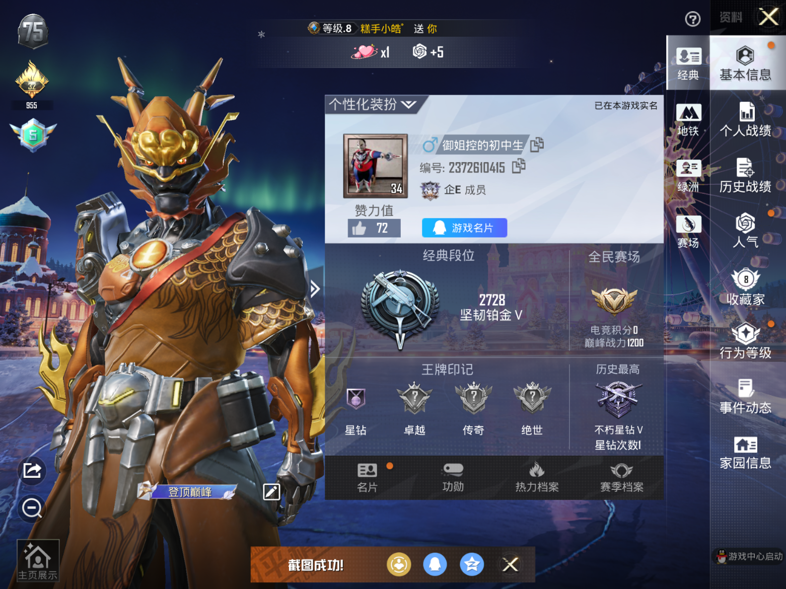 _2396923-0载具-13套装-10呛皮-1粉装-3810热力值-13套装-10呛皮【1粉装】套装-土曜战麒【13稀有时装】ss35特训ss36特训阳光菠萝雪国风尚土曜战麒红色运动蓝色守护者长空猛禽疯狂小兔子圣诞大吉北国孤狼蓝彩潮人王牌教练【10稀有呛械】win94-乌木金纹mk12-乌木金纹破片手留单-爆破雪人信号呛-异瞳寒姬akm-夜灯kar98k-红色方程式vect-生命誓言s686-红色方程式m249-乌木金纹mg3-幻世战舞者【1稀有飞行器】极意拳锋飞行器【2稀有背包】极意拳锋背包3级炫彩糖果背包3级
