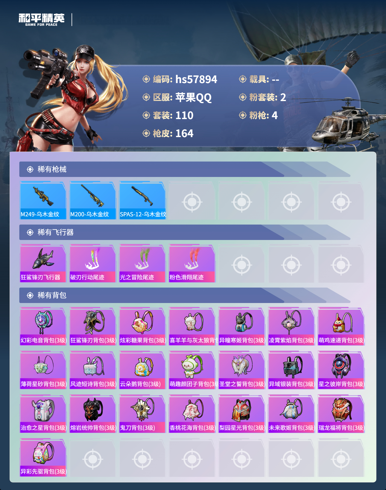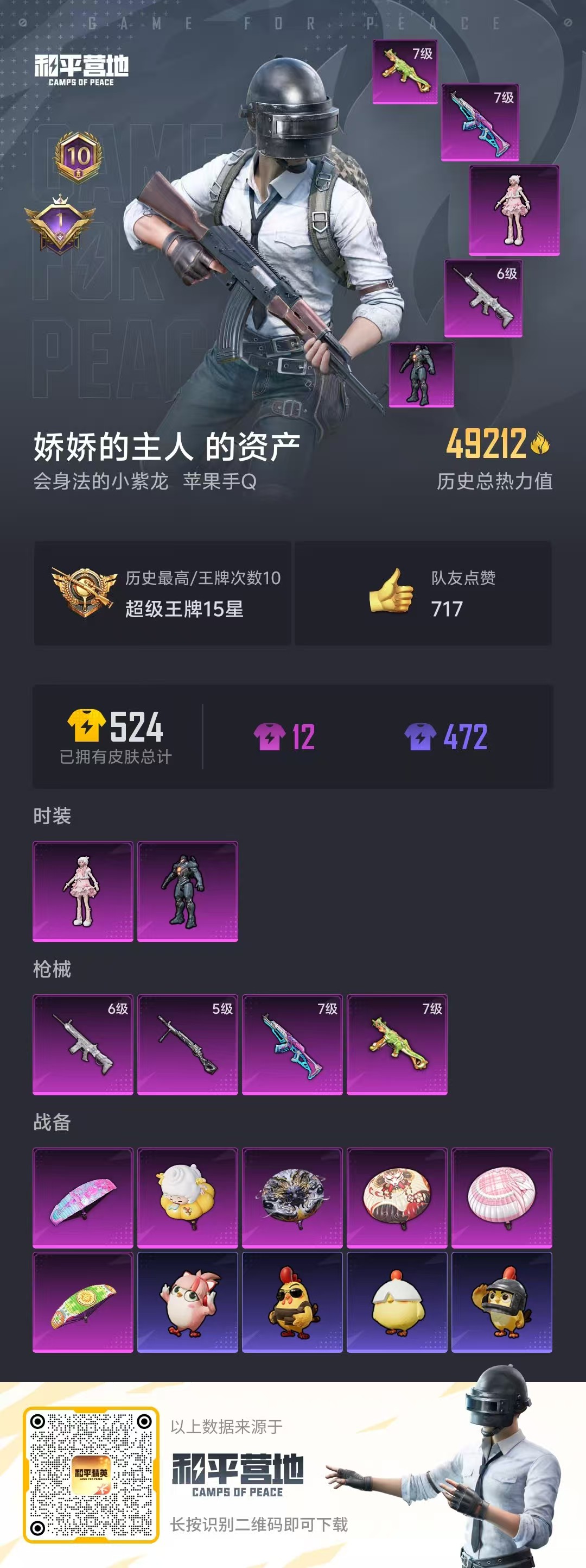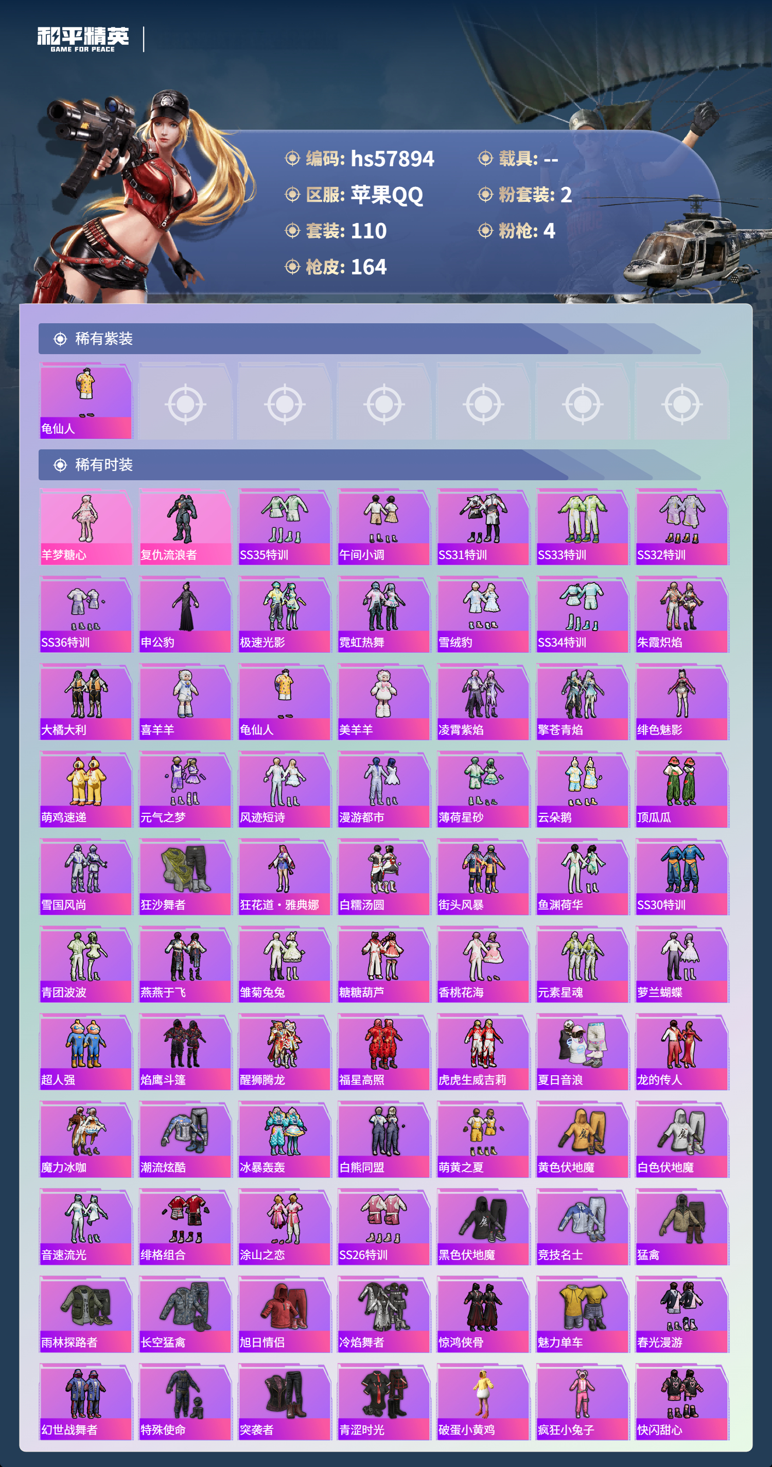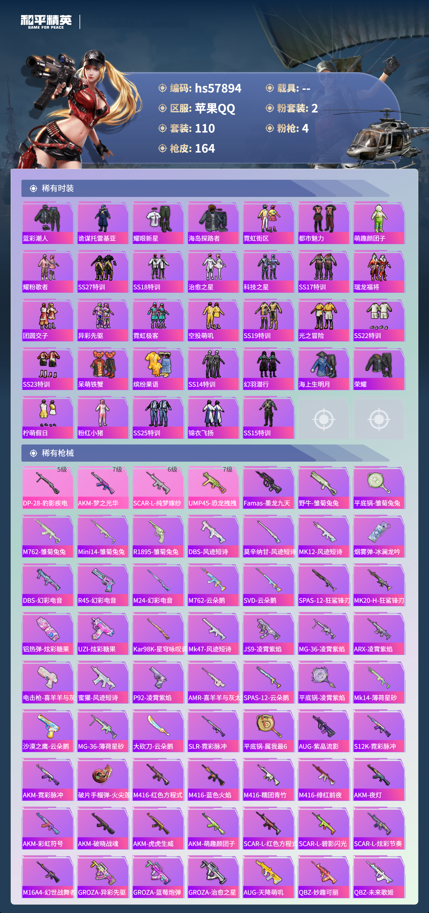 hs57894 苹果手q-10王牌印记-2粉装-4特效呛-49282热力值-110套装-164呛皮-1卓越印记【2粉装】角色-羊梦糖心角色-复仇流浪者【4特效呛】akm-梦之光华/7级dp-28-豹影疾电/5级scar-l-纯梦嫁纱/6级ump45-恐龙拽拽/7级【1稀有紫装】龟仙人【110稀有时装】羊梦糖心ss35特训午间小调ss31特训ss33特训ss32特训ss