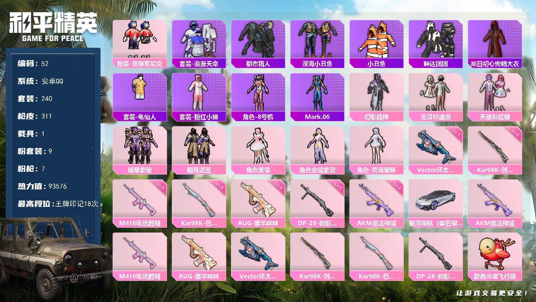 [15738960]【编号54241 可秒换绑】【顶级身法账号!粉装升级呛也够多,喜欢的宝宝速来下单!!】安卓 手q-9粉装-7特效呛-1载具-3粉色飞行器-93576热力值-18王牌印记-240套装-311呛皮 【热门品类】:粉装-音爆索尼克,套装-浪漫天命,套装-都市猎人,套装-深海小丑鱼,套装-小丑鱼,套装-胖达团团,旭日初心兜帽大衣,套装-龟仙人,套装-粉红小猪,角色-8号机,角色-mark.06 【粉色套装】:粉装-幻影战神,粉装-宝贝奶油派,粉装-天使彩虹糖,粉装-暗星紫秘,粉装-朗月武圣,粉装-音爆索尼克,角色-美雪,角色-金域紫灵,角色-荧海星豚 【粉色呛皮等级】:akm-魔法神域三级,m416-电玩时刻五级,aug-暖羊咩咩五级,vect-环太平洋七级,kar98k-创世·救赎六级,kar98k-巳巳如意五级,dp-28-豹影疾电五级 【粉色载具】:星河领航(磐石银) 【粉色呛皮】:akm-魔法神域,m416-电玩时刻,aug-暖羊咩咩,vect-环太平洋,kar98k-创世·救赎,kar98k-巳巳如意,dp-28-豹影疾电 【粉色飞行器】:歌者泠鸢飞行器,霓虹漫游飞行器 【粉色降落伞】:甜心宝贝降落伞,神秘黑猫降落伞,马卡龙降落伞,葫芦兄弟降落伞,橘柚倾心降落伞,筑梦精灵降落伞,甜梦小狐降落伞,炙焰牛王降落伞,彩虹甜喵降落伞,冰川粉黛降落伞,暗夜鎏金降落伞,音爆索尼克降落伞,未来歌姬降落伞,炫光之旅降落伞,江南烟雨降落伞,精灵梦叶罗丽降落伞,守护天翼降落伞,金丰海韵降落伞,月影灵韵降落伞 【稀有套装】:套装-龟仙人,套装-巳巳如意,套装-雏菊兔兔,套装-萝兰蝴蝶,角色-米开朗基罗,套装-糖糖葫芦,套装-青团波波,套装-棉花软糖,角色-临安公主,角色-俏兔智灵,套装-燕燕于飞,套装-鱼渊荷华,套装-云朵鹅,套装-雪绒豹,角色-夜瞳黯灵,套装-朱霞炽焰,套装-凌霄紫焰,套装-炫彩糖果 【稀有呛皮】:aug-冰晶雪宝,akm-冰凉西瓜,akm-墨染幽兰,akm-夜灯,akm-奇异狩猎者,akm-彩虹符号,akm-影袭,akm-江南烟雨,akm-灼热熔岩,akm-生命誓言,akm-破晓战魂,akm-萌趣颜团子,akm-虎虎生威,akm-霓虹街区,akm-龙的传人,m16a4-幻世战舞者,m16a4-甜心亚梦,m16a4-莲影清波,sc