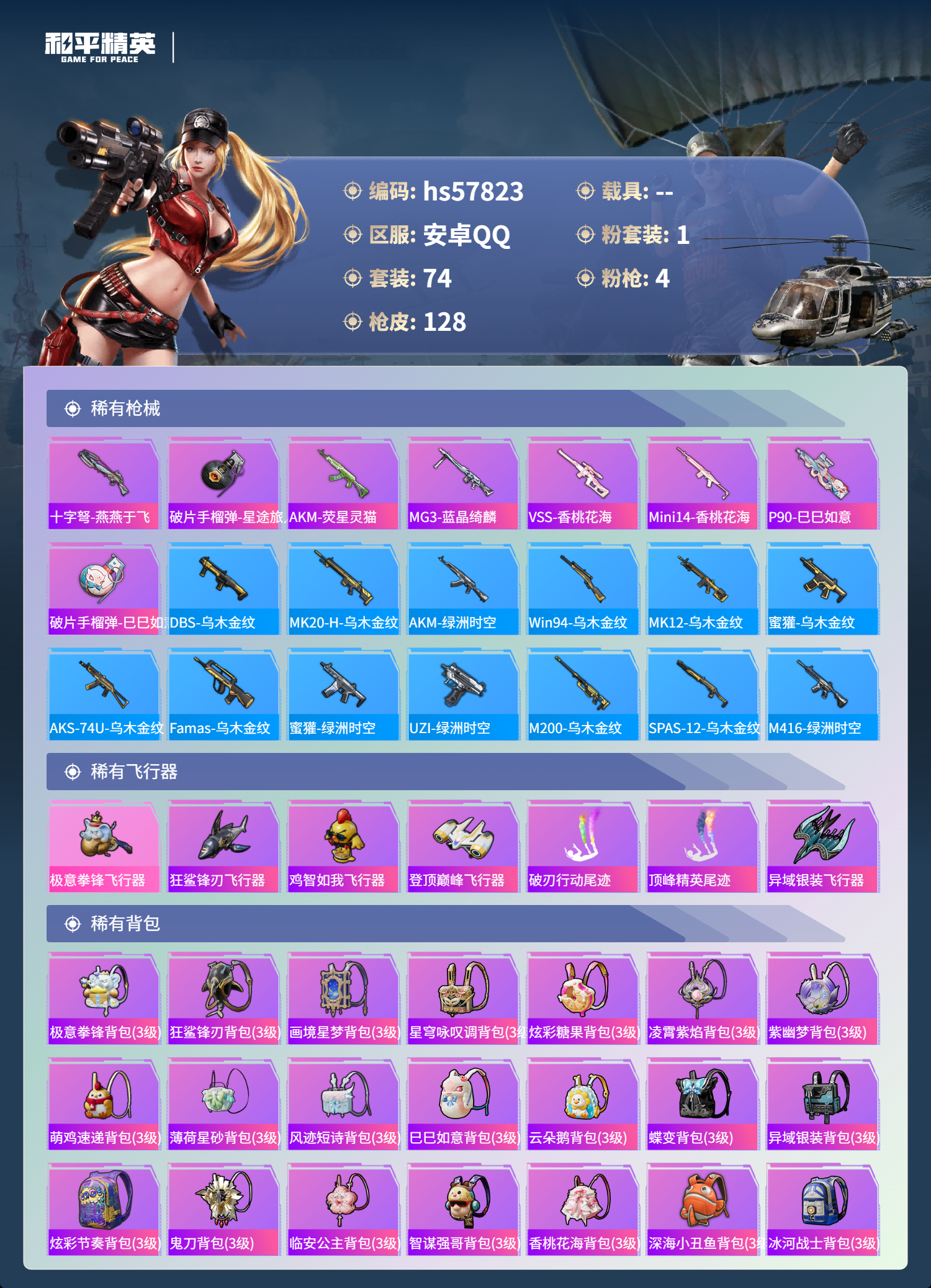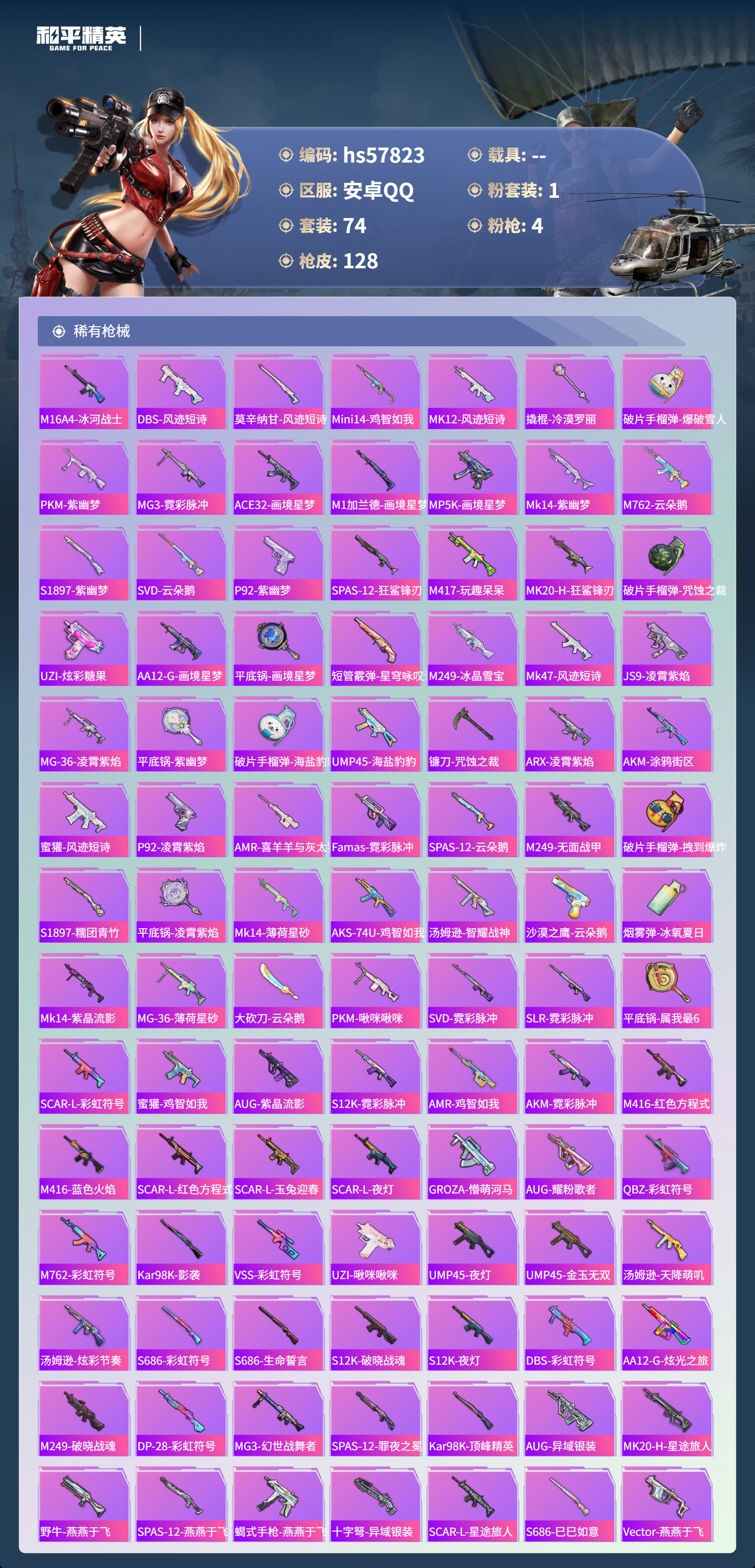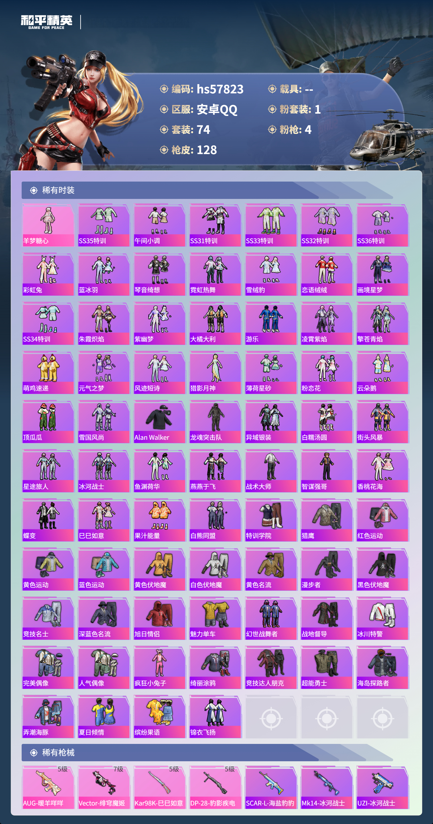 0载具-74套装-128呛皮-hs57823 安卓手q-2王牌印记-1粉装-4特效呛-30349热力值-74套装-128呛皮-1卓越印记【1粉装】角色-羊梦糖心【4特效呛】vect-绯穹魔姬/7级dp-28-豹影疾电/5级aug-暖羊咩咩/5级kar98k-巳巳如意/5级【74稀有时装】羊梦糖心ss35特训午间小调ss31特训ss33特训ss32特训ss36特训彩虹兔蓝冰羽琴音绮想霓虹热舞