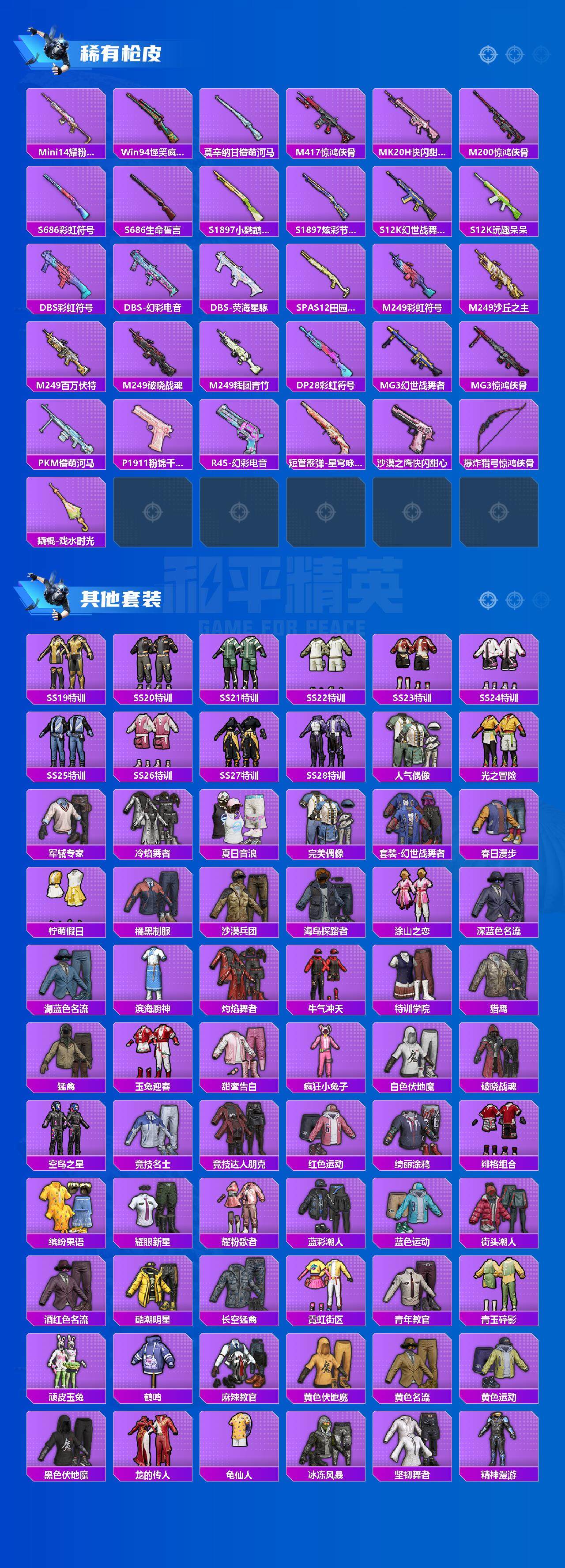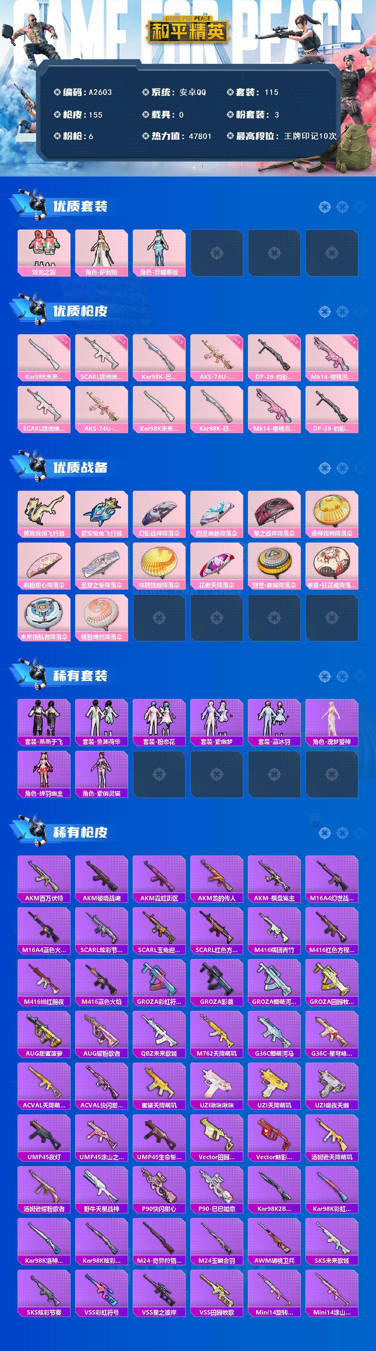 [15740013]安卓【小号/百万伏特背包】 手q-3粉装-6特效呛-0载具-2粉色飞行器-47801热力值-10王牌印记-115套装-155呛皮 【热门品类】:套装-龟仙人 【粉色套装】:粉装-炫光之旅,角色-萨利娅,角色-异瞳寒姬 【粉色呛皮等级】:scar-l-锦绣绵绵五级,aks-74u-星穹咏叹调五级,kar98k-未来歌姬五级,kar98k-巳巳如意五级,mk14-樱桃泡泡四级,dp-28-豹影疾电五级 【粉色呛皮】:scar-l-锦绣绵绵,aks-74u-星穹咏叹调,kar98k-未来歌姬,kar98k-巳巳如意,mk14-樱桃泡泡,dp-28-豹影疾电 【粉色飞行器】:黄族统领飞行器,冠军兔兔飞行器 【粉色降落伞】:幻影战神降落伞,四圣焕新降落伞,星之彼岸降落伞,垂柳戏鸭降落伞,飒粉甜心降落伞,圣堂之誓降落伞,祥瑞锦鲤降落伞,花傲天降落伞,创世·救赎降落伞,拳皇·狂花道降落伞,未来领航者降落伞,桃粉嫣然降落伞 【稀有套装】:套装-龟仙人,套装-燕燕于飞,套装-鱼渊荷华,套装-粉恋花,套装-紫幽梦,套装-蓝冰羽,角色-瑰梦爱神,角色-绛羽幽主,角色-紫俏灵猫 【稀有呛皮】:akm-百万伏特,akm-破晓战魂,akm-霓虹街区,akm-龙的传人,akm-棋盘冕主,m16a4-幻世战舞者,m16a4-蓝色火焰,scar-l-炫彩节奏,scar-l-玉兔迎春,scar-l-红色方程式,m416-糯团青竹,m416-红色方程式,m416-绯红前夜,m416-蓝色火焰,groza-彩虹符号,groza-影袭,groza-懵萌河马,groza-田园牧歌,aug-甜蜜菠萝,aug-耀粉歌者,q-未来歌姬,m762-天降萌叽,g36c-懵萌河马,g36c-星穹咏叹调,ac-val-天降萌叽,ac-val-快闪甜心,蜜獾-天降萌叽,uzi-啾咪啾咪,uzi-天降萌叽,uzi-诡夜天鹅,ump45-夜灯,ump45-涂山之恋,ump45-生命誓言,vect-田园牧歌,vect-魅影蝠王,汤姆逊-天降萌叽,汤姆逊-耀粉歌者,野牛-天星战神,p90-快闪甜心,p90-巳巳如意,kar98k-2b战斗服款,kar98k-彩虹符号,kar98k-洛神天依,kar98k-炫彩节奏,m24-玉鳞金羽,m24-奇异狩猎者,awm-胡桃卫兵,sks-未来歌姬,sks-