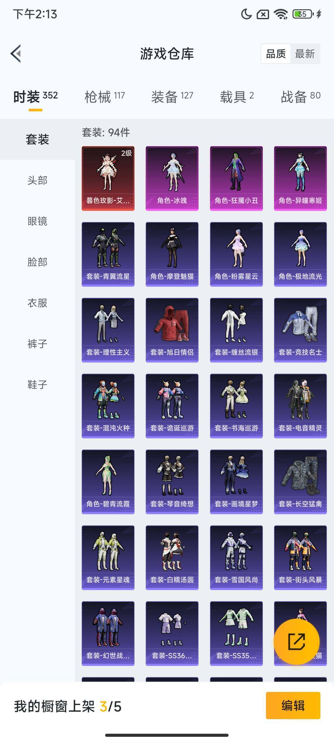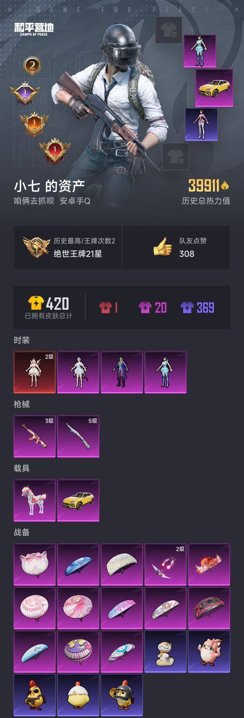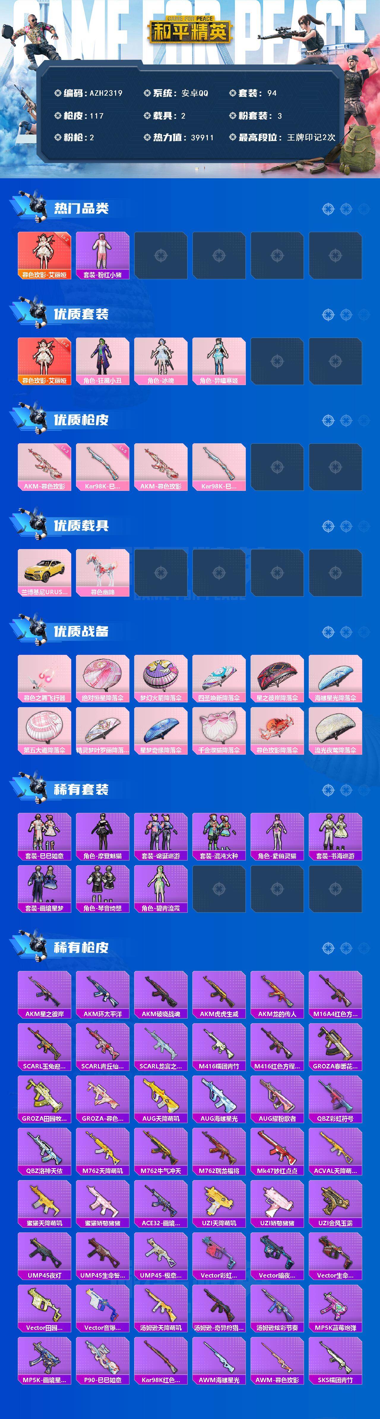 2载具-94套装-117呛皮-安卓 手q【二级艾丽娅 狂魇小丑 冰魄 2载具】1神装-3粉装-2特效呛-2载具-1粉色飞行器-39911热力值-2王牌印记-94套装-117呛皮 【红色神装等级】:暮色玫影-艾丽娅二级 【红色角色神装】:暮色玫影-艾丽娅 【热门品类】:套装-粉红小猪 【粉色套装】:角色-狂魇小丑,角色-冰魄,角色-异瞳寒姬 【粉色呛皮等级】:akm-暮色玫影三级,kar98k-巳巳如意五级 【粉