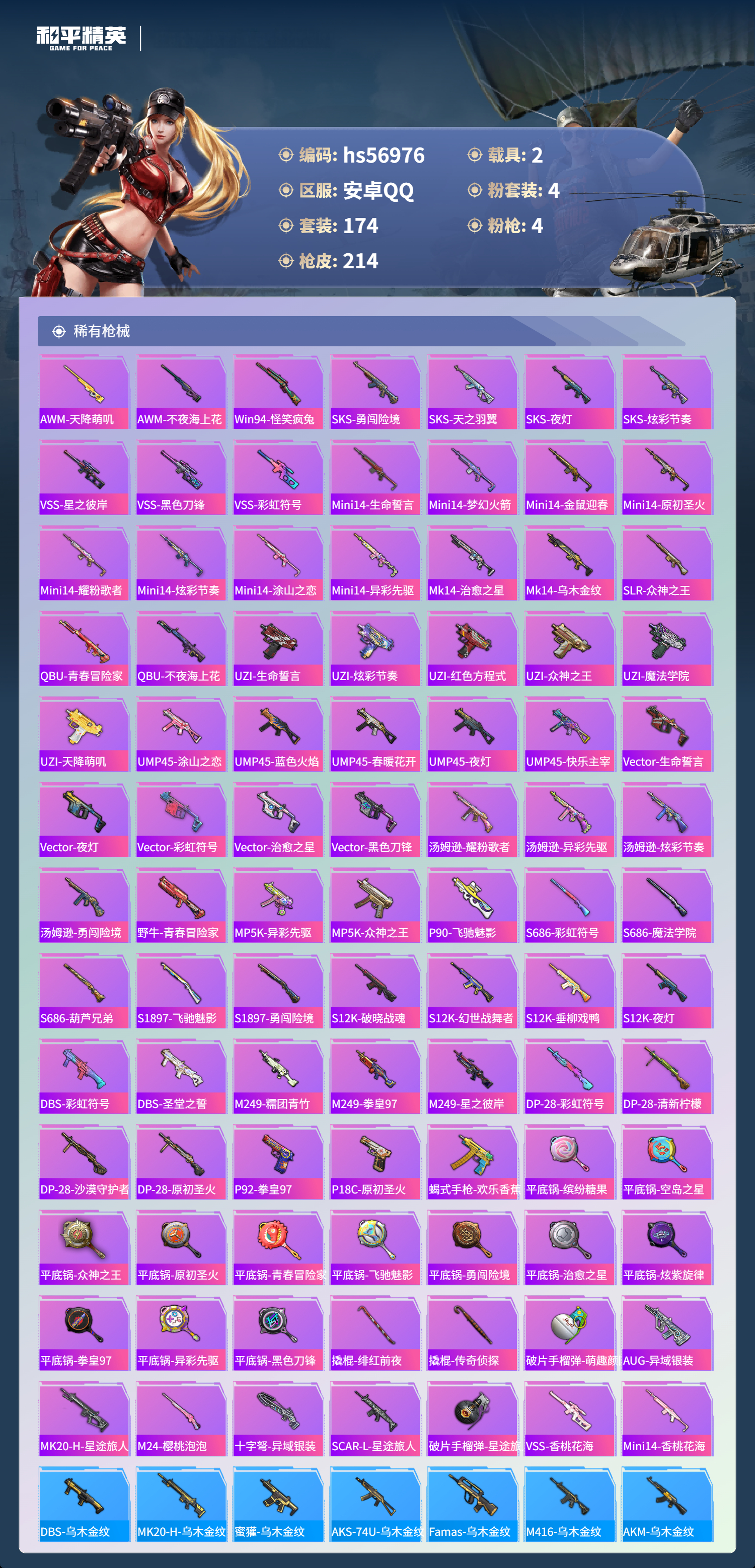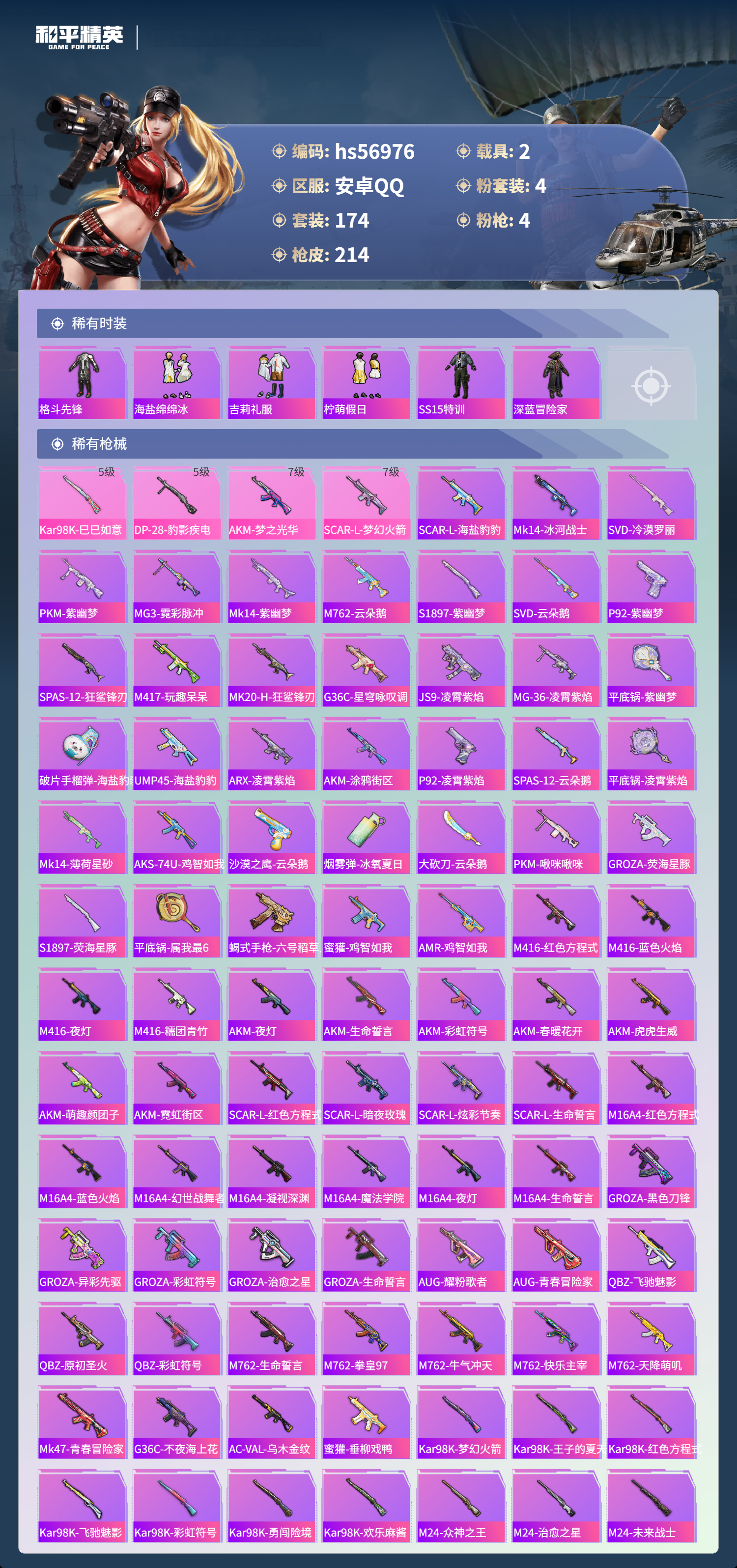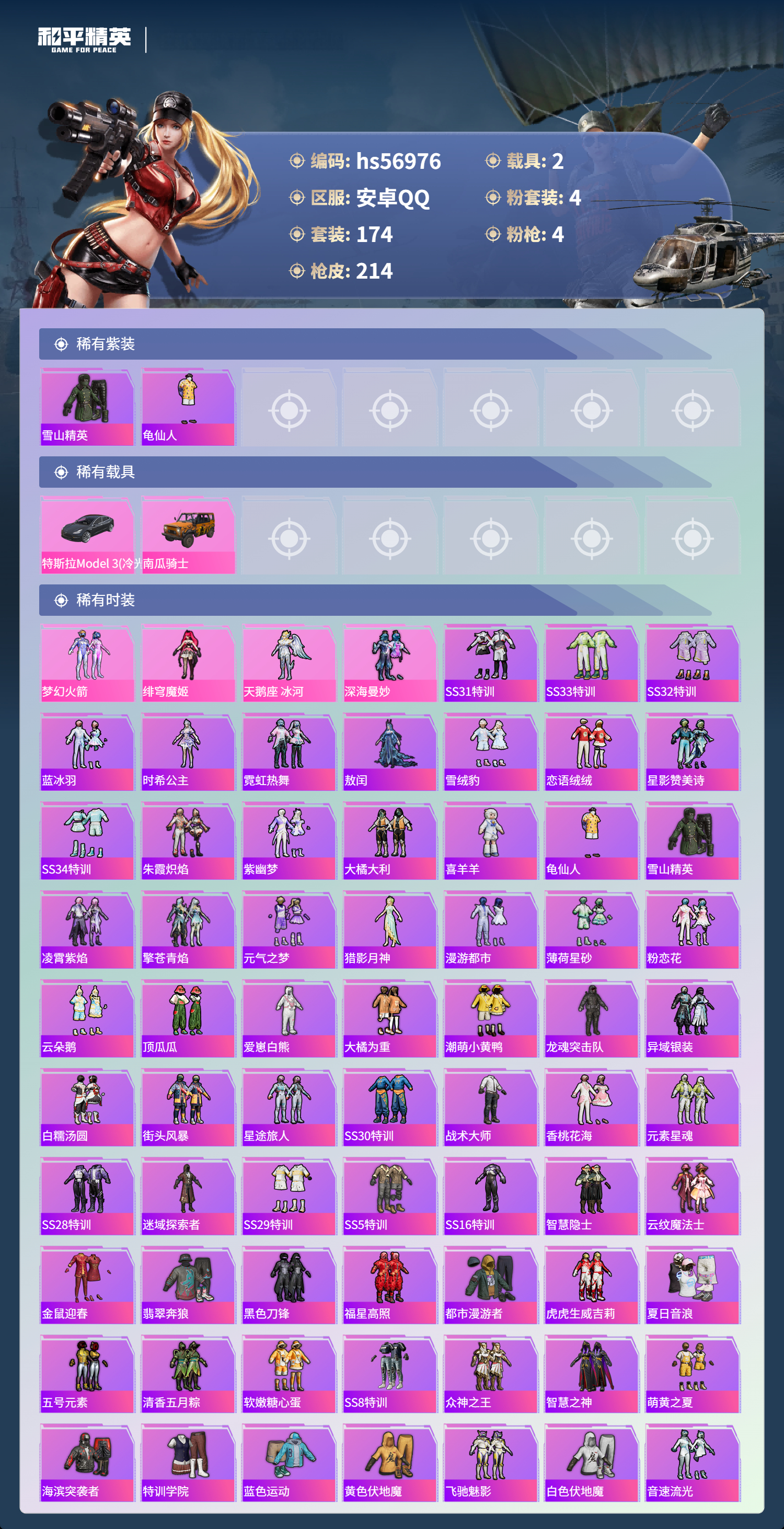 2382607安卓手q-8王牌印记-4粉装-4特效呛-2载具-67334热力值-174套装-214呛皮-2卓越印记-1传奇印记 【4粉装】角色-天鹅座 冰河套装-梦幻火箭角色-绯穹魔姬套装-深海曼妙 【4特效呛】dp-28-豹影疾电/5级akm-梦之光华/7级scar-l-梦幻火箭/7级kar98k-巳巳如意/5级 【2稀有紫装】雪山精英龟仙人 【2稀有载具】特斯拉mode