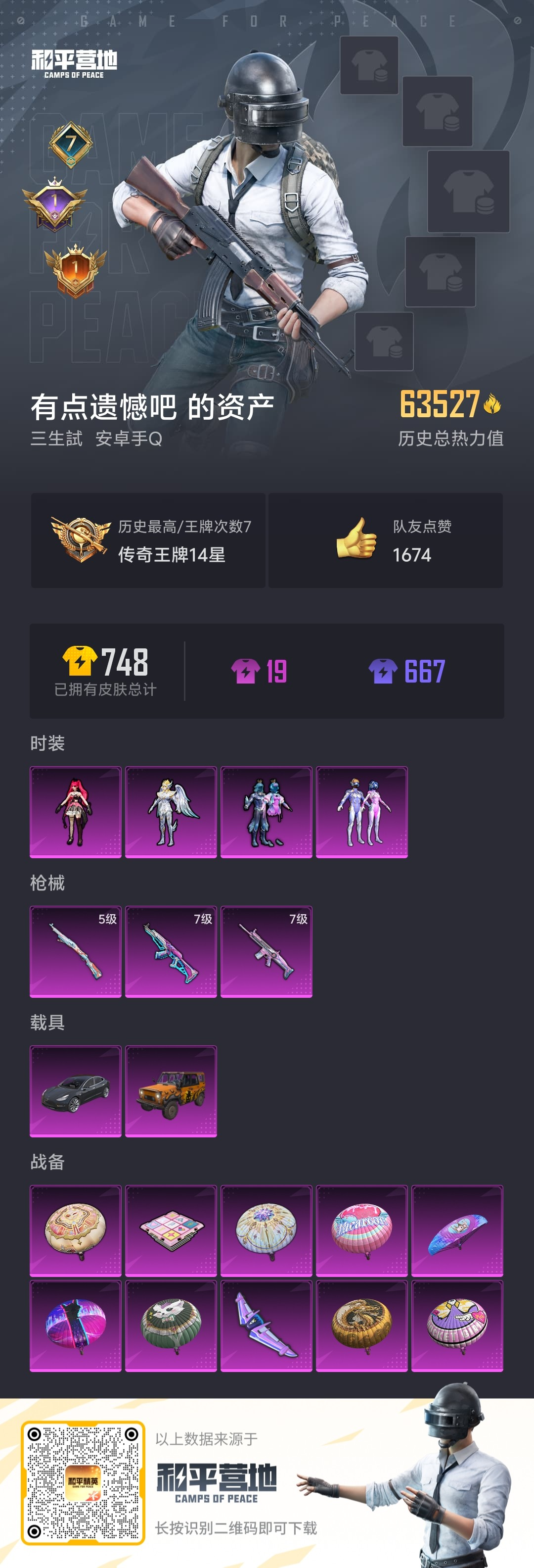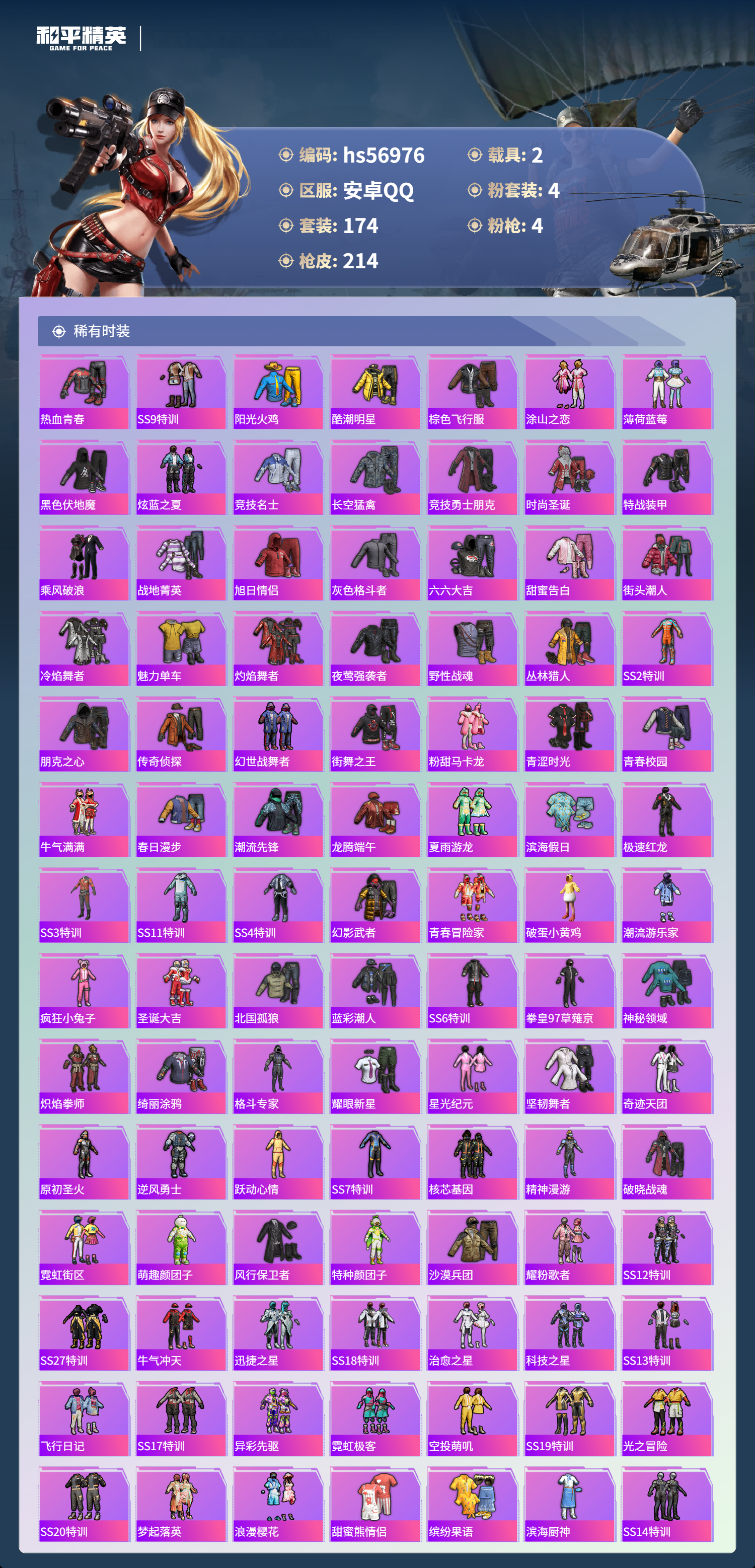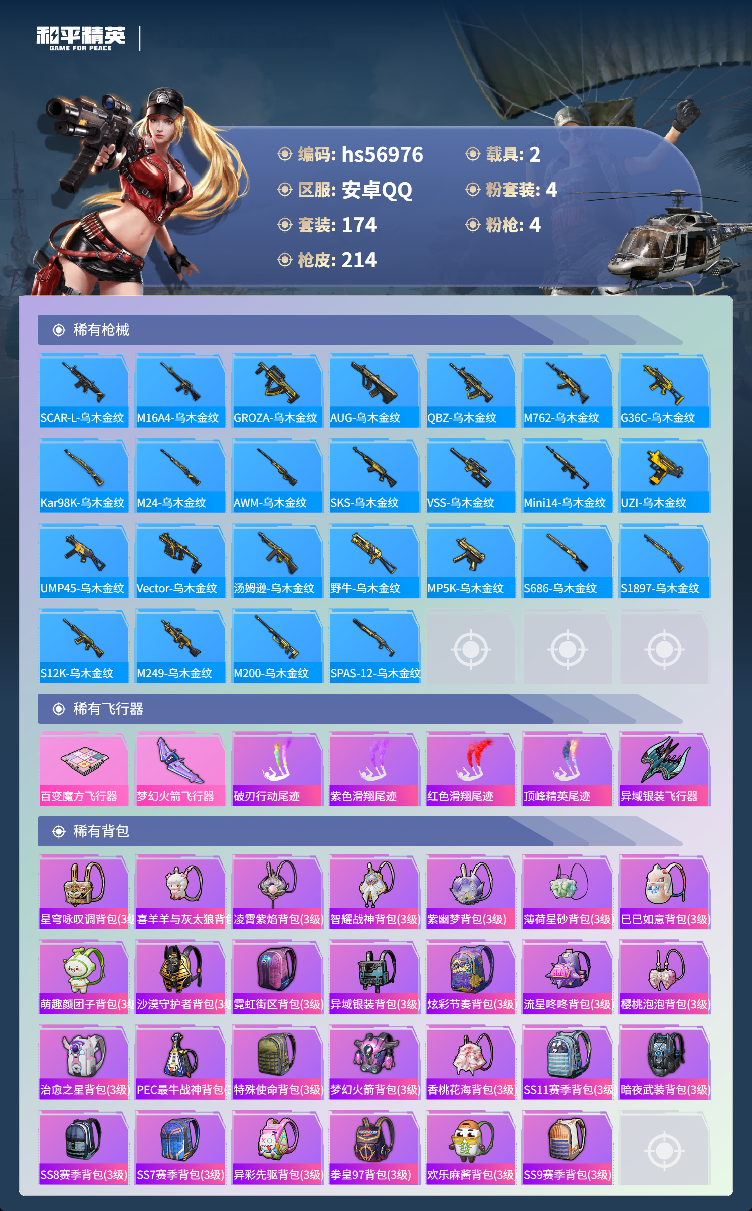 2382607安卓手q-8王牌印记-4粉装-4特效呛-2载具-67334热力值-174套装-214呛皮-2卓越印记-1传奇印记 【4粉装】角色-天鹅座 冰河套装-梦幻火箭角色-绯穹魔姬套装-深海曼妙 【4特效呛】dp-28-豹影疾电/5级akm-梦之光华/7级scar-l-梦幻火箭/7级kar98k-巳巳如意/5级 【2稀有紫装】雪山精英龟仙人 【2稀有载具】特斯拉mode