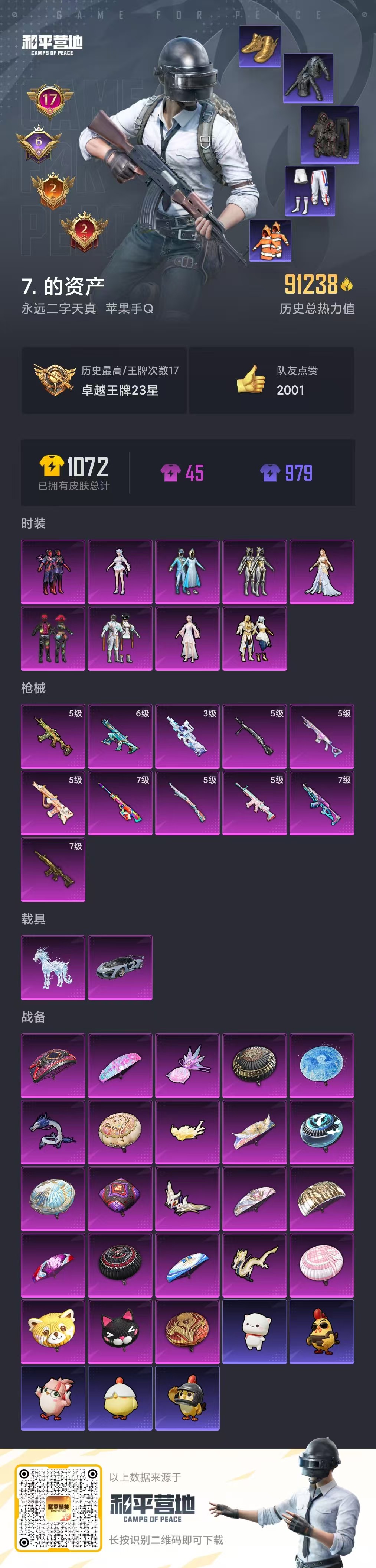 【和平精英】【txhp6273】9粉装,11特效呛,2载具,历史最高段位:卓越王牌23星 王牌印记17次 热力值:91238,191套装,282呛械,393装备,174战备;套装:套装-雪国幻梦,套装-智能音符,套装-放客神游,套装-绚金战神,套装-星之彼岸,套装-天星战神,角色-烟云彩露,角色-智耀战神,角色-荧海星豚,套装-特训学院,套装-猎鹰,套装-青年教官,套装-橘黑制服,套装-红色运动,套装-黄色运动,套装-竞技名士,套装-湖蓝色名流,套装-黄色名流,套装-野性山猫,套装-长空猛禽,套装-漫步者,套装-海岛探路者,套装-旭日情侣,套装-冷焰舞者,套装-都市猎人,套装-水银刺客,套装-浪漫天命,套装-特战装甲,套装-贵族骑装,套装-青春校园,套装-活力之心,套装-春日漫步,套装-滨海假日,套装-鹰眼刺客,套装-冰冻风暴,套装-冷酷挑战者,套装-特战英豪,套装-暗金炫舞,套装-魅力单车,套装-绮丽涂鸦,套装-耀眼新星,套装-破晓战魂,套装-荣耀,套装-热血青春,套装-派对舞王,套装-酷潮明星,套装-极地朋克,套装-幻世战舞者,套装-清新柠檬,套装-呆萌铁蟹,套装-缤纷果语,套装-滨海厨神,套装-alan walker,套装-龙魂突击队,套装-冰川特警,套装-麻辣教官,套装-小丑鱼,套装-破蛋小黄鸡,套装-鹤鸣,套装-霓虹街区,套装-白熊同盟,套装-萌黄之夏,套装-夏日音浪,套装-牛气满满,套装-战术大师,套装-牛气冲天,套装-ss18特训,套装-耀粉歌者,套装-飞行日记,套装-曼妙人鱼,套装-热情海星,套装-纯真浪花,套装-ss17特训,套装-爆裂葡萄,套装-雪兔飞飞,套装-虎虎生威吉莉,套装-异彩先驱,套装-霓虹极客,套装-ss19特训,套装-飞驰魅影,套装-音速流光,套装-炫蓝之夏,套装-ss20特训,套装-ss21特训,套装-萌趣咩咩,套装-娇憨猪猪,套装-玉兔迎春,套装-ss22特训,套装-和煦暖阳,套装-田园牧歌,套装-轻风白浪,套装-光之冒险,套装-绯格组合,套装-ss23特训,角色-孙悟空,套装-摩登艾咪,套装-莱茵河畔,套装-香榭午后,套装-甜梦熊熊,套装-神气柴柴,套装-懵萌河马,套装-灵蜜圈圈,套装-妙红点点,套装-幻彩翩翩,套装-王牌教练,套装-柠萌假日,套装-青玉碎影,套装-ss24特训,套装-绚紫流光,角色-短笛,套装-龟仙人,套装-ss25特训,套装-惊鸿侠骨,套装-锦衣飞扬,套装-元气发射,套装-香桃花海,套装-深海梦境,套装-龙的传人,套装-冰河战士,套装-ss26特训,套装-快闪甜心,套装-春光漫游,套装-空岛之星,套装-无暇誓言,套装-贝斯之夜,套装-焰鹰斗篷,套装-幽夜迷踪,套装-幻羽潜行,套装-ss27特训,套装-恋语绒绒,套装-老实芭蕉,套装-ss28特训,角色-蝶吟花词,套装-铁血战翼,角色-多纳泰罗,角色-银尘,角色-mark.06,套装-街头风暴,套装-海盐绵绵冰,套装-蝶变,套装-原力风暴,套装-小熊娃娃,套装-ss29特训,套装-雏菊兔兔,角色-狂花道·雅典娜,套装-萝兰蝴蝶,角色-绯色魅影,套装-异域银装,套装-星途旅人,角色-许七安,套装-ss30特训,套装-青团波波,套装-棉花软糖,套装-糖糖葫芦,套装-小鸟芋圆,套装-ss31特训,套装-鱼渊荷华,套装-燕燕于飞,套装-智谋强哥,角色-瑰梦爱神,套装-紫幽梦,套装-粉恋花,套装-ss33特训,套装-云朵鹅,套装-巳巳如意,套装-ss32特训,套装-青翼流星,套装-蓝冰羽,套装-顶瓜瓜,套装-雪绒豹,套装-狂鲨锋刃,套装-大橘大利,套装-星渊小夜曲,套装-炫彩糖果,套装-元气之梦,套装-ss34特训,套装-擎苍青焰,套装-朱霞炽焰,套装-凌霄紫焰,套装-薄荷星砂,套装-ss35特训,套装-午间小调,套装-秘语星愿,套装-风迹短诗,套装-琴音绮想,套装-粉黛兰香,套装-画境星梦,套装-书海巡游,角色-月烬之祷,套装-ss36特训,套装-萌鸡速递;呛皮:mk47-乌木金纹,mk47-妙红点点,mk47-风迹短诗,ac-val-乌木金纹,ac-val-天降萌叽,ac-val-快闪甜心,5级scar-l-锦绣绵绵,scar-l-红色方程式,scar-l-夜灯,scar-l-炫彩节奏,scar-l-彩虹符号,scar-l-玉兔迎春,scar-l-星途旅人,scar-l-海盐豹豹,7级akm-梦之光华,akm-灼热熔岩,akm-生命誓言,akm-影袭,akm-破晓战魂,akm-霓虹街区,akm-夜灯,akm-涂鸦街区,akm-星之彼岸,akm-彩虹符号,akm-虎虎生威,akm-胡桃卫兵,akm-玄冥寒域,akm-霓彩脉冲,akm-绿洲时空,6级蜜獾-异瞳寒姬,蜜獾-娇憨猪猪,蜜獾-天降萌叽,蜜獾-精灵梦叶罗丽,蜜獾-糖糖葫芦,蜜獾-御兔特攻,蜜獾-绯穹魔姬,蜜獾-风迹短诗,蜜獾-冰澜龙吟,蜜獾-乌木金纹,g36c-懵萌河马,g36c-星穹咏叹调,g36c-乌木金纹,7级m416-五爪金龙,m416-红色方程式,m416-紫翼圣骑,m416-糯团青竹,ace32-画境星梦,ace32-冰晶雪宝,5级aug-暖羊咩咩,aug-灵符少年,aug-异域银装,aug-紫晶流影,groza-影袭,groza-异彩先驱,groza-田园牧歌,groza-懵萌河马,groza-绯红回忆,groza-海盐豹豹,m762-快乐主宰,m762-彩虹符号,m762-第五大道,m762-天降萌叽,m762-雏菊兔兔,m762-云朵鹅,q-飞驰魅影,q-银碳小老虎,q-未来歌姬,q-纯真浪花,m16a4-蓝色火焰,m16a4-幻世战舞者,m16a4-冰河战士,arx-凌霄紫焰,famas-霓彩脉冲,famas-乌木金纹,5级kar98k-巳巳如意,kar98k-影袭,kar98k-金玉无双,kar98k-彩虹符号,kar98k-炫彩节奏,kar98k-飞驰魅影,kar98k-顶峰精英,kar98k-星穹咏叹调,m200-惊鸿侠骨,m200-乌木金纹,awm-圣堂之誓,awm-焰鹰斗篷,awm-纯真浪花,awm-绿洲时空,m24-影袭,m24-天降萌叽,m24-乌木金纹,svd-云朵鹅,svd-霓彩脉冲,莫辛纳甘-乌木金纹,莫辛纳甘-懵萌河马,莫辛纳甘-风迹短诗,7级amr-炫光之旅,amr-暗夜行者,amr-妙红点点,amr-鸡智如我,amr-乌木金纹,win94-乌木金纹,m417-惊鸿侠骨,mini14-异彩先驱,mini14-涂山之恋,mini14-香桃花海,mini14-雏菊兔兔,slr-娇憨猪猪,slr-彩虹符号,slr-极冰使者,slr-霓彩脉冲,mk20-h-莲