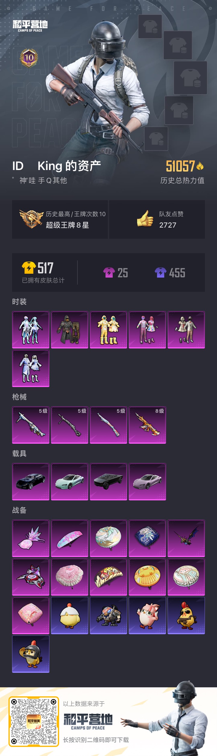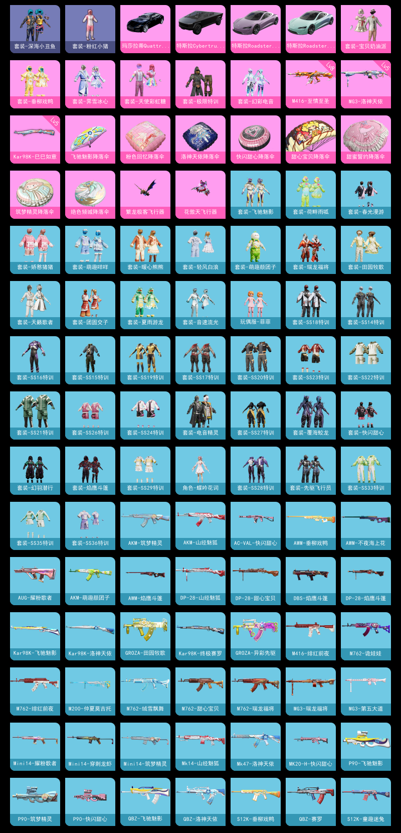 【和平精英】【txhp6258】6粉装,4特效呛,4载具,历史最高段位:超级王牌8星 王牌印记10次 热力值:51057,95套装,157呛械,160装备,76战备;套装:套装-极限特训,套装-宝贝奶油派,套装-天使彩虹糖,套装-霁雪冰心,套装-垂柳戏鸭,套装-幻彩电音,套装-黄色运动,套装-白色伏地魔,套装-黑色伏地魔,套装-竞技名士,套装-酒红色名流,套装-猛禽,套装-长空猛禽,套装-蓝色守护者,套装-冷焰舞者,套装-特战装甲,套装-浪漫假日,套装-甜蜜告白,套装-滨海假日,套装-蓝彩潮人,套装-魅力单车,套装-绮丽涂鸦,套装-破晓战魂,套装-极地朋克,套装-幻世战舞者,套装-深海小丑鱼,套装-甜蜜熊情侣,套装-缤纷果语,套装-龙魂突击队,套装-麻辣教官,套装-粉红小猪,套装-夏日音浪,套装-牛气满满,套装-萌趣颜团子,套装-战术大师,套装-牛气冲天,套装-ss18特训,套装-ss14特训,套装-天籁歌者,套装-电音精灵,套装-吉莉礼服,套装-ss15特训,套装-ss16特训,套装-ss17特训,套装-瑞龙福将,套装-团圆交子,套装-福星高照,套装-虎虎生威吉莉,套装-空投萌叽,套装-ss19特训,套装-飞驰魅影,套装-音速流光,套装-炫蓝之夏,套装-ss20特训,套装-覆海蛟龙,套装-ss21特训,套装-暖心熊熊,套装-萌趣咩咩,套装-娇憨猪猪,套装-夏雨游龙,套装-荷畔雨呱,套装-玉兔迎春,套装-ss22特训,套装-田园牧歌,套装-轻风白浪,套装-光之冒险,套装-ss23特训,套装-柠萌假日,套装-青玉碎影,套装-ss24特训,套装-龟仙人,套装-涂山之恋,套装-ss26特训,套装-快闪甜心,套装-春光漫游,套装-空岛之星,玩偶服-菲菲,套装-焰鹰斗篷,套装-幻羽潜行,套装-ss27特训,套装-老实芭蕉,套装-ss28特训,角色-蝶吟花词,套装-蝶变,套装-ss29特训,套装-先驱飞行员,套装-ss31特训,套装-ss33特训,套装-ss32特训,套装-炫彩糖果,套装-元气之梦,套装-ss34特训,套装-薄荷星砂,套装-ss35特训,套装-ss36特训;呛皮:akm-生命誓言,akm-破晓战魂,akm-霓虹街区,akm-山经魅狐,akm-夜灯,akm-涂鸦街区,akm-彩虹符号,akm-萌趣颜团子,akm-虎虎生威,akm-筑梦精灵,aug-耀粉歌者,aug-天降萌叽,aug-冰晶雪宝,m762-绯红前夜,m762-诡娃娃,m762-甜心宝贝,m762-瑞龙福将,m762-彩虹符号,m762-绒雪飘舞,m762-天降萌叽,8级m416-至情至圣,m416-绯红前夜,m416-红色方程式,m416-糯团青竹,蜜獾-娇憨猪猪,蜜獾-垂柳戏鸭,蜜獾-天降萌叽,ac-val-乌木金纹,ac-val-快闪甜心,m16a4-蓝色火焰,m16a4-幻世战舞者,m16a4-冰河战士,groza-彩虹符号,groza-异彩先驱,groza-田园牧歌,groza-海盐豹豹,scar-l-红色方程式,scar-l-黄金龙骨,scar-l-炫彩节奏,scar-l-玉兔迎春,scar-l-海盐豹豹,q-赛罗,q-彩虹符号,q-洛神天依,q-飞驰魅影,ace32-冰晶雪宝,famas-乌木金纹,g36c-乌木金纹,mk47-洛神天依,mk47-乌木金纹,m24-乌木金纹,5级kar98k-巳巳如意,kar98k-终极赛罗,kar98k-彩虹符号,kar98k-炫彩节奏,kar98k-洛神天依,kar98k-飞驰魅影,kar98k-乌木金纹,莫辛纳甘-乌木金纹,amr-乌木金纹,awm-不夜海上花,awm-垂柳戏鸭,awm-焰鹰斗篷,m200-仲夏莫吉托,win94-瑞龙福将,vss-田园牧歌,vss-香桃花海,mini14-穿刺龙虾,mini14-炫彩节奏,mini14-耀粉歌者,mini14-筑梦精灵,mini14-涂山之恋,mk12-乌木金纹,slr-娇憨猪猪,slr-霓彩脉冲,mk14-山经魅狐,mk14-乌木金纹,mk14-冰河战士,sks-夜灯,sks-炫彩节奏,mk20-h-快闪甜心,uzi-红色方程式,uzi-炫彩节奏,uzi-娇憨猪猪,uzi-天降萌叽,uzi-冰河战士,uzi-啾咪啾咪,uzi-炫彩糖果,p90-飞驰魅影,p90-筑梦精灵,p90-快闪甜心,p90-玩趣呆呆,p90-巳巳如意,ump45-生命誓言,ump45-涂山之恋,ump45-海盐豹豹,vect-夜灯,vect-田园牧歌,vect-焰鹰斗篷,汤姆逊-幻影战神,汤姆逊-耀粉歌者,汤姆逊-环太平洋,mp5k-乌木金纹,野牛-乌木金纹,aks-74u-乌木金纹,dbs-焰鹰斗篷,dbs-乌木金纹,s12k-破晓战魂,s12k-童趣迷兔,s12k-瑞龙福将,s12k-娇憨猪猪,s12k-垂柳戏鸭,s12k-幻世战舞者,s12k-音爆索尼克,spas-12-田园牧歌,s1897-神秘黑猫,s1897-炫彩节奏,s1897-飞驰魅影,s1897-乌木金纹,s686-红色方程式,5级mg3-洛神天依,mg3-瑞龙福将,mg3-幻世战舞者,mg3-乌木金纹,mg3-第五大道,m249-破晓战魂,m249-糯团青竹,m249-无面战甲,m249-乌木金纹,5级dp-28-豹影疾电,dp-28-甜心宝贝,dp-28-山经魅狐,dp-28-彩虹符号,dp-28-焰鹰斗篷,mg-36-薄荷星砂,p1911-无面战甲,沙墨之鹦-快闪甜心,短管霰弹-星穹咏叹调,平底锅-甜心宝贝,平底锅-瑞龙福将,平底锅-飞驰魅影,平底锅-娇憨猪猪,平底锅-田园牧歌,平底锅-光之冒险,平底锅-快闪甜心,平底锅-空岛之星,平底锅-焰鹰斗篷,撬棍-快乐主宰,撬棍-甜心宝贝,撬棍-幻世战舞者,大砍刀-鬼刀,战术弩-江南烟雨,破片手留单-萌趣颜团子,破片手留单-呆爆全场,破片手留单-海盐豹豹,盐雾蛋-冰氧夏日,铝热弹-炫彩糖果;载具:特斯拉cybertruck极昼黑,特斯拉roadster水滴蓝,特斯拉roadster沁心粉,玛莎拉蒂quattropte夜幕蓝;降落伞:花傲天飞行器,繁龙极客飞行器,炫彩糖果飞行器,红色滑翔尾迹,狂鲨锋刃飞行器; 详情看图10印记-5.1w热力-6粉-4特-4车 极限特训/奶油裙/彩虹裙 8级至情