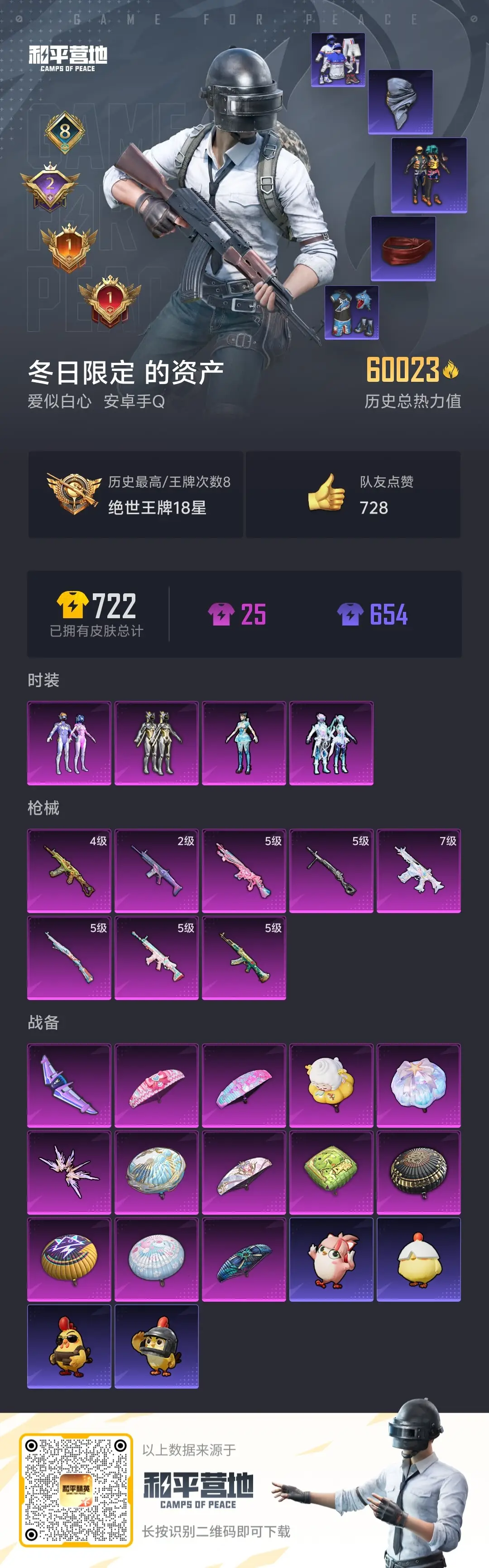 【和平精英】【txhp6277】4粉装,8特效呛,0载具,历史最高段位:绝世王牌18星 王牌印记8次 热力值:60023,165套装,191呛械,216装备,125战备;套装:套装-梦幻火箭,套装-绚金战神,角色-异瞳寒姬,套装-幻彩电音,套装-特训学院,套装-猎鹰,套装-青年教官,套装-橘黑制服,套装-红色运动,套装-黄色运动,套装-蓝色运动,套装-黄色伏地魔,套装-白色伏地魔,套装-黑色伏地魔,套装-骑行爱好者,套装-竞技名士,套装-深蓝色名流,套装-酒红色名流,套装-湖蓝色名流,套装-黄色名流,套装-猛禽,套装-长空猛禽,套装-漫步者,套装-蓝色守护者,套装-海岛探路者,套装-旭日情侣,套装-六六大吉,套装-冷焰舞者,套装-灼焰舞者,套装-都市猎人,套装-浪漫天命,套装-特战装甲,套装-战地督导,套装-活力之心,套装-春日漫步,套装-滨海假日,套装-沙漠毒蛇,套装-鹰眼刺客,套装-冰冻风暴,套装-完美偶像,套装-幻影武者,套装-特战英豪,套装-街头潮人,套装-蓝彩潮人,套装-怒火燎原,套装-魅力单车,套装-绮丽涂鸦,套装-耀眼新星,套装-狂战萌兔,套装-都市漫游者,套装-野性战心,套装-破晓战魂,套装-荣耀,套装-热血青春,套装-酷潮明星,套装-血色贵族,套装-暗影哥特,套装-弄潮海豚,套装-迅捷狂鲨,套装-呆萌铁蟹,套装-深海小丑鱼,套装-夏日倾情,套装-青涩时光,套装-缤纷果语,套装-滨海厨神,套装-龙魂突击队,套装-元素星魂,套装-极速红龙,套装-格斗先锋,套装-小丑鱼,套装-粉红小猪,套装-破蛋小黄鸡,套装-霓虹街区,套装-白熊同盟,套装-萌黄之夏,套装-夏日音浪,套装-探宝勇士,套装-牛气满满,套装-战术大师,套装-ss18特训,套装-吉莉礼服,套装-ss17特训,套装-智慧隐士,套装-醒狮腾龙,套装-瑞龙福将,套装-团圆交子,套装-福星高照,套装-虎虎生威吉莉,套装-缤纷焰火,套装-异彩先驱,套装-霓虹极客,套装-空投萌叽,套装-ss19特训,套装-极速竞梦,套装-飞驰魅影,套装-音速流光,套装-炫蓝之夏,套装-ss20特训,套装-玉兔迎春,套装-ss22特训,套装-光之冒险,套装-绯格组合,套装-ss23特训,套装-神气柴柴,套装-懵萌河马,套装-妙红点点,套装-幻彩翩翩,套装-王牌教练,套装-柠萌假日,套装-ss24特训,套装-龟仙人,套装-涂山之恋,套装-ss25特训,套装-惊鸿侠骨,套装-锦衣飞扬,套装-绝对偶像,套装-龙的传人,套装-冰河战士,套装-ss26特训,套装-快闪甜心,套装-春光漫游,套装-空岛之星,套装-明鸳圣池,套装-云魄琉璃,套装-贝斯之夜,套装-ss27特训,套装-ss28特训,角色-拉斐尔,角色-冰公主,套装-ss29特训,套装-异域银装,角色-绛羽幽主,套装-夜幕侵蚀,套装-紫幽梦,套装-ss33特训,套装-云朵鹅,套装-巳巳如意,套装-ss32特训,套装-彩虹兔,套装-青翼流星,套装-蓝冰羽,套装-顶瓜瓜,套装-雪绒豹,套装-大橘大利,套装-蜜露汐语,玩偶服-懒羊羊,套装-蓝海鲸歌,套装-元气之梦,套装-ss34特训,套装-擎苍青焰,套装-极光猎影,套装-朱霞炽焰,套装-游乐,套装-凌霄紫焰,套装-薄荷星砂,套装-ss35特训,套装-午间小调,套装-风迹短诗,套装-琴音绮想,套装-画境星梦,套装-书海巡游,套装-阳光菠萝,套装-ss36特训,套装-雪国风尚,套装-萌鸡速递;呛皮:aug-耀粉歌者,aug-异域银装,m762-绯红前夜,m762-牛气冲天,m762-瑞龙福将,m762-天降萌叽,m762-云朵鹅,7级蜜獾-荧海星豚,蜜獾-天降萌叽,蜜獾-风迹短诗,蜜獾-乌木金纹,ace32-画境星梦,ace32-冰晶雪宝,g36c-暗夜玫瑰,g36c-懵萌河马,g36c-乌木金纹,famas-霓彩脉冲,famas-乌木金纹,mk47-妙红点点,mk47-风迹短诗,m16a4-幻世战舞者,m16a4-冰河战士,m16a4-最终圣卫者,m416-夜灯,m416-绯红前夜,m416-糯团青竹,m416-错位像素,2级scar-l-梦幻火箭,5级scar-l-锦绣绵绵,scar-l-红色方程式,scar-l-黄金龙骨,scar-l-夜灯,scar-l-炫彩节奏,scar-l-彩虹符号,5级akm-绿萝繁花,akm-生命誓言,akm-缤纷海域,akm-霓虹街区,akm-涂鸦街区,akm-彩虹符号,akm-虎虎生威,akm-龙的传人,akm-极光猎影,akm-霓彩脉冲,akm-绿洲时空,q-飞驰魅影,q-乌木金纹,arx-凌霄紫焰,ac-val-乌木金纹,ac-val-快闪甜心,groza-彩虹符号,groza-异彩先驱,groza-恐龙拽拽,groza-懵萌河马,groza-海盐豹豹,groza-荧海星豚,莫辛纳甘-乌木金纹,莫辛纳甘-懵萌河马,莫辛纳甘-风迹短诗,m200-仲夏莫吉托,m200-惊鸿侠骨,5级kar98k-巳巳如意,kar98k-影袭,kar98k-梦幻火箭,kar98k-炫彩节奏,kar98k-飞驰魅影,kar98k-最终圣卫者,kar98k-乌木金纹,win94-瑞龙福将,win94-乌木金纹,amr-妙红点点,amr-乌木金纹,m24-影袭,m24-未来战士,m24-炫彩节奏,m24-樱桃泡泡,m24-乌木金纹,svd-云朵鹅,mk12-风迹短诗,mk12-乌木金纹,mini14-穿刺龙虾,mini14-春暖花开,mini14-梦幻火箭,mini14-异彩先驱,mini14-鸡智如我,5级mk14-樱桃泡泡,mk14-乌木金纹,mk14-冰河战士,mk14-紫幽梦,mk14-薄荷星砂,m1加兰德-画境星梦,mk20-h-快闪甜心,mk20-h-狂鲨锋刃,mk20-h-乌木金纹,qbu-夜幕侵蚀,m417-惊鸿侠骨,m417-玩趣呆呆,sks-迅猛狂鲨,sks-炫彩节奏,sks-糯团青竹,vss-星之彼岸,vss-碧影闪光,vss-彩虹符号,uzi-炫彩节奏,uzi-冰河战士,uzi-啾咪啾咪,mp5k-蓝莓炮弹,mp5k-异彩先驱,mp5k-画境星梦,mp5k-乌木金纹,p90-飞驰魅影,p90-倾城蜜语,p90-快闪甜心,p90-玩趣呆呆,p90-巳巳如意,p90-乌木金纹,4级aks-74u-森灵之息,aks-74u-极光猎影,aks-74u-鸡智如我,aks-74u-乌木金纹,ump45-夜灯,ump45-蓝色火焰,ump45-涂山之恋,ump45-海盐豹豹,ump45-夜幕侵蚀,js9-凌霄紫焰,汤姆逊-炫彩节奏,汤姆逊-异彩先驱,汤姆逊-天降萌叽,汤姆逊-乌木金纹,vect-生命誓言,vect-彩虹符号,野牛-乌木金纹,aa12-g-画境星梦,s12k-夜灯,s12k-瑞龙福将,s12k-霓彩脉冲,s