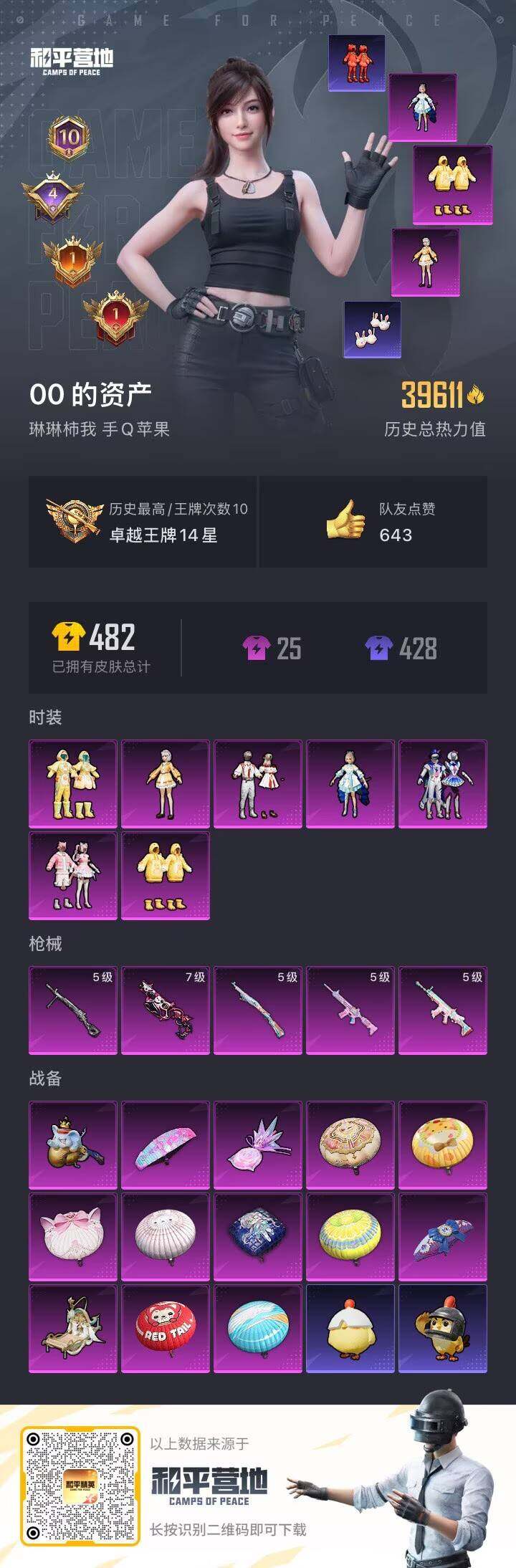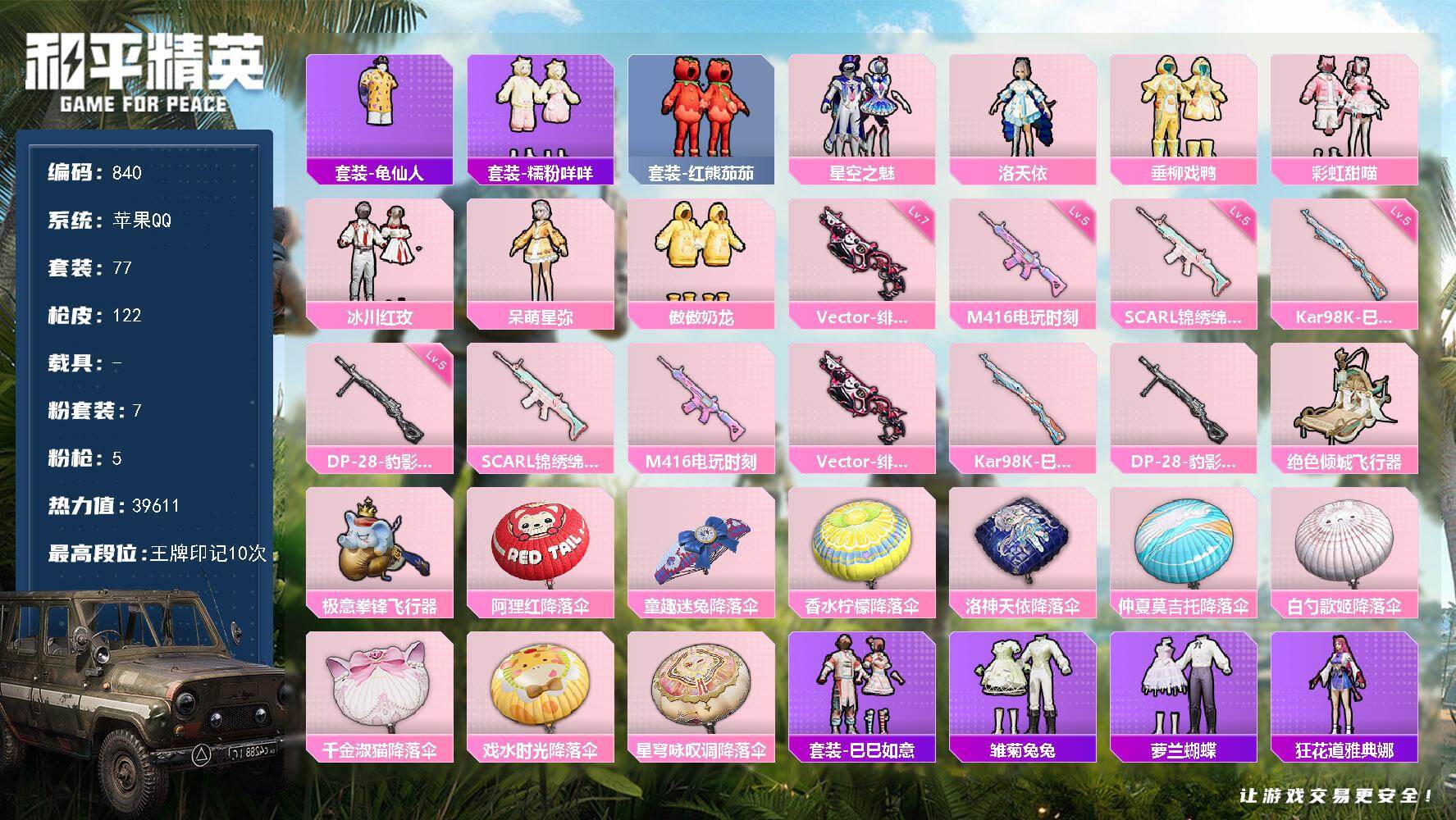 [15746067]苹果 手q-7粉装-5特效呛-0载具-3粉色飞行器-39611热力值-10王牌印记-77套装-122呛皮 【热门品类】:套装-龟仙人,套装-糯粉咩咩,套装-红熊茄茄 【粉色套装】:粉装-星空之魅,角色-洛天依,粉装-垂柳戏鸭,粉装-彩虹甜喵,粉装-冰川红玫,角色-呆萌星弥,粉装-傲傲奶龙 【粉色呛皮等级】:scar-l-锦绣绵绵五级,m416-电玩时刻五级,vect-绯穹魔姬七级,kar98k-巳巳如意五级,dp-28-豹影疾电五级 【粉色呛皮】:scar-l-锦绣绵绵,m416-电玩时刻,vect-绯穹魔姬,kar98k-巳巳如意,dp-28-豹影疾电 【粉色飞行器】:绝色倾城飞行器,极意拳锋飞行器 【粉色降落伞】:阿狸红降落伞,童趣迷兔降落伞,香水柠檬降落伞,洛神天依降落伞,仲夏莫吉托降落伞,白勺歌姬降落伞,千金淑猫降落伞,戏水时光降落伞,星穹咏叹调降落伞,炫彩糖果降落伞 【稀有套装】:套装-龟仙人,套装-巳巳如意,套装-雪国风尚,套装-雏菊兔兔,套装-萝兰蝴蝶,角色-狂花道·雅典娜,套装-燕燕于飞,套装-鱼渊荷华,角色-糖霜甜心,套装-朱霞炽焰,套装-凌霄紫焰,套装-炫彩糖果 【稀有呛皮】:aug-冰晶雪宝,akm-影袭,akm-破晓战魂,akm-霓虹街区,m416-糯团青竹,m416-红色方程式,groza-影袭,groza-晶梦幻蝶,aug-冰川粉黛,aug-耀粉歌者,m762-甜心宝贝,m762-萌物绒绒,mk47-洛神天依,g36c-星穹咏叹调,ac-val-快闪甜心,蜜獾-天降萌叽,arx-凌霄紫焰,uzi-啾咪啾咪,uzi-天降萌叽,uzi-影袭,ump45-繁龙极客,ump45-生命誓言,vect-焰鹰斗篷,vect-生命誓言,汤姆逊-幻影战神,js9-凌霄紫焰,p90-快闪甜心,p90-巳巳如意,kar98k-影袭,m24-影袭,awm-焰鹰斗篷,mini14-炫彩节奏,win94-晶梦幻蝶,mk20-h-快闪甜心,mk20-h-莲影清波,s1897-炫彩节奏,s12k-玩趣呆呆,dbs-焰鹰斗篷,dbs-圣堂之誓,m249-彩虹符号,dp-28-焰鹰斗篷,mg3-第五大道,pkm-蜜语绒猫,mg-36-凌霄紫焰,p92-凌霄紫焰,p1911-粉锦千层,蝎式手呛-千金淑猫,沙墨之鹦-快闪甜心,撬棍-戏水时光