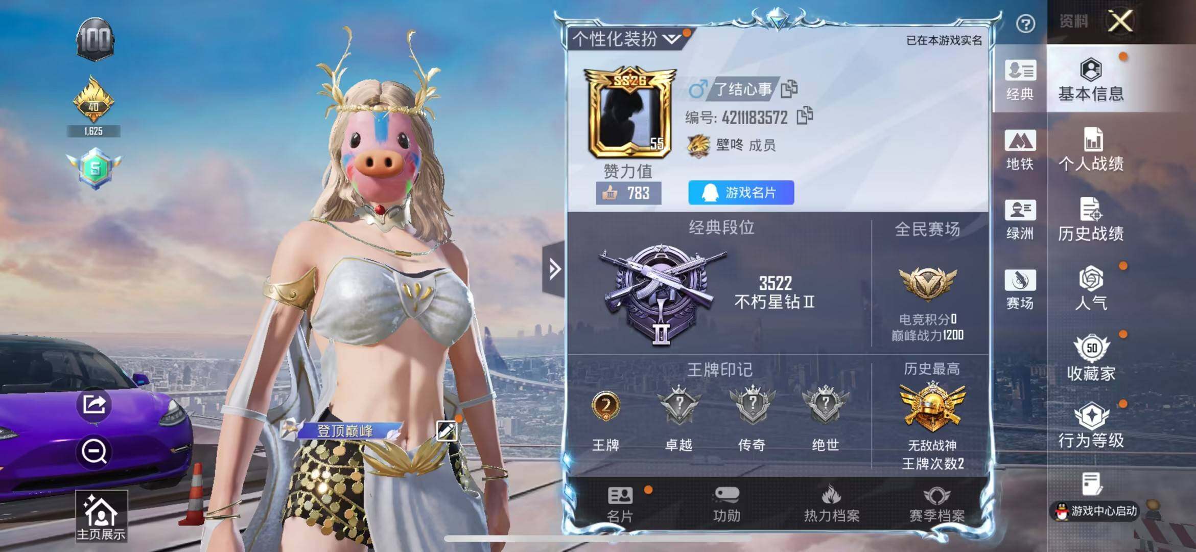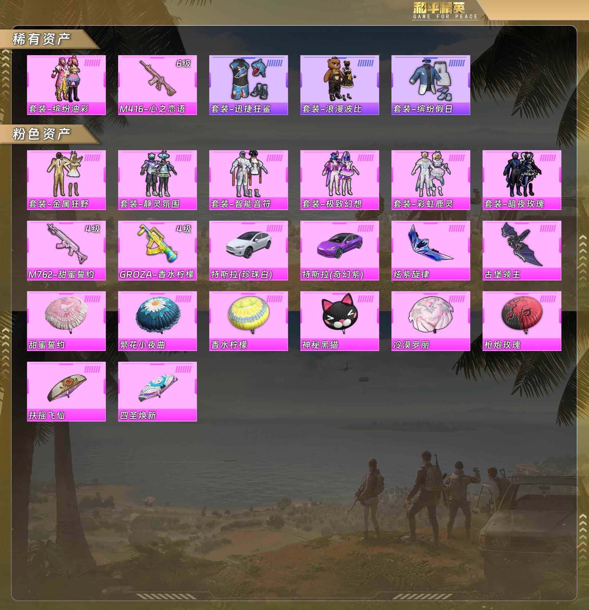 公主号/无敌战神框/猪妹/狂鲨/浪漫波比/缤纷假日/金属狂野/静灵氛围/智能音符/极致幻想/彩虹鹿灵/暗夜玫瑰/m416-心之恋语6级/m762-甜蜜誓约4级/groza-香水柠檬4级/特斯拉珍珠白 /特斯拉奇幻紫 (7粉装3粉呛2载具)hp5105-2粉色飞行器-40271热力值-2王牌印记-83套装-104呛皮 【热门品类】:粉装-缤纷油彩,套装-ss1特训,套装-浪漫波比 【粉色套装】:粉装-金属狂野,粉装-静灵氛围,粉装-智能音符,粉装-缤纷油彩,粉装-极致幻想,粉装-暗夜玫瑰,粉装-彩虹鹿灵 【粉色呛皮等级】:m416-心之恋语六级,groza-香水柠檬四级,m762-甜蜜誓约四级 【粉色载具】:特斯拉model 3(奇幻紫),特斯拉model x(珍珠白) 【粉色呛皮】:m416-心之恋语,groza-香水柠檬,m762-甜蜜誓约 【粉色飞行器】:炫紫旋律飞行器,古堡领主飞行器 【粉色降落伞】:神秘黑猫降落伞,繁花小夜曲降落伞,甜蜜誓约降落伞,四圣焕新降落伞,扶摇飞仙降落伞,香水柠檬降落伞,呛炮玫瑰降落伞,冷漠罗丽降落伞 【稀有套装】:套装-雪国风尚,套装-云朵鹅,套装-雪绒豹,角色-绛羽幽主 【稀有呛皮】:akm-四圣焕新,akm-生命誓言,akm-百万伏特,scar-l-扶摇飞仙,scar-l-炫彩节奏,scar-l-甜蜜誓约,scar-l-冷漠罗丽,m416-红色方程式,groza-林间仙鹿,groza-治愈之星,groza-生命誓言,groza-黑色刀锋,q-原初圣火,q-神秘黑猫,m762-牛气冲天,m762-瑞龙福将,m762-镭射皇者,m762-云朵鹅,g36c-不夜海上花,uzi-众神之王,uzi-金风玉露,ump45-海渊国主,ump45-生命誓言,ump45-诡娃娃,vect-治愈之星,vect-香水柠檬,vect-黑色刀锋,汤姆逊-勇闯险境,汤姆逊-天降萌叽,汤姆逊-林间仙鹿,野牛-机械英豪,mp5k-众神之王,mp5k-甜蜜誓约,kar98k-古堡领主,kar98k-彩虹符号,m24-治愈之星,m24-众神之王,awm-不夜海上花,sks-勇闯险境,vss-镭射皇者,mini14-原初圣火,mini14-林间仙鹿,mini14-炫彩节奏,mk14-治愈之星,win94-机械英豪,win94-瑞龙福将,slr-众神之王,slr-四圣焕新,qbu-不夜海上花,svd-云朵鹅,s1897-勇闯险境,s1897-镭射皇者,s1897-荧海星豚,s12k-瑞龙福将,s12k-破晓战魂,s12k-香水柠檬,s12k-机械英豪,s12k-极意拳锋,spas-12-云朵鹅,m249-四圣焕新,m249-彩虹符号,m249-星之彼岸,dp-28-原初圣火,dp-28-清新柠檬,mg3-幻世战舞者,mg3-瑞龙福将,p18c-原初圣火,沙墨之鹦-云朵鹅,大砍刀-云朵鹅 【其他套装】:套装-ss2特训,套装-ss8特训,套装-ss9特训,套装-ss10特训,套装-ss11特训,套装-ss12特训,套装-ss13特训,套装-ss14特训,套装-ss17特训,套装-ss18特训,套装-ss26特训,套装-人气偶像,套装-冷焰舞者,套装-北国孤狼,套装-夏日倾情,套装-幻影武者,套装-格斗先锋,套装-海上生明月,套装-海滨突袭者,套装-灿烂千阳,套装-牛气满满,套装-特战装甲,套装-王牌教练,套装-疯狂小兔子,套装-破蛋小黄鸡,套装-福星高照,套装-竞技名士,套装-缤纷假日,套装-耀眼新星,套装-耀粉歌者,套装-蓝彩潮人,套装-长空猛禽,套装-飞行日记,套装-魅力单车,套装-黑色伏地魔,套装-战地菁英,套装-极地朋克,套装-迅捷狂鲨,套装-风暴特警,套装-冰川特警,套装-浪漫波比,套装-迷域探索者,套装-云丝凤蟒,套装-清香五月粽,套装-众神之王,套装-智慧之神,套装-风华少年志,套装-罗小黑,套装-机械征服者,套装-暗夜契约,套装-纯白誓言,套装-原初圣火,套装-逆风勇士,套装-白虎圣者,套装-朱雀圣者,套装-童话森林,套装-神秘舞者,套装-丝绸行者,套装-蓝甜马卡龙,套装-银白舞王,套装-治愈之星,套装-科技之星,套装-快乐星愿,套装-瑞龙福将,套装-团圆交子 【稀有头盔】:百万伏特头盔3级,金风玉露头盔3级,金风玉露头盔1级,甜蜜誓约头盔3级,甜蜜誓约头盔2级,甜蜜誓约头盔1级,心之恋语头盔3级,心之恋语头盔2级,心之恋语头盔1级,马卡龙头盔3级 【稀有背包】:甜心宝贝背包2级,百万伏特背包1级,金风玉露背包3级,金风玉露背包2级,金属狂野镶钻背包3级,金属狂野镶钻背包2级,金属狂野镶钻背包1级,智能音符智慧背包3级,智能音符智慧背包2级,智能音符智慧背包1级,缤纷油彩趣味背包3级,缤纷油彩趣味背包2级,缤纷油彩趣味背包1级,深海曼妙背包1级,甜蜜誓约背包3级,甜蜜誓约背包2级,甜蜜誓约背包1级 【营地id】:783776972
