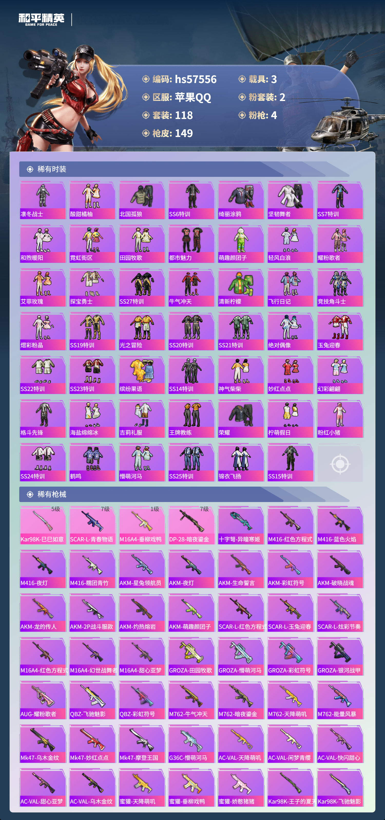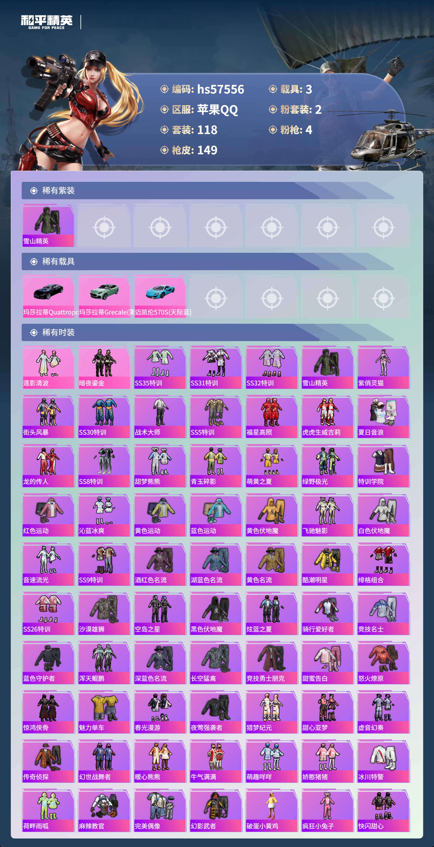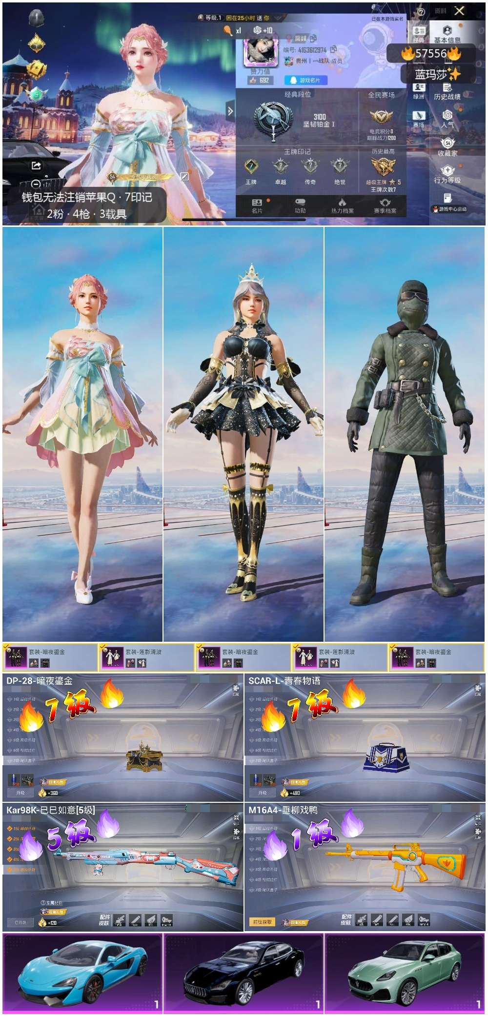 hs57556 苹果手q-7王牌印记-2粉装-4特效呛-3载具-48232热力值-118套装-149呛皮【2粉装】套装-暗夜鎏金套装-莲影清波【4特效呛】dp-28-暗夜鎏金/7级kar98k-巳巳如意/5级m16a4-垂柳戏鸭/1级scar-l-青春物语/7级【1稀有紫装】雪山精英【3稀有载具】玛莎拉蒂quattropte夜幕蓝玛莎拉蒂grecale薄荷绿迈凯伦