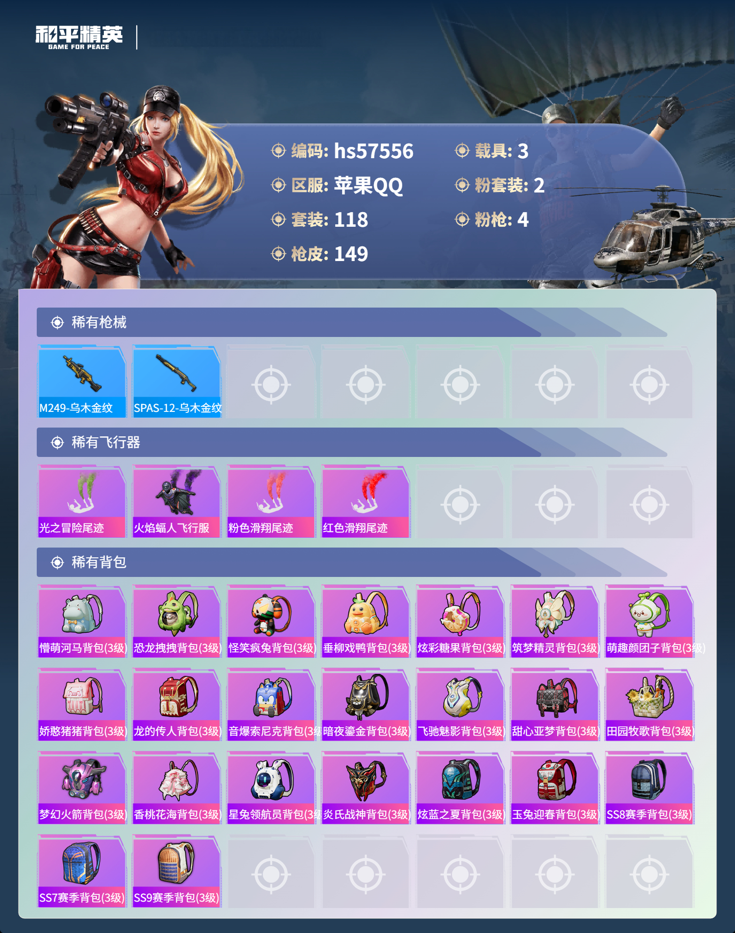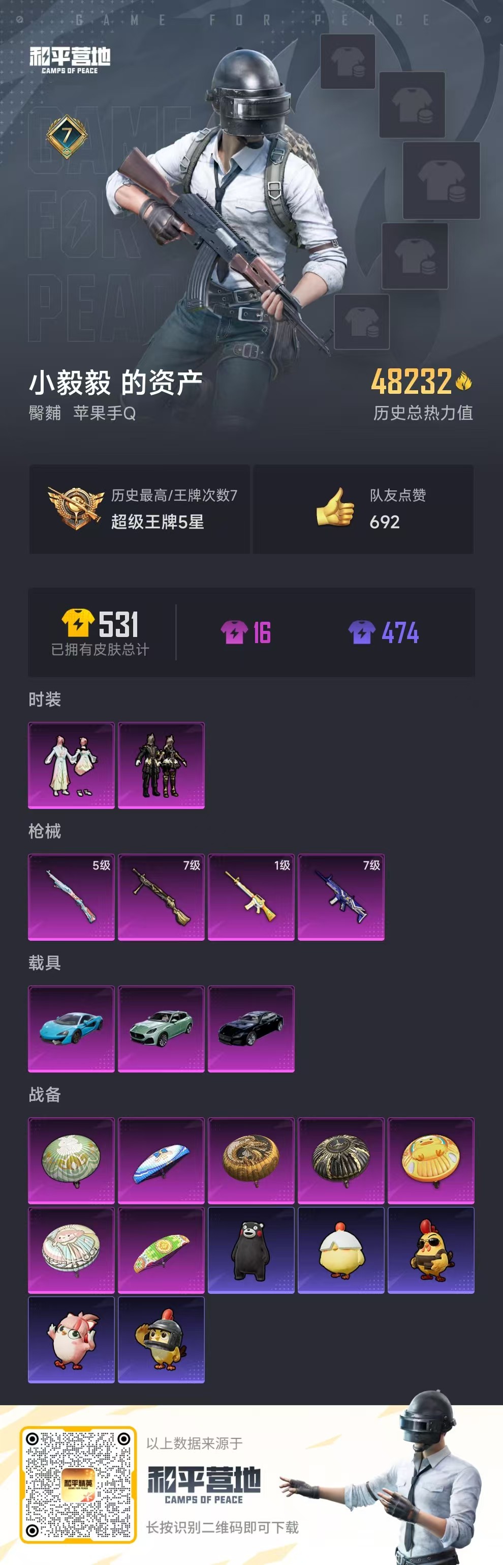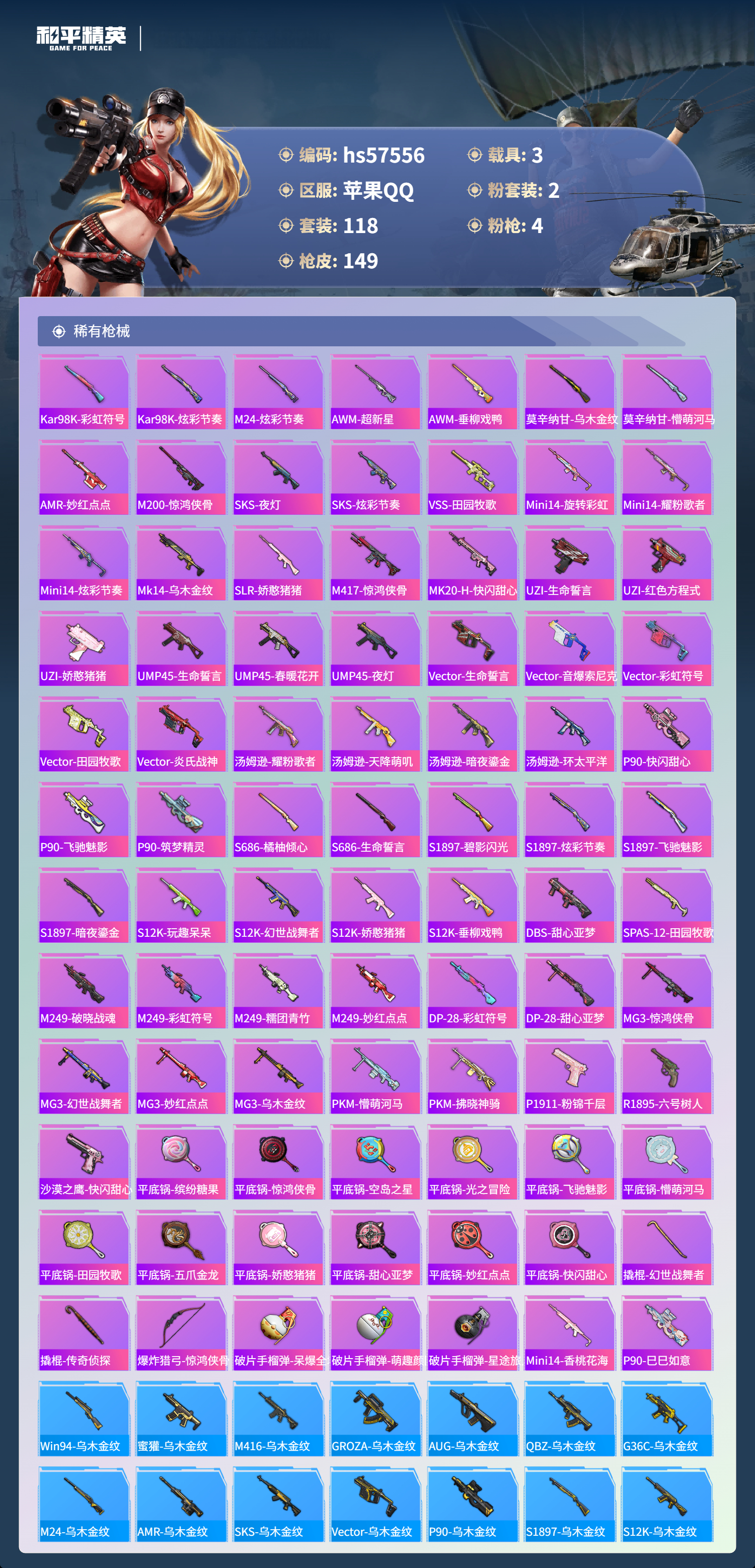 hs57556 苹果手q-7王牌印记-2粉装-4特效呛-3载具-48232热力值-118套装-149呛皮【2粉装】套装-暗夜鎏金套装-莲影清波【4特效呛】dp-28-暗夜鎏金/7级kar98k-巳巳如意/5级m16a4-垂柳戏鸭/1级scar-l-青春物语/7级【1稀有紫装】雪山精英【3稀有载具】玛莎拉蒂quattropte夜幕蓝玛莎拉蒂grecale薄荷绿迈凯伦